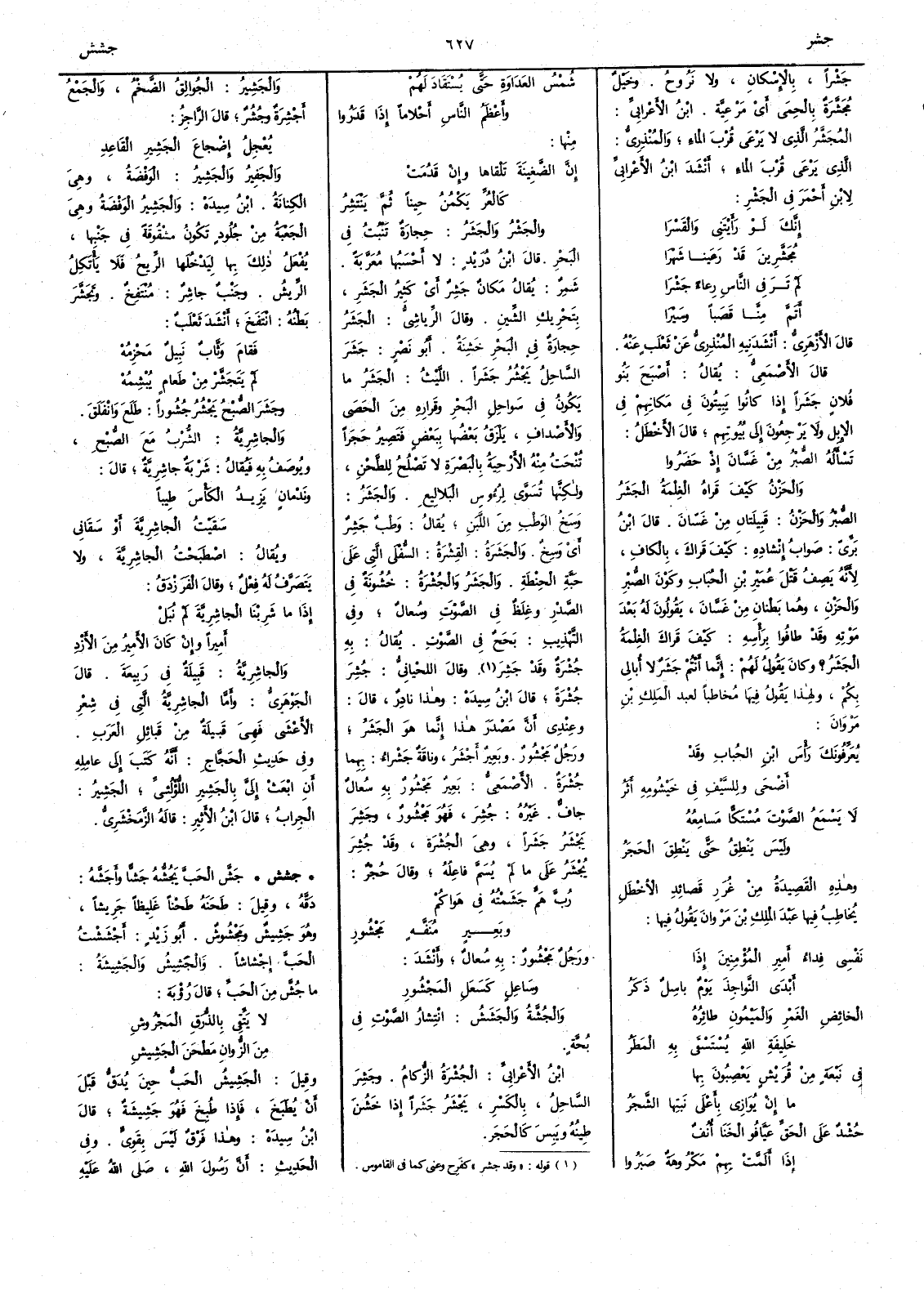 جَشْراً بالإِسكان ولا نَرُوحُ وخيل مُجَشَّرةٌ بالحِمَى أَي مَرْعِيَّة ابن الأَعرابي المُجَشَّرُ الذي لا يرعى قُرْبَ الماء والمنذري الذي يرعى قرب الماء أَنشد ابن الأَعرابي لابن أَحمر في الجَشْرِ إِنَّكَ لو رأَيتَني والقَسْرَا مُجَشِّرِينَ قد رَعَينا شَهْرَا لم تَرَ في الناسِ رِعاءً جَشْرَا أَتَمَّ مِنَّا قَصَباً وسَيْرَا قال الأَزهري أَنشدنيه المنذري عن ثعلب عنه قال الأَصمعي يقال أَصبح بنو فلان جَشَراً إِذا كانوا يبيتون في مكانهم في الإِبل ولا يرجعون إِلى بيوتهم قال الأَخطل تَسْأَلُه الصُّبْرُ من غَسَّانَ إِذْ حَضَرُوا والحَزْنُ كَيْفَ قَراهُ الغِلْمَةُ الجَشَرُ الصُّبْرُ والحَزْنُ قبيلتان من غسان قال ابن بري صواب إِنشاده كيف قراك بالكاف لأَنه يصف قتل عمير بن الحُبَابِ وكَوْنَ الصُّبْر والحَزْنِ وهما بطنان من غسان يقولون له بعد موته وقد طافوا برأْسه كيف قَراك الغِلْمَةُ الجَشَرُ ؟ وكان يقول لهم إِنما أَنتم جَشَرٌ لا أُبالي بكم ولهذا يقول فيها مخاطباً لعبد الملك بن مروان يُعَرِّفُونَكَ رَأْسَ ابنِ الحُبابِ وقد أَضْحَى وللسَّيْفِ في خَيْشُومِهِ أَثَرُ لا يَسْمَعُ الصَّوْتَ مُسْتَكّاً مسامِعُه وليس يَنْطِقُ حتى يَنْطِقَ الحَجَرُ وهذه القصيدة من غُرَرِ قصائد الأَخطل يخاطب فيها عَبْدَ الملِك بْنَ مَرْوان يقول فيها نَفْسِي فِداءُ أَمِيرِ المُؤْمِنِينَ إِذا أَبْدَى النَّواجِذَ يَوْمٌ باسِلٌ ذَكَرُ الخائِضِ الغَمْرِ والمَيْمُونِ طائِرُهُ خَلِيفَةِ اللهِ يُسْتَسْقَى بِهِ المَطَرُ في نَبْعَةٍ مِن قُرَيشٍ يَعْصِبُونَ بها ما إِنْ يُوازى بأَعْلَى نَبتِها الشَّجَرُ حُشْدٌ على الحق عَيَّافو الخَنَا أُنُفٌ إِذا أَلَمَّتْ بِهِمْ مَكْرُوهَةٌ صَبَرُوا شُمْسُ العَداوَةِ حتى يُسْتَقَادَ لهم وأَعظمُ الناسِ أَحْلاماً إِذا قَدَرُوا منها إِنَّ الضَّغِينَةَ تَلْقَاها وإِن قَدُمَتْ كالعُرِّ يَكْمُنُ حِيناً ثم يَنْتَشِرُ والجَشْرُ والجَشَرُ حِجَارَةٌ تنبت في البحر قال ابن دريد لا أَحسبها معرّبة شمر يقال مكان جَشِر أَي كثير الجَشَر بتحريك الشين وقال الرِّياشي الجَشَرُ حجارة في البحر خشنة أَبو نصر جَشَرَ الساحلُ يَجْشُرُ جشراً الليث الجَشَرُ ما يكون في سواحل البحر وقراره من الحصى والأَصداف يَلْزَقُ بعضها ببعض فتصير حجراً تنحت منه الأَرْحِيَةُ بالبصرة لا تصلح للطحن ولكنها تُسَوَّى لرؤوس البلاليع والجَشَرُ وَسَخُ الوَطْبِ من اللبن يقال وَطْبٌ جَشِرٌ أَي وَسِخٌ والجَشَرَةُ القِشْرَةُ السفلى التي على حَبَّةِ الحنطة والجَشَرُ والجُشْرَةُ خُشُونة في الصدر وغِلَظٌ في الصوت وسُعال وفي التهذيب بَحَحٌ في الصوت يقال به جُشْرَةٌ وقد جَشِرَ