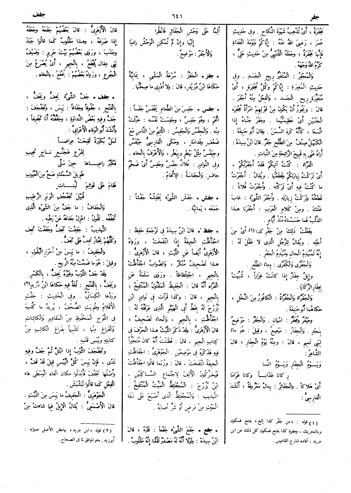( * قوله « من جفر كذا إلخ » بفتح فسكون وبالتحريك وجفرة كذا بفتح فسكون كل ذلك عن ابن دريد أفاده شارح القاموس ) أَي من أَجله ويقال للرجل الذي لا عقل له إِنه لَمُنْهَدِمُ الحال ومُنْهَدِمُ الجَفْرِ والجُفُرَّى والكُفُرَّى وِعاء الطلع وإِبِلٌ جِفَارٌ إِذا كانت غِزاراً شبهت بِجِفَارِ الرَّكابا والجُفُرَّاء والجُفُرَّاةُ الكافور من النخل حكاهما أَبو حنيفة وجَيْفَرٌ ومُجَفَّر اسمان والجَفْرُ موضع بنجد والجِفَارُ موضع وقيل هو ماء لبني تميم قال ومنه يوم الجِفَارِ قال الشاعر وَيَوْمُ الجِفَارِ وَيَوْمُ النِّسا رِ كانا عَذَاباً وكانا غَرَامَا أَي هلاكاً والجَفَائِرُ رمال معروفة أَنشد الفارسي أَلِمَّا على وَحْشِ الجَفَائِر فانْظُرا إِليها وإِنْ لم تُمْكِنِ الوَحْشُ رامِيَا والأَجْفَرُ موضع