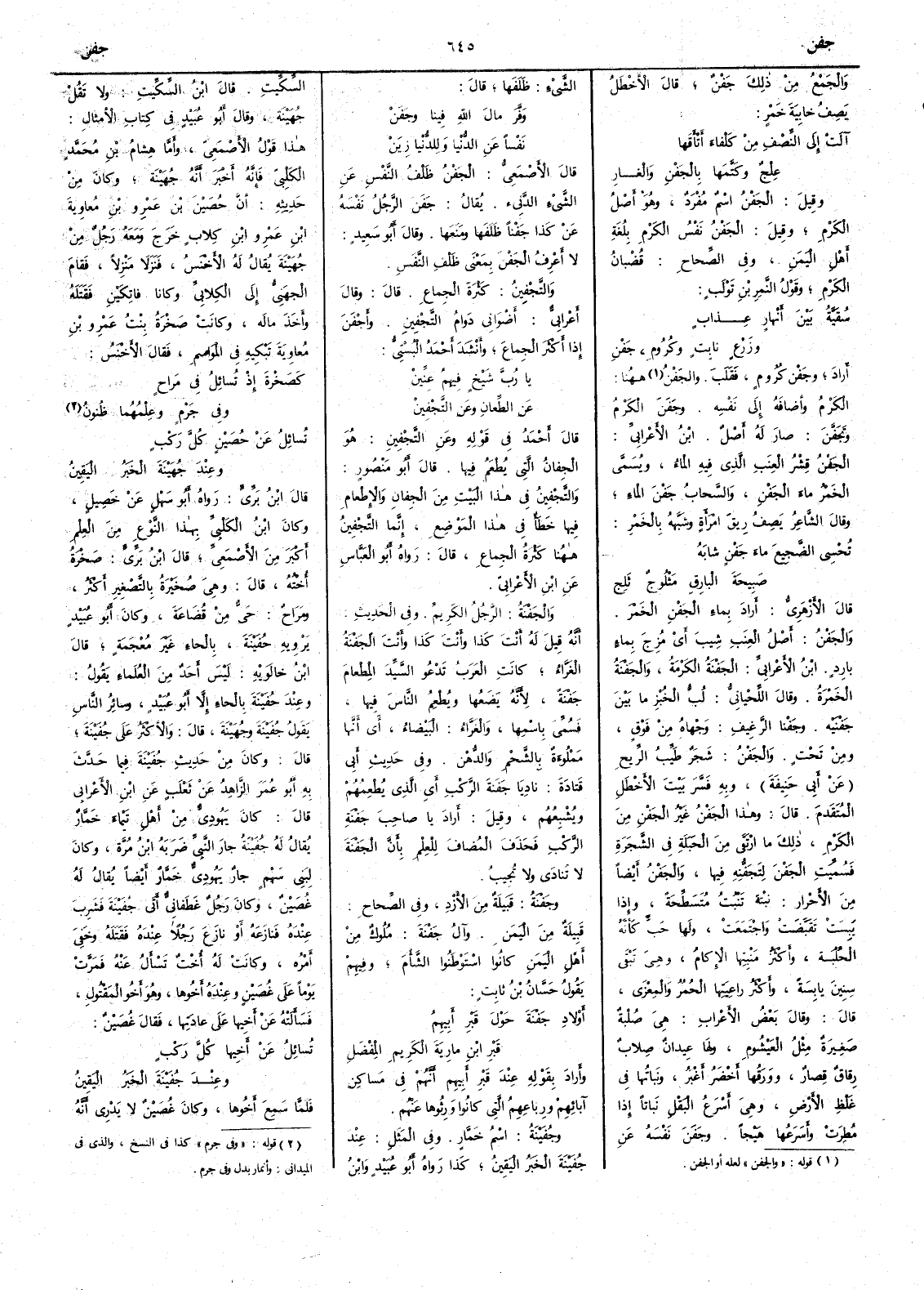 ( * قوله « والجفن » لعله أو الجفن ) ههنا الكَرْمُ وأَضافه إلى نفسه وجَفن الكرمُ وتَجَفَّن صار له أَصلٌ ابن الأَعرابي الجَفْنُ قِشْرُ العنب الذي فيه الماء ويسمى الخمر ماءَ الجَفْنِ والسحابُ جَفْنَ الماء وقال الشاعر يصف ريقَ امرأَةٍ وشبَّهه بالخمر تُحْسي الضجيعَ ماءَ جفْنٍ شابَه صَبيحةَ البارِقِ مَثْلوج ثَلِج قال الأَزهري أَراد بماء الجَفْنِ الخمرَ والجَفْنُ أَصلُ العنبِ شيبَ أَي مُزِجَ بماءٍ باردٍ ابن الأَعرابي الجَفْنةُ الكَرْمة والجَفْنةُ الخمرةُ وقال اللحياني لُبُّ الخُبْزِ ما بين جَفْنَيه وجَفْنا الرغيفِ وَجْهاه من فوق ومن تحت والجَفْنُ شجرٌ طَيِّبُ الريح عن أَبي حنيفة وبه فسر بيت الأَخطل المتقدم قال وهذا الجَفْنُ غير الجَفْنِ من الكَرْمِ ذلك ما ارْتَقى من الحَبَلة في الشجرة فسُمِّيت الجَفْنَ لتجفُّنِه فيها والجَفْنُ أَيضاً من الأَحرارِ نبْتةٌ تَنْبُتُ مُتَسَطَّحة وإذا يَبِسَتْ تقبَّضَت واجتمعت ولها حبٌّ كأَنه الحُلْبَة وأَكثر مَنْبِتها الإكامُ وهي تبقى سِنين يابسة وأَكثرُ راعيتِها الحُمُر والمِعْزَى قال وقال بعض الأَعراب هي صُلْبة صغيرة مثل العَيْشوم ولها عِيدانٌ صِلابٌ رِقاقٌ قِصار وورقُها أَخضر أَغْبَرُ ونَباتُها في غَلْظِ الأَرض وهي أَسْرَعُ البَقْلِ نباتاً إذا مُطِرَتْ وأَسرعُها هَيْجاً وجَفَنَ نفسَه عن الشيء ظَلَفَها قال وَفَّرَ مالَ اللهِ فينا وجَفَنْ نفْساً عن الدُّنيا وللدنيا زِيَنْ قال الأَصمعي الجَفْنُ ظَلْفُ النفس عن الشيء الدنيء يقال جَفَنَ الرجلُ نفسَه عن كذا جَفْناً ظَلَفَها ومَنَعَها وقال أَبو سعيد لا أَعرف الجَفْنَ بمعنى ظَلْفِ النفس والتَّجْفينُ كثرةُ الجماع قال وقال أَعرابي أَضْواني دوامُ التجفينِ وأَجْفَنَ إذا أَكْثَر الجماعَ وأَنشد أَحمد البُسْتيّ يا رُبَّ شَيخ فيهم عِنِّينْ عن الطِّعانِ وعن التَّجفينْ قال أَحمد في قوله وعن التَّجْفين هو الجِفانُ التي يطعم فيها قال أَبو منصور والتَّجْفين في هذا البيت من الجِفانِ والإطعام فيها خطأٌ في هذ الموضع إنما التَّجفينُ ههنا كثرةُ الجماع قال رواه أَبو العباس عن ابن الأَعرابي والجَفْنةُ الرجلُ الكريم وفي الحديث أَنه قيل له أَنت كذا وأَنتَ كذا وأَنت الجَفْنَةُ الغَرّاء كانت العربُ تدعو السيدَ المِطْعامَ جَفْنةً لأَنه يضَعُها ويُطْعِم الناسَ فيها فسُمِّيَ باسمها والغَرّاء البيضاء أَي أَنها مَمْلُوءةٌ بالشحم والدُّهْن وفي حديث أَبي قتادة نادِيا جَفْنَةَ الرَّكْبِ أَي الذي يُطْعِمُهم ويُشْبِعُهم وقيل أَراد يا صاحِبَ جَفْنةِ الرَّكْبِ فحذف المضافَ للعِلْم بأَن الجَفْنةَ لا تُنادى ولا تُجيبُ وجَفْنةُ قبيلةٌ من الأَزْد وفي الصحاح قبيلةٌ من اليمن وآلُ جَفْنةَ مُلوكٌ من أَهل اليمن كانوا اسْتَوْطَنُوا الشأْم وفيهم يقول حَسَّن بن ثابت أَوْلادِ جَفْنةَ حولَ قبْرِ أَبِيهمُ قَبْر ابن مارِيةَ الكَريمِ المِفْضَل وأَراد بقوله عند قبر أَبيهم أَنهم في مساكن آبائهم ورِباعِهم التي كانوا ورِثُوها عنهم وجُفَيْنةُ اسمُ خَمَّارٍ وفي المثل عند جُفَيْنةَ الخبرُ اليقين كذا رواه أَبو عبيد وابن السكيت قال ابن السكيت ولا تقُل جُهَيْنة وقال أَبو عبيد في كتاب الأَمثال هذا قول الأَصمعي وأَما هشام ابن محمد الكلبي فإِنه أَخبر أَنه جُهَيْنة وكان من حديثه أَن حُصَيْنَ بنَ عمرو بنِ مُعاوية بن عمرو ابن كلاب خرج ومعه رجلٌ من جُهَيْنةَ يقال له الأَخْنَسُ فنزَلا منزلاً فقام الجُهَنِيُّ إلى الكلابيِّ وكانا فاتِكَيْنِ فقَتله وأَخذ مالَه وكانت صخرةُ بنتُ عمرِو بنِ معاوية تَبْكِيه في المَواسِم فقال الأَخْنس كصَخْرةَ إذ تُسائل في مراح وفي جَرْمٍ وعِلْمُهما ظُنونُ