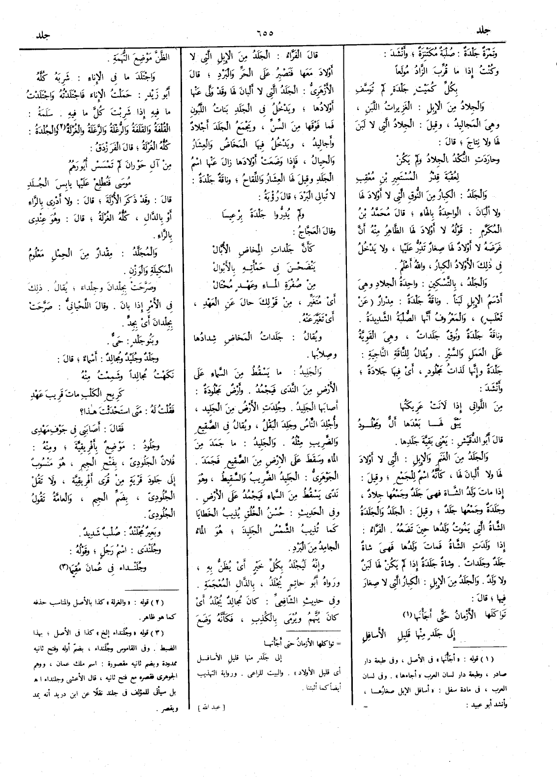 وتمرة جَلْدَة صُلْبة مكتنزة وأَنشد وكنتُ إِذا ما قُرِّب الزادُ مولَعاً بكلّ كُمَيْتٍ جَلْدَةٍ لم تُوَسَّفِ والجِلادُ من الإِبِلِ الغزيرات اللبن وهي المَجاليد وقيل الجِلادُ التي لا لبن لها ولا نِتاح قال وحارَدَتِ النُّكْدُ الجِلادُ ولم يكنْ لِعُقْبَةَ قِدْرُ المسْتَعير بن مُعْقِب والجَلَد الكبار من النوق التي لا أَولاد لها ولا أَلبان الواحدة بالهاءِ قال محمد بن المكرم قوله لا أَولاد لها الظاهر منه أَن غرضه لا أَولاد لها صغار تدر عليها ولا يدخل في ذلك الأَولاد الكبار والله أَعلم والجَلْد بالتسكين واحدة الجِلاد وهي أَدسم الإِبل لبناً وناقة جَلْدة مِدْرار عن ثعلب والمعروف أَنها الصلبة الشديدة وناقة جَلْدة ونوق جَلَدات وهي القوية على العمل والسير ويقال للناقة الناجية جَلْدَة وإِنها لذات مَجْلود أَي فيها جَلادَة وأَنشد من اللواتي إِذا لانَتْ عريكَتُها يَبْقى لها بعدَها أَلٌّ ومَجْلود قال أَبو الدقيش يعني بقية جلدها والجَلَد من الغنم والإِبِل التي لا أَولاد لها ولا أَلبان لها كأَنه اسم للجمع وقيل إِذا مات ولد الشاة فهي جَلَدٌ وجمعها جِلاد وجَلَدَة وجمعها جَلَد وقيل الجَلَدُ والجلَدة الشاة التي يموت ولدها حين تضعه الفراء إِذا ولدت الشاة فمات ولدها فهي شاة جَلَد ويقال لها أَيضاً جَلَدَة وجمع جَلَدَة جَلَد وجَلَدات وشاة جَلَدة إِذا لم يكن لها لبن ولا ولد والجَلَد من الإِبل الكبار التي لا صغار فيها قال تَواكَلَها الأَزْمانُ حتى أَجاءَها إِلى جَلَدٍ منها قليلِ الأَسافِل قال الفراء الجَلَدُ من الإِبل التي لا أَولاد معها فتصبر على الحر والبرد قال الأَزهري الجَلَد التي لا أَلبان لها وقد ولى عنها أَولادها ويدخل في الجَلَدِ بنات اللبون فما فوقها من السن ويجمع الجَلَدَ أَجْلادٌ وأَجاليدُ ويدخل فيها المخاض والعشار والحيال فإِذا وضعت أَولادها زال عنها اسم الجَلَدِ وقيل لها العشار واللقاح وناقة جَلْدة لا تُبالي البرد قال رؤبة ولم يُدِرُّوا جَلْدَةً بِرْعِيسا وقال العجاج كأَنَّ جَلْداتِ المِخاضِ الأُبَّال يَنْضَحْنَ في حَمْأَتِهِ بالأَبوال من صفرة الماءِ وعهد محتال أَي متغير من قولك حال عن العهد أَي تغير عنه ويقال جَلَدات المخاض شدادها وصلابها والجَليد ما يسقط من السماءِ على الأَرض من الندى فيجمد وأَرض مَجْلُودة أَصابها الجليد وجُلِدَتِ الأَرضُ من الجَلِيد وأُجْلِد الناسُ وجَلِدَ البَقْلُ ويقال في الصّقِيعَ والضَّريب مِثْله والجليد ما جَمَد من الماء وسقط على الأَرض من الصقيع فجمد الجوهري الجليد الضَّريب والسَّقيطُ وهو ندى يسقط من السماء فيَجْمُد على الأَرض وفي الحديث حُسْنُ الخُلُق يُذيبُ الخطايا كما تُذيبُ الشمس الجليدَ هو الماء الجامد من البرد وإِنه ليُجْلَدُ بكل خير أَي يُظَن به ورواه أَبو حاتم يُجْلَذُ بالذال المعجمة وفي حديث الشافعي كان مُجالد يُجْلَد أَي كان يتهم ويرمى بالكذب فكأَنه وضع الظن موضع التهمة واجْتَلَد ما في الإِناء شربه كله أَبو زيد حملت الإِناء فاجتلدته واجْتَلَدْتُ ما فيه إِذا شربت كل ما فيه سلمة القُلْفَة والقَلَفَة والرُّغْلَة والرَّغَلَة والغُرْلَة