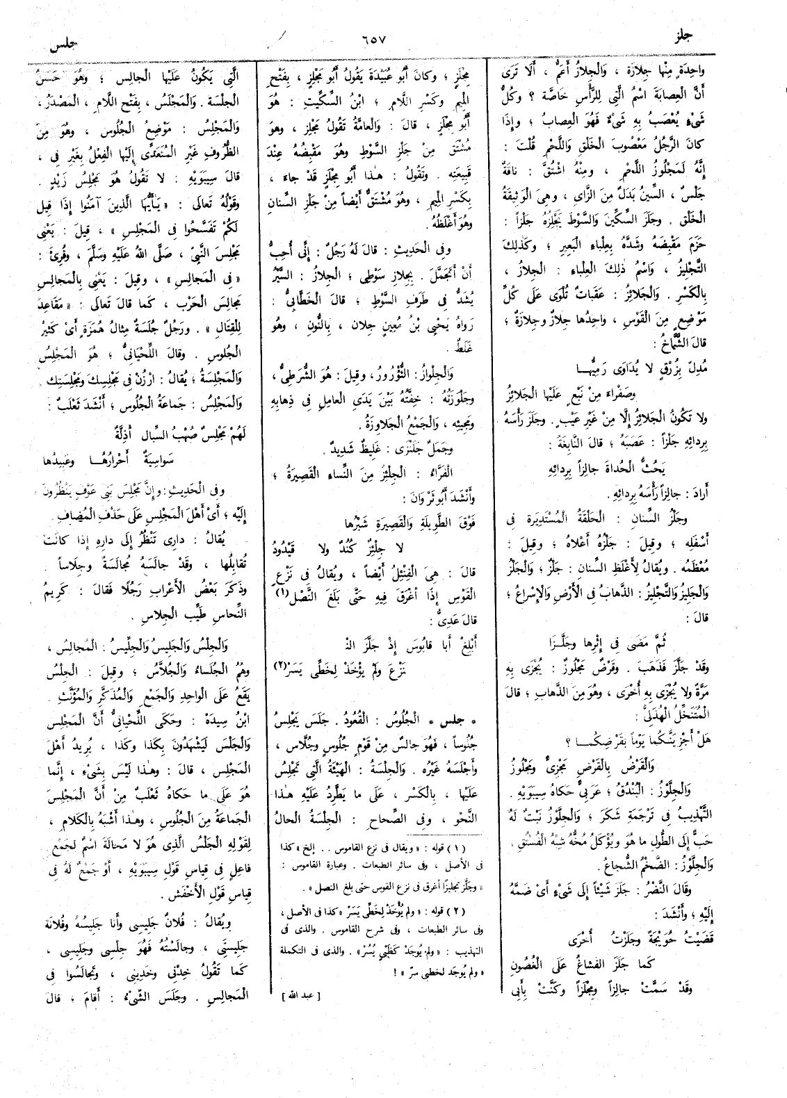 ( جلس ) الجُلُوسُ القُعود جَلَسَ يَجْلِسُ جُلوساً فهو جالس من قوم جُلُوسٍ وجُلاَّس وأَجْلَسَه غيره والجِلْسَةُ الهيئة التي تَجْلِسُ عليها بالكسر على ما يطرد عليه هذا النحو وفي الصحاح الجِلْسَةُ الحال التي يكون عليها الجالس وهو حَسَنُ الجِلْسَة والمَجْلَسُ بفتح اللام المصدر والمَجلِس موضع الجُلُوس وهو من الظروف غير المُتَعَدِّي إِليها الفعلُ بغير في قال سيبويه لا تقول هو مَجْلِسُ زيد وقوله تعالى يا أَيها الذين آمنوا إِذا قيل لكم تَفَسَّحوا في المَجْلِس قيل يعني به مَجْلِسَ النبي صلى اللَّه عليه وسلم وقرئَ في المجالس وقيل يعني بالمجالس مجالس الحرب كما قال تعالى مقاعد للقتال ورجل جُلَسَة مثال هُمَزَة أَي كثير الجُلوس وقال اللحياني هو المَجْلِسُ والمَجْلِسَةُ يقال ارْزُنْ في مَجْلِسِك ومَجْلِسَتِك والمَجْلِسُ جماعة الجُلُوس أَنشد ثعلب لهم مَجْلِسٌ صُهْبُ السِّبال أَذلَّةٌ سَواسِيَةٌ أَحْرارُها وعَبِيدُها وفي الحديث وإِن مَجْلِس بني عوف ينظرون إِليه أَي أَهل المجْلِس على حذُ المضاف يقال داري تنظر إِلى داره إذا كانت تقابلها وقد جالَسَه مُجالَسَةً وجِلاساً وذكر بعض الأَعراب رجلاً فقال كريمُ النِّحاسِ طَيِّبُ الجِلاسِ والجِلْسُ والجَلِيسُ والجِلِّيسُ المُجالِسُ وهم الجُلَساءُ والجُلاَّسُ وقيل الجِلْسُ يقع على الواحد والجمع والمذكر والمؤَنث ابن سيده وحكى اللحياني أََن المَجْلِسَ والجَلْسَ ليشهدون بكذا وكذا يريد أَهلَ المَجْلس قال وهذا ليس بشيء إِنما على ما حكاه ثعلب من أَن المَجْلِس الجماعة من الجُلُوس وهذا أَشبه بالكلام لقوله الجَلْس الذي هو لا محالة اسم لجمع فاعل في قياس قول سيبويه أَو جمع له في قياس قول الأَخفش ويقال فلان جَلِيسِي وأَنا جَلِيسُه وفلانة جَلِيسَتي وجالَسْتُه فهو جِلْسي وجَلِيسي كما تقول خِدْني وخَديني وتَجالَسُوا في المَجالِسِ وجَلَسَ الشيءُ أَقام قال