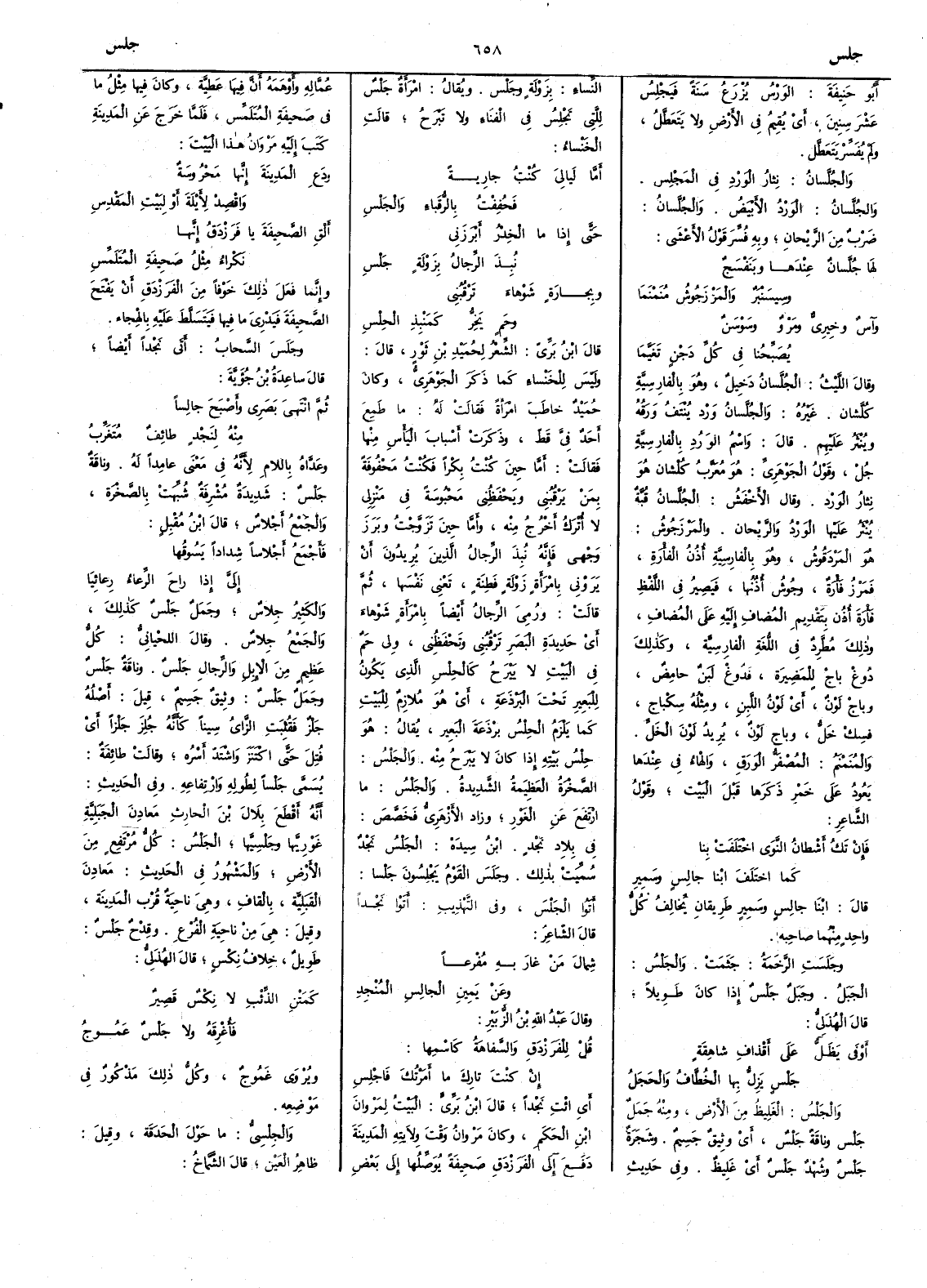 أَبو حنيفة الوَرْسُ يزرع سَنة فَيَجْلِسُ عَشْرَ سنين أَي يقيم في الأَرض ولا يتعطل ولم يفسر يتعطل والجُلَّسانُ نِثار الوَردِ في المَجْلِس والجُلَّسانُ الورد الأَبيض والجُلَّسانُ ضرب من الرَّيّحان وبه فسر قول الأَعشى لها جُلَّسانٌ عندها وبَنَفْسَجٌ وسِيْسَنْبَرٌ والمَرْزَجُوشُ مُنَمْنَما وآسٌ وخِيْرِيٌّ ومَروٌ وسَوْسَنٌ يُصَبِّحُنا في كلِّ دَجْنٍ تَغَيَّما وقال الليث الجُلَّسانُ دَخِيلٌ وهو بالفارسية كُلَّشان غيره والجُلَّسانُ ورد ينتف ورقه وينثر عليهم قال واسم الورد بالفارسية جُلْ وقول الجوهري هو معرب كُلْشان هو نثار الورد وقال الأَخفش الجُلَّسانُ قبة ينثر عليها الورد والريحان والمَرْزَجُوش هو المَردَقوش وهو بالفارسية أُذن الفأْرة فَمَرْزُ فأْرة وجوش أُذنها فيصير في اللفظ فأْرة أُذن بتقديم المضاف إِليه على المضاف وذلك مطرد في اللغة الفارسية وكذلك دُوغْ باجْ للمَضِيرَة فدوغ لبن حامض وباج لون أَي لون اللبن ومثله سِكْباج فسك خلّ وباج لون يريد لون الخل والمنمنم المصفرّ الورق والهاس في عندها يعود على خمر ذكرها قبل البيت وقول الشاعر فإِن تَكُ أَشْطانُ النَّوى اخْتَلَفَتْ بنا كما اختَلَفَ ابْنا جالِسٍ وسَمِيرِ قال ابنا جالس وسمير طريقان يخالف كل واحد منهما صاحبه وجَلَسَتِ الرَّخَمَةُ جَثَمَتْ والجَلْسُ الجبل وجَبَل جَلْسٌ إِذا كان طويلاً قال الهذلي أَوْفى يَظَلُّ على أَقْذافِ شاهِقَةٍ جَلْسٍ يَزِلُّ بها الخُطَّافُ والحَجَلُ والجَلْسُ الغليظ من الأَرض ومنه جمل جَلْسٌ وناقة جَلْسٌُّ أَي وثيقٌ جسيم وشجرة جَلْسٌ وشُهْدٌ أَي غليظ وفي حديث النساءِ بِزَوْلَةٍ وجَلْسِ ويقال امرأَة جَلْسٌ للتي تجلس في الفِناء ولا تبرح قالت الخَنْساء أَمّا لَياليَ كنتُ جارِيةً فَحُفِفْتُ بالرٍُّقَباء والجَلْسِ حتى إِذا ما الخِدْرُ أَبْرَزَني نُبِذَ الرِّجالُ بِزَوْلَةٍ جَلْسِ وبِجارَةٍ شَوْهاءَ تَرْقُبُني وهَمٍ يَخِرُّ كمَنْبَذِ الحِلْسِ قال ابن بري الشعر لحُمَيْدِ بنِ ثَوْرٍ قال وليس للخنساء كما ذكر الجوهري وكان حُمَيْدٌ خاطب امرأَة فقالت له ما طَمِعَ أَحدٌ فيّ قط وذكرت أَسبابَ اليَأْسِ منها فقالت أَما حين كنتُ بِكْراً فكنت محفوفة بمن يَرْقُبُني ويحفظني محبوسةً في منزلي لا أُتْرَكُ أَخْرُجُ منه وأَما حين تزوَّجت وبرز وجهي فإِنه نُبِذَ الرجالُ الذين يريدون أَن يروني بامرأَة زَوْلَةٍ فَطِنَةٍ تعني نفسها ثم قالت ورُمِيَ الرجالُ أَيضاً بامرأَة شوهاء أَي حديدة البصر ترقبني وتحفظني ولي حَمٌ في البيت لا يبرح كالحِلْسِ الذي يكون للبعير تحت البرذعة أَي هو ملازم للبيت كما يلزم الحِلْسُ برذعة البعير يقال هو حِلْسُ بيته إِذا كان لا يبرح منه والجَلْسُ الصخرة العظيمة الشديدة والجَلْسُ ما ارتفع عن الغَوْرِ وزاد الأَزهري فخصص في بلاد نَجْدٍ ابن سيده الجَلْسُ نَجْدٌ سميت بذلك وجَلَسَ القومُ يَجْلِسونَ جَلْساً أَتوا الجَلْسَ وفي التهذيب أَتوا نَجْداً قال الشاعر شِمالَ مَنْ غارَ بهِ مُفْرِعاً وعن يَمينِ الجالِسِ المُنْجدِ وقال عبد اللَّه بن الزبير قُلْ للفَرَزْدَقِ والسَّفاهَةُ كاسْمِها إِن كنتَ تارِكَ ما أَمَرْتُكَ فاجْلِسِ أَي ائْتِ نَجْداً قال ابن بري البيت لمَرْوان ابن الحَكَمِ وكان مروان وقت ولايته المدينة دفع إِلى الفرزدق صحيفة يوصلها إِلى بعض عماله وأَوهمه أَن فيها عطية وكان فيها مثل ما في صحيفة المتلمس فلما خرج عن المدينة كتب إِليه مروان هذا البيت ودَعِ المدينةَ إِنَّها مَحْرُوسَةٌ واقْصِدْ لأَيْلَةَ أَو لبيتِ المَقْدِسِ أَلْقِ الصحيفةَ يا فَرَزْدَقُ إِنها نَكْراءُ مِثلُ صَحِيفَةِ المُتَلَمِّسِ وإِنما فعل ذلك خوفاً من الفرزدق أَن يفتح الصحيفة فيدري ما فيها فيتسلط عليه بالهجاء وجَلَسَ السحابُ أَتى نَجْداً أَيضاً قال ساعِدَةُ بنُ جُؤَيَّة ثم انتهى بَصَري وأَصْبَحَ جالِساً منه لنَجْدٍ طائِفٌ مُتَغَرِّبُ وعداه باللام لأَنه في معنى عامداً له و