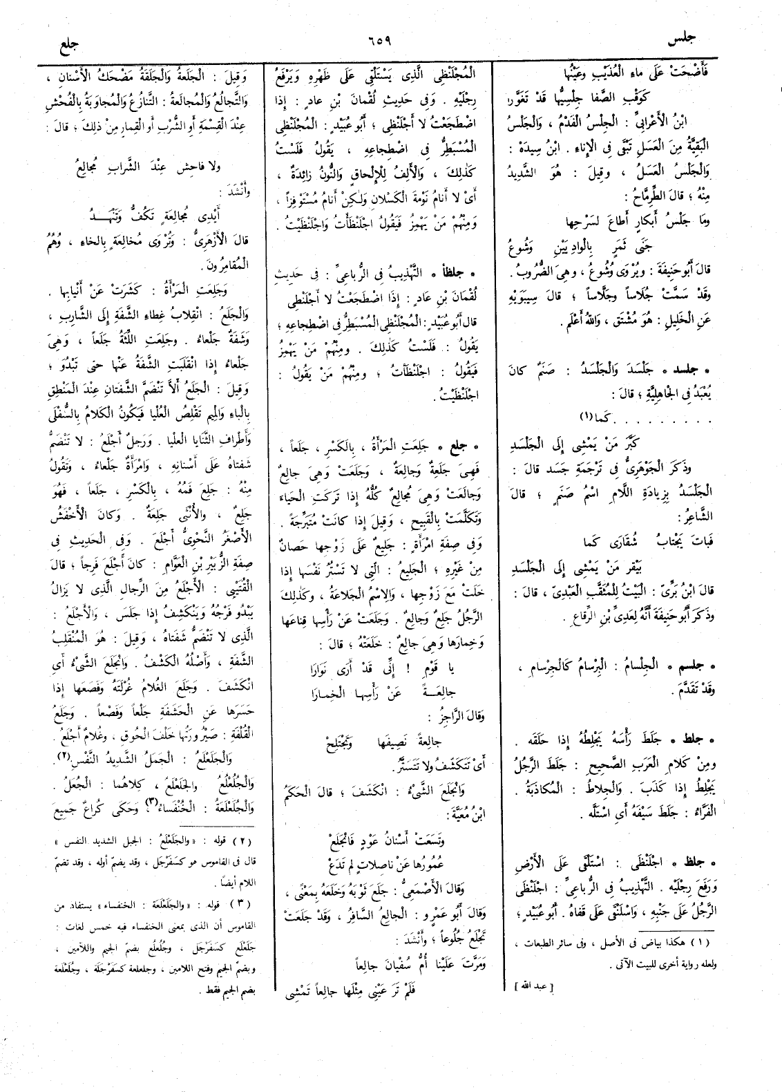 فأَضْحَتْ على ماءِ العُذَيْبِ وعَيْنُها كَوَقْبِ الصَّفا جِلْسِيُّها قد تَغَوَّرا ابن الأَعرابي الجِلْسُ الفَدْمُ والجَلْسُ البقية من العسل تبقى في الإِناء ابن سيده والجَلْسُ العسل وقيل هو الشديد منه قال الطِّرماح وما جَلْسُ أَبكارٍ أَطاعَ لسَرْحِها جَنى ثَمَرٍ بالوادِيَيْنِ وَشُوعُ قال أَبو حنيفة ويروى وُشُوعُ وهي الضُّرُوبُ وقد سمت جُلاساً وجَلاَّساً قال سيبويه عن الخليل هو مشتق واللَّه أَعلم