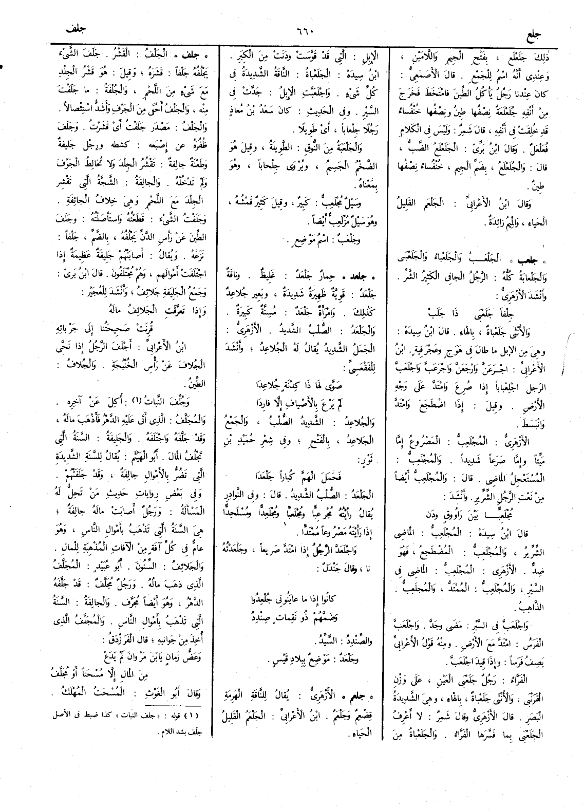 ( جلعد ) حمار جَلْعَدٌ غليظ وناقة جَلْعَد قوية ظهيرة شديدة وبعير جُلاعِد كذلك وامرأَة جَلْعد مسنة كبيرة والجَلْعَد الصلب الشديد الأَزهري الجمل الشديد يقال له الجُلاعد وأَنشد للفقعسي صَوَّى لها ذا كِدْنَةٍ جُلاعِدا لم يَرْعَ بالأَصيافِ إِلاَّ فارِدا والجُلاعِدُ الشديد الصلب والجمع الجَلاعِدُ بالفتح وفي شعر حميد بن ثور فحمل الهمَّ كباراً جَلْعَدا الجَلْعَدُ الصلب الشديد قال وفي النوادر يقال رأَيته مُجْرَعِبّاً ومُجْلَعِبَّاً ومُجْلَعِدَّاً ومُسْلَحِدَّاً إِذا رأَيته مصروعاً ممتدّاً واجْلَعَدَّ الرجل إِذا امتد صريعاً وجَلْعَدْته أَنا وقال جندل كانوا إِذا ما عاينوني جُلْعِدُوا وصَمَّهم ذُو نَقِمات صِنْدِدُ والصِّنْدِد السيد وجَلْعَد موضع ببلاد قيس