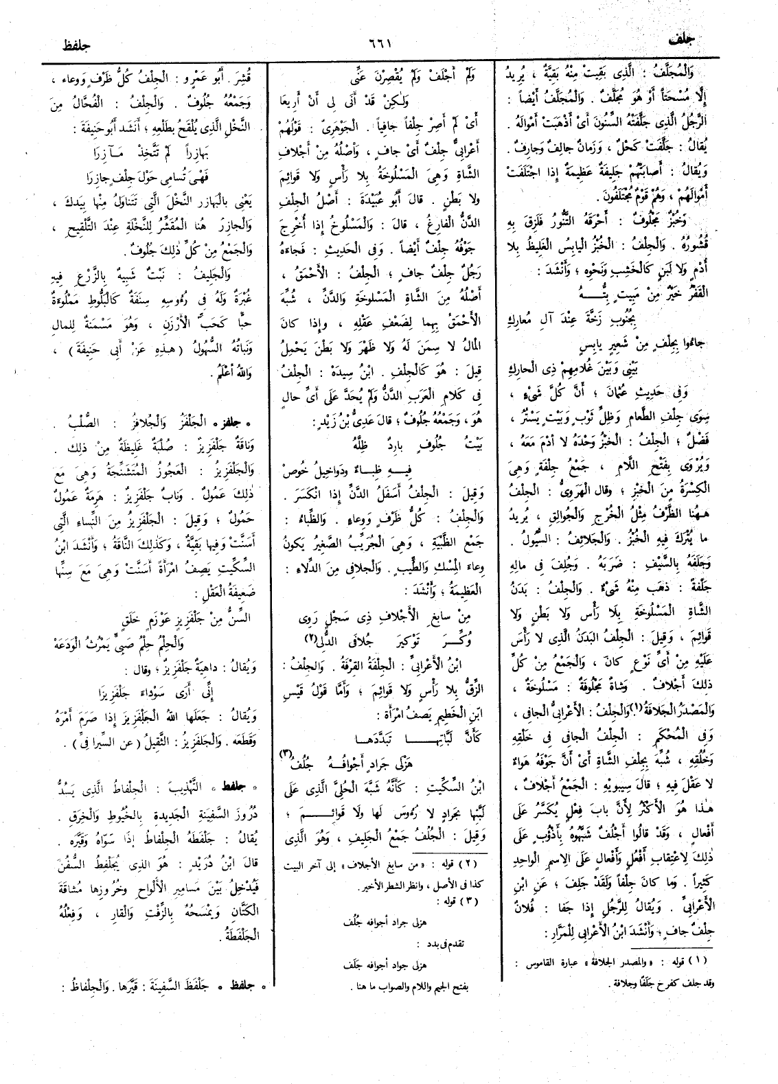 والمُجَلَّف الذي بقيت منه بقية يريد إلا مُسْحَتاً أَو هو مُجَلَّفٌ والمُجَلَّفُ أَيضاً الرجل الذي جَلَّفَتْه السِّنُونَ أَي أَذْهَبَتْ أَموالَه يقال جَلَّفَتْ كَحْلٌ وزمانٌ جالِفٌ وجارِفٌ ويقال أَصابَتْهم جَلِيفةٌ عظيمة إذا اجْتَلَفَتْ أَموالَهم وهم قوم مُجْتَلَفُون وخبز مَجْلُوفٌ أَحْرَقَه التَّنُّور فَلزِقَ به قُشوره والجِلْفُ الخبز اليابِسُ الغَلِيظُ بلا أُدْمٍ ولا لَبن كالخَشِبِ ونحوه وأَنشد القَفْرُ خَيْرٌ من مَبيتٍ بِتُّه بِجُنُوبِ زَخَّةَ عندَ آلِ مُعارِكِ جاؤُوا بِجِلْفٍ من شَعِيرٍ يابِسٍ بَيْني وبَيْنَ غُلامِهِمْ ذي الحارِكِ وفي حديث عثمان أَنَّ كل شيء سِوى جِلْفِ الطعام وظِلِّ ثَوْبٍ وبيتٍ يَسْتُر فَضْلٌ الجِلْفُ الخُبْزُ وحده لا أُدْمَ مَعه ويروى بفتح اللام جمع جِلْفةٍ وهي الكِسْرةُ من الخبز وقال الهروي الجِلْف ههنا الظَّرْفُ مثل الخُرْجِ والجُوالِق يريد ما يُتْرك فيه الخبز والجَلائِفُ السُّيولُ وجَلَفَه بالسيف ضرَبه وجُلِفَ في مالِه جَلْفةً ذهَب منه شيء والجِلْفُ بدن الشاةِ المَسْلُوخة بلا رأْس ولا بطن ولا قَوائِمَ وقيل الجِلْفُ البدن الذي لا رأْس عليه من أَي نَوْع كان والجمع من كل ذلك أَجْلافٌ وشاةٌ مَجْلُوفةٌ مَسْلوخةٌ والمصدر الجَلافةٌ والجِلْفُ الأَعرابي الجافي وفي المحكم الجِلْفُ الجافي في خَلْقِه وخُلُقِه شُبِّه بِجِلْفِ الشاةِ أَي أَنَّ جَوْفَه هَواء لا عَقْلَ فيه قال سيبويه الجمع أَجْلافٌ هذا هو الأَكثر لأَن باب فِعْل يكسَّر على أَفعال وقد قالوا أَجْلُفٌ شبَّهُوه بأَذْؤُبٍ على ذلك لاعْتِقاب أَفْعُلٍ وأَفْعالٍ على الاسم الواحد كثيراً وما كان جِلْفاً ولقد جَلِفَ عن ابن الأَعرابي ويقال للرجل إذا جَفا فلان جِلْفٌ جافٍ وأَنشد ابن الأَعرابي للمَرّار ولم أَجْلَفْ ولم يُقْصِرْنَ عَنِّي ولكِنْ قَدْ أَنَى لي أَنْ أَريعا أَي لم أَصِرْ جِلفاً جافِياً الجوهري قولهم أَعرابي جِلْفٌ أَي جافٍ وأَصله من أَجْلافِ الشاةِ وهي المسلوخة بلا رأْس ولا قَوائِمَ ولا بطن قال أَبو عبيدة أَصل الجِلْفِ الدَّنُّ الفارِغُ قال والمسلوخ إذا أُخْرِجَ جَوْفُه جِلْفٌ أَيضاً وفي الحديث فجاءه رجل جِلْفٌ جافٍ الجِلْفُ الأَحمق أَصله من الشاة المسلوخة والدَّنِّ شُبِّه الأَحمقُ بهما لضعف عقله وإذا كان المال لا سِمَنَ له ولا ظَهْر ولا بَطْنَ يَحْمِلُ قيل هو كالجِلْفِ ابن سيده الجِلْفُ في كلام العرب الدنُّ ولم يُحَدَّ على أَي حال هو وجمعه جُلُوف قال عدي بن زيد بَيْتُ جُلُوفٍ بارِدٌ ظِلُّه فيه ظِباءٌ ودواخِيلُ خُوصْ وقيل الجِلْفُ أَسْفَل الدَّنِّ إذا انكسر والجِلْفُ كلُّ ظَرفٍ ووِعاءٍ والظِّباءُ جمع الظِّبْيَةِ وهي الجُرَيِّبُ الصغِير يكون وِعاء المِسْك والطِّيبِ والجُلافى من الدِّلاء العظيمةُ وأَنشد مِنْ سابغِ الأَجْلافِ ذي سَجْلٍ رَوي وُكِّرَ تَوْكِيرَ جُلافى الدُّلي ابن الأَعرابي الجِلْفة القِرْفةُ والجِلْفُ الزِّقُّ بلا رأْس ولا قوائم وأَما قول قَيْس بن الخَطِيمِ يصف امرأَة كأَنَّ لَبّاتِها تَبَدَّدَها هَزْلى جَرادٍ أَجْوافُه جُلُف