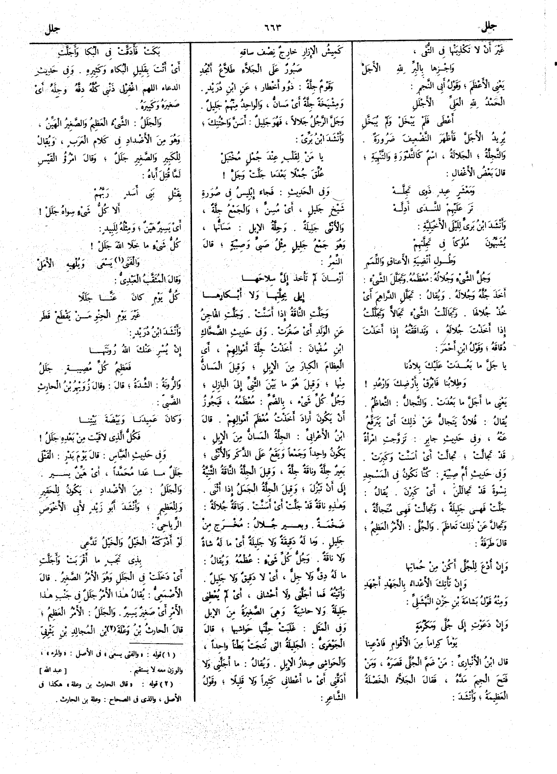 غَيْرَ أَن لا تَكْذِبَنْها في التقَى واجْزِها بالبِرِّ لله الأَجَلّ يعني الأَعظم وقول أَبي النجم الحمدُ الله العَلِيِّ الأَجْلل أَعْطى فلم يَبْخَل ولم يُبَخَّل يريد الأَجَلَّ فأَظهر التضعيف ضرورة والتَّجِلَّة الجَلالة اسم كالتَّدْوِرَة والتَّنِهيَة قال بعض الأَغْفال ومَعْشَرٍ غِيدٍ ذَوي تَجِلَّه تَرى عليهم للندى أَدِلَّه وأَنشد ابن بري لليلى الأَخْيَلية يُشَبَّهون مُلوكاً في تَجِلَّتِهم وطُولِ أَنْضِيَةِ الأَعْناقِ واللِّمَم وجُلُّ الشيءِ وجُلاله معظمه وتَجَلَّل الشيءَ أَخَذ جُلَّه وجُلاله ويقال تَجَلَّلِ الدراهمَ أَي خُذْ جُلالها وتَجَالَلْت الشيء تَجَالاً وتَجَلَّلت إِذا أَخذت جُلاله وتداققته إِذا أَخذت دُقاقه وقول ابن أَحمر يا جَلَّ ما بَعُدَتْ عليك بِلادُنا وطِلابُنا فابْرُقْ بأَرضك وارْعُدِ يعني ما أَجَلَّ ما بَعُدت والتَّجالُّ التعاظم يقال فلان يَتَجالُّ عن ذلك أَي يترفع عنه وفي حديث جابر تزوّجت امرأَة قد تَجالَّتْ تجالَّت أَي أَسَنَّت وكَبِرَتْ وفي حديث أُم صِبْيَة كنا نكون في المسجد نِسْوةً قد تَجالَلن أَي كَبِرْنَ يقال جَلَّتْ فهي جَلِيلة وتَجالَّتْ فهي مُتَجالَّة وتَجالَّ عن ذلك تَعاظم والجُلَّى الأَمر العظيم قال طَرَفة وإِنْ أُدْعَ للجُلَّى أَكُنْ من حُماتِها وإِن تَأْتِك الأَعداء بالجَهْد أَجْهَد ومنه قول بَشامة بن حَزْن النَّهْشَلي وإِنْ دَعَوْتُ إِلى جُلَّى ومَكْرُمَة يوماً كِراماً من الأَقْوامِ فادْعِينا قال ابن الأَنباري من ضَمَّ الجُلَّى قَصَرَه ومن فتح الجيم مدّه فقال الجَلاَّء الخصلة العظيمة وأَنشد كَمِيش الإِزارِ خارج نِصْفُ ساقِه صَبُور على الجَلاّءِ طَلاَّع أَنْجُد وقوم جِلَّة ذوو أَخطار عن ابن دريد ومِشْيَخة جِلَّة أَي مَسانٌّ والواحد منهم جَلِيل وجَلَّ الرجل جَلالاً فهو جَلِيل أَسَنَّ واحْتُنِك وأنشد ابن بري يا مَنْ لِقَلْبٍ عند جُمْلٍ مُخْتَبَلْ عُلِّق جُمْلاً بعدما جَلَّت وجَلٌّ وفي الحديث فجاء إِبليس في صورة شيخ جَلِيل أَي مُسنٍّ والجمع جِلَّة والأُنثى جَلِيلة وجِلَّة الإِبل مَسَانُّها وهو جمع جَلِيل مثل صَبيٍّ وصِبْية قال النمر أَزْمانَ لم تأْخذ إِليَّ سِلاحَها إِبِلي بجِلَّتِها ولا أَبْكارِها وجَلَّت الناقةُ إِذا أَسَنَّت وجَلَّتِ الهاجِنُ عن الولد أَي صغرت وفي حديث الضحاك بن سفيان أَخذت جِلَّة أَموالهم أَي العِظام الكِبار من الإِبل وقيل المَسانُّ منها وقيل هو ما بين الثَّنِيِّ إِلى البازل وجُلُّ كل شيء بالضم مُعْظَمه فيجوز أَن يكون أَراد أَخذت معظم أَموالهم قال ابن الأَعرابي الجِلَّة المَسانُّ من الإِبل يكون واحداً وجمعاً ويقع على الذكر والأُنثى بعيرٌ جِلَّةٌ وناقة جِلَّة وقيل الجِلَّة الناقة الثَّنِيَّة إِلى أَن تَبْزُل وقيل الجِلَّة الجَمل إِذا أَثْنى وهذه ناقة قد جَلَّت أَي أَسَنَّت وناقة جُلالة ضَخْمة وبَعِير جُلال مخرج من جليل وما له دقيقة ولا جَلِيلة أَي ما له شاة ولا ناقة وجُلُّ كل شيء عُظْمه ويقال ما له دِقٌّ ولا جِلٌّ أَي لا دقيق ولا جَلِيل وأَتيته فما أَجَلَّني ولا أَحْشاني أَي لم يعطني جَلِيلة ولا حاشية وهي الصغيرة من الإِبل وفي المثل غَلَبَتْ جِلَّتَها حواشيها قال الجوهري الجَلِيلة التي نُتِجَتْ بطناً واحداً والحَواشي صغار الإِبل ويقال ما أَجَلَّني ولا أَدَقَّني أَي ما أَعطاني كثيراً ولا قليلاً وقول الشاعر بَكَتْ فأَدَقَّتْ في البُكا وأَجَلَّت أي أَتت بقليل البكاء وكثيره وفي حديث الدعاء اللهم اغفر لي ذنبي كُلَّه دِقَّه وجِلَّه أَي صغيره وكبيره والجَلَل الشيء العظيم والصغير الهَيِّن وهو من الأَضداد في كلام العرب ويقال للكبير والصغير جَلَل وقال امرؤ القيس لما قُتل أَبوه بِقَتْلِ بَنِي أَسَدٍ رَبَّهُم أَلا كُلُّ شيء سواه جَلَل أَي يسيرٌ هين ومثله للبيد كُلُّ شيءٍ ما خلا افيفي َ جَلَل والفتى يَسْعى ويُلْهِيه الأَمَل وقال المثقب العبدي كُلُّ يومٍ كان عَنَّا ج