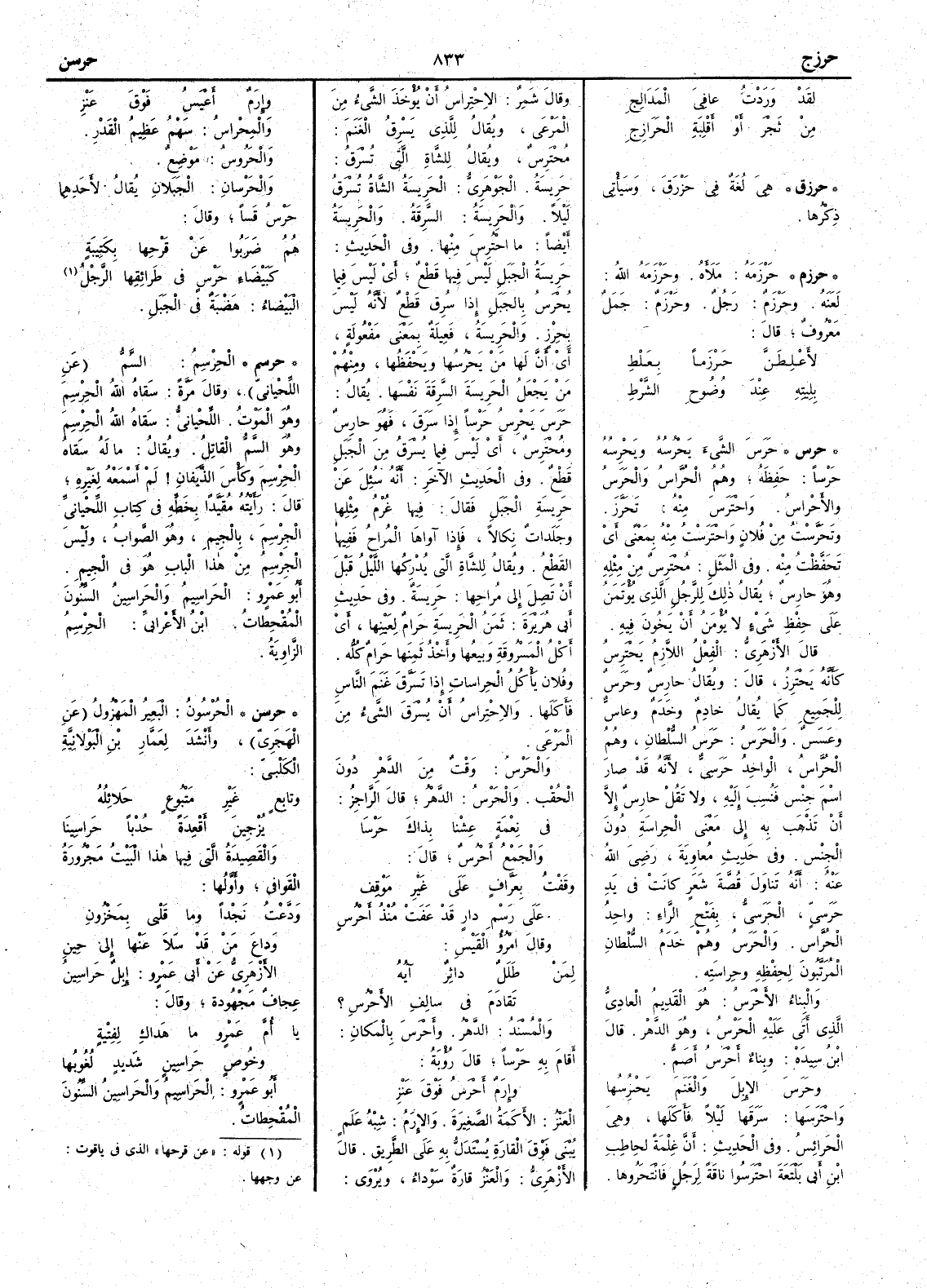 ( حرزق ) هي لغة في حَزْرقَ وسيأتي ذكرها ( حرزم ) حَرْزَمَهُ ملأَه وحَرْزَمَهُ الله لعنه وحَرْزَمٌ رجل وحَرْزَمٌ جمل معروف قال لأَعْلِطَنَّ حَرْزَماً بعَلْطِ بلِيتِهِ عند وُضوحِ الشَّرْطِ