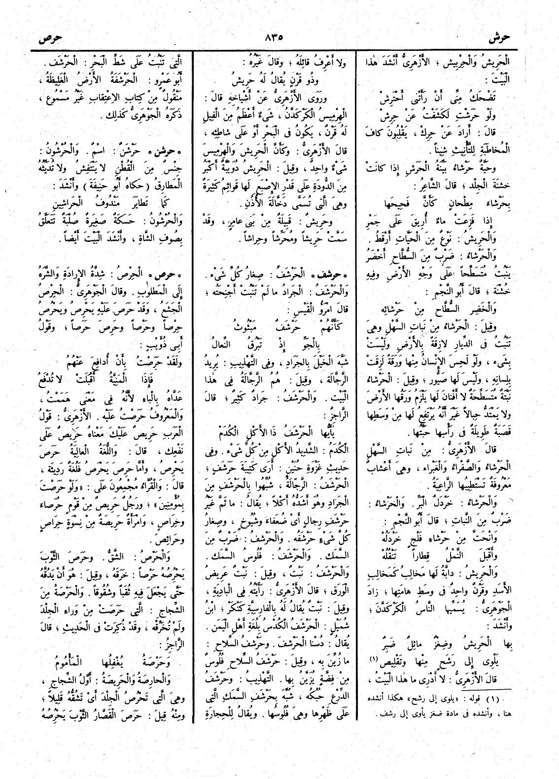 الحَريِش والحِرْبيش الأَزهري أَنشد هذا البيت تَضْحَكُ مِني أَنْ رَأَتْني أَحْتَرِشْ ولَوْ حَرَشْتِ لكَشَفْتُ عن حِرِش قال أَراد عن حِرِكْ يَقْلبون كاف المخاطبة للتأْنيث شِيناً وحيَّة حَرْشاء بيّنة الحَرَشِ إِذا كانت خشنة الجلد قال الشاعر بِحَرْشاء مِطْحانٍ كأَنَّ فَحِيحَها إِذا فَزِعَتْ ماءٌ أُرِيقَ على جَمْر والحَرِيشُ نوع من الحيات أَرْقَط والحَرْشاء ضرب من السُّطَّاح أَخضرُ ينبت مُتِسَطِّحاً على وجه الأَرض وفيه خُشْنَة قال أَبو النجم والخَضِر السُّطّاح من حَرْشائِه وقيل الحَرْشاء من نبات السهل وهي تنبت في الديار لازِقة بالأَرض وليست بشيء ولو لَحِسَ الإِنسان منها ورقةً لزِقت بلسانه وليس لها صَيُّور وقيل الحَرْشاء نَبْتة مُتَسَطِّحة لا أَفنان لها يَلْزَمُ ورقُها الأَرضَ ولا يمتدُّ حِبالاً غير أَنه يرتفع لها من وسَطِها قصبة طويلة في رأْسها حَبَّتها قال الأَزهري من نبات السهل الحَرْشاءُ والصَّفْراء والغَبْراء وهي أَعشاب معروفة تَسْتَطِيبُها الراعية والحَرْشاء خَرْدَل البَرِّ والحَرْشاء ضرب من النبات قال أَبو النجم وانْحَتَّ من حَرْشاء فَلْجٍ خَرْدَلُهْ وأَقْبَلَ النَّمْلُ قِطاراَ تَنْقُلُهْ والحَرِيش دابة لها مخالب كمخالب الأَسد وقَرْنٌ واحد في وسَطِ هامَتِها زاد الجوهري يسميها الناس الكَرْكَدّن وأَنشد بها الحَرِيشُ وضِغْزٌ مائِل ضَبِرٌ يَلْوي إِلى رَشَحٍ منها وتَقْلِيص