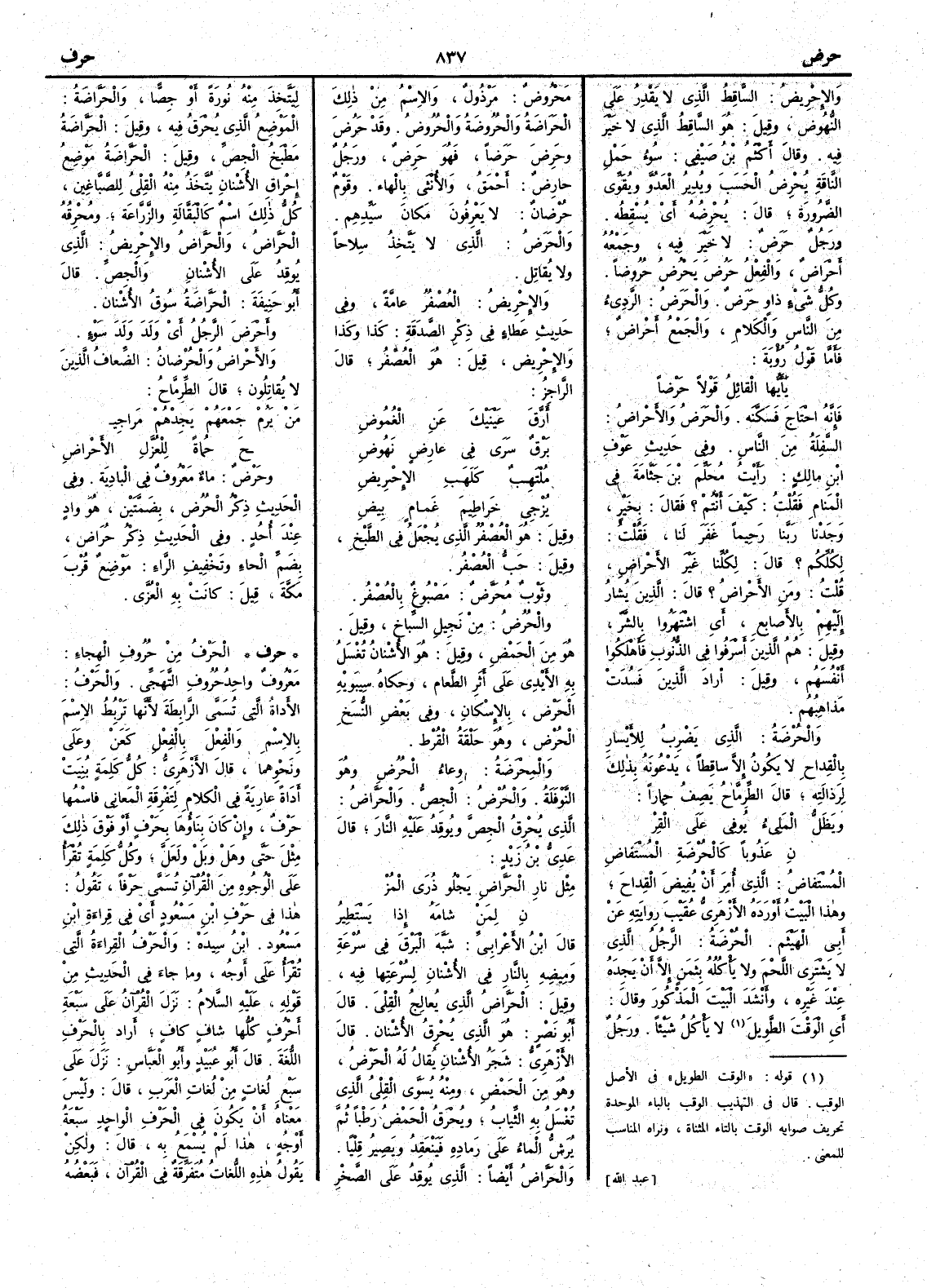 ( حرف ) الحَرْفُ من حُروف الهِجاء معروف واحد حروف التهجي والحَرْفُ الأَداة التي تسمى الرابِطةَ لأَنها تَرْبُطُ الاسمَ بالاسم والفعلَ بالفعل كعن وعلى ونحوهما قال الأَزهري كلُّ كلمة بُنِيَتْ أَداةً عارية في الكلام لِتَفْرِقَة المعاني واسمُها حَرْفٌ وإن كان بناؤها بحرف أَو فوق ذلك مثل حتى وهل وبَلْ ولعلّ وكلُّ كلمة تقرأُ على الوجوه من القرآن تسمى حَرْفاً تقول هذا في حَرْف ابن مسعود أَي في قراءة ابن مسعود ابن سيده والحَرْفُ القِراءة التي تقرأُ على أَوجُه وما جاء في الحديث من قوله عليه السلام نزل القرآن على سبعة أَحْرُف كلُّها شافٍ كافٍ أَراد بالحرْفِ اللُّغَةَ قال أَبو عبيد وأَبو العباس نزل على سبع لُغات من لغات العرب قال وليس معناه أَن يكون في الحرف الواحد سبعة أَوجُه هذا لم يسمع به قال ولكن يقول هذه اللغات متفرّقة في القرآن فبعضه