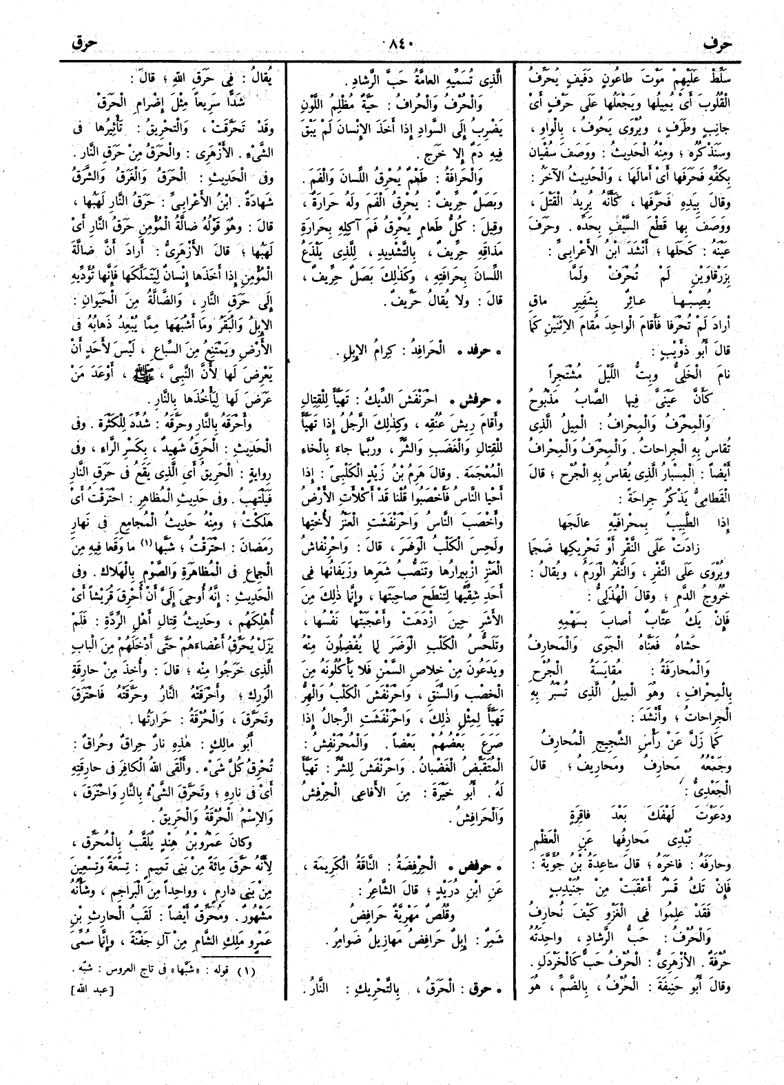 سَلِّطْ عليهم مَوْتَ طاعُونٍ دَفِيفٍ يُحَرِّفُ القُلوبَ أَي يُمِيلها ويَجْعَلُها على حرْفٍ أَي جانب وطَرَفٍ ويروى يَحُوفُ بالواو وسنذكره ومنه الحديث ووصف سُفيانُ بكفه فَحَرَفَها أَي أَمالَها والحديث الآخر وقال بيده فحرّفها كأَنه يريد القتل ووصف بها قطْع السيفِ بحَدِّه وحَرَفَ عَيْنَه كَحَلها أَنشد ابن الأَعرابي بِزَرْقاوَيْنِ لم تُحْرَفْ ولَمَّا يُصِبْها عائِرٌ بشَفير ماقِ أَراد لم تُحْرَفا فأَقام الواحد مُقام الاثْنين كما قال أَبو ذُؤَيب نامَ الخَلِيُّ وبتُّ الليلَ مُشْتَجِراً كأَنَّ عيْنَيَّ فيها الصَّابُ مَذْبوحُ والمِحْرَفُ والمِحْرافُ المِيلُ الذي تقاسُ به الجِراحات والمِحْرَفُ والمِحْرافُ أَيضاً المِسْبارُ الذي يُقاسُ به الجُرح قال القطامي يذكر جِراحةً إذا الطَّبيبُ بمِحْرافَيْه عالَجَها زادَتْ على النَّقْرِ أَو تَحْريكها ضَجَما ويروى على النَّفْرِ والنَّفْرُ الوَرَمُ ويقال خروج الدّم وقال الهذلي فإنْ يَكُ عَتَّابٌ أَصابَ بسَهْمِه حَشاه فَعَنَّاه الجَوى والمَحارِفُ والمُحارَفةُ مُقايَسَةُ الجُرْحِ بالمِحْرافِ وهو المِيل الذي تُسْبَرُ به الجِراحاتُ وأَنشد كما زَلَّ عن رأْسِ الشَّجِيجِ المحارفُ وجمعه مَحارِفُ ومَحاريفُ قال الجَعْدي ودَعَوْتَ لَهْفَك بعد فاقِرةٍ تُبْدي مَحارِفُها عن العَظْمِ وحارَفَه فاخَرَه قال ساعِدةُ بن جُؤَيَّة فإنْ تَكُ قَسْرٌ أَعْقَبَتْ من جُنَيْدِبٍ فقد عَلِمُوا في الغَزْوِ كيْفَ نُحارِفُ والحُرْفُ حَبُّ الرَّشادِ واحدته حُرْفةٌ الأَزهري الحُرْفُ جَبٌّ كالخَرْدَلِ وقال أَبو حنيفة الحُرف بالضم هو الذي تسميه العامّة حبَّ الرَّشاد والحُرْفُ والحُرافُ حَيّةٌ مُظْلِمُ اللَّوْنِ يَضْرِبُ إلى السَّواد إذا أَخذ الإنسانَ لم يبق فيه دم إلا خرج والحَرافةُ طَعْم يُحْرِقُ اللِّسانَ والفَمَ وبصل حِرِّيفٌ يُحْرِقُ الفم وله حَرارةٌ وقيل كل طعام يُحْرِقُ فم آكله بحَرارة مَذاقِه حِرِّيف بالتشديد للذي يَلْذَعُ اللسانَ بحَرافَتِه وكذلك بصل حِرّيف قال ولا يقال حَرِّيف