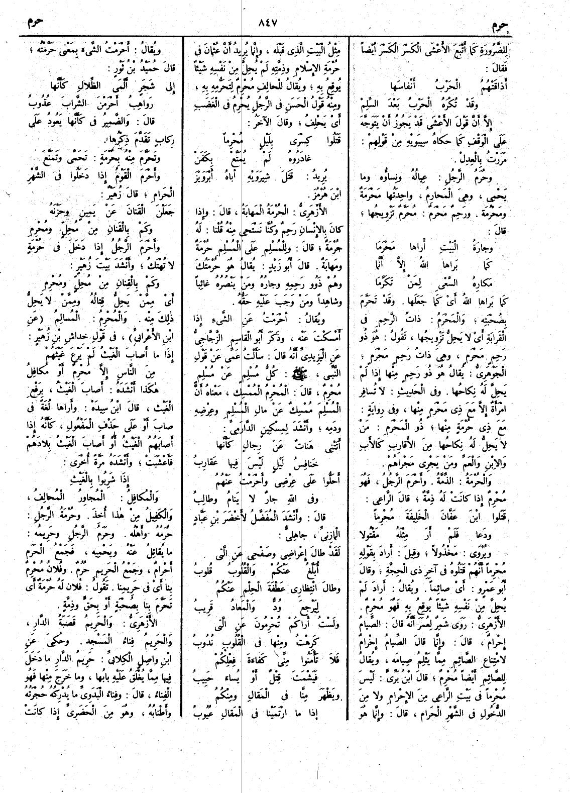 للضرورة كما أتبع الأَعشى الكسر الكسر أَيضاً فقال أَذاقَتْهُمُ الحَرْبُ أَنْفاسَها وقد تُكْرَهُ الحربُ بعد السِّلِمْ إلاَّ أن قول الأَعشى قد يجوز أَن يَتَوَجَّه على الوقف كما حكاه سيبويه من قولهم مررت بالعِدِلْ وحُرَمُ الرجلِ عياله ونساؤه وما يَحْمِي وهي المَحارِمُ واحدتها مَحْرَمَةٌ ومَحْرُمة مَحْرُمة ورَحِمٌ مَحْرَمٌ مُحَرَّمٌ تَزْويجُها قال وجارةُ البَيْتِ أَراها مَحْرَمَا كما بَراها الله إلا إنما مكارِهُ السَّعْيِ لمن تَكَرَّمَا كما بَراها الله أَي كما جعلها وقد تَحَرَّمَ بصُحْبته والمَحْرَمُ ذات الرَّحِم في القرابة أَي لا يَحِلُّ تزويجها تقول هو ذو رَحِمٍ مَحْرَمٍ وهي ذاتُ رَحِمٍ مَحْرَمٍ الجوهري يقال هو ذو رَحِمٍ منها إذا لم يحل له نكاحُها وفي الحديث لا تسافر امرأة إلا مع ذي مَحْرَمٍ منها وفي رواية مع ذي حُرْمَةٍ منها ذو المَحْرَمِ من لا يحل له نكاحها من الأَقارب كالأب والإبن والعم ومن يجري مجراهم والحُرْمَة الذِّمَّةُ وأَحْرَمَ الرجلُ فهو مُحْرِمٌ إذا كانت له ذمة قال الراعي قَتَلوا ابنَ عَفّان الخليفةَ مُحْرِماً ودَعا فلم أَرَ مثلَهُ مَقْتولا ويروى مَخْذولا وقيل أَراد بقوله مُحْرِماً أَنهم قتلوه في آخر ذي الحِجَّةِ وقال أَبو عمرو أَي صائماً ويقال أَراد لم يُحِلَّ من نفسه شيئاً يوقِعُ به فهو مُحْرِمٌ الأزهري روى شمر لعُمَرَ أَنه قال الصيام إحْرامٌ قال وإنما قال الصيامُ إحْرام لامتناع الصائم مما يَثْلِمُ صيامَه ويقال للصائم أَيضاً مُحْرِمٌ قال ابن بري ليس مُحْرِماً في بيت الراعي من الإحْرام ولا من الدخول في الشهر الحَرام قال وإنما هو مثل البيت الذي قبله وإنما يريد أَن عثمان في حُرْمةِ الإسلام وذِمَّته لم يُحِلَّ من نفسه شيئاً يُوقِعُ به ويقال للحالف مُحْرِمٌ لتَحَرُّمِه به ومنه قول الحسن في الرجل يُحْرِمُ في الغضب أَي يحلف وقال الآخر قتلوا كِسْرى بليلٍ مُحْرِماً غادَرُوه لم يُمَتَّعْ بكَفَنْ يريد قَتَلَ شِيرَوَيْهِ أَباه أَبْرَوَيْز بنَ هُرْمُزَ الأَزهري الحُرْمة المَهابة قال وإذا كان بالإنسان رَحِمٌ وكنا نستحي مه قلنا له حُرْمَةٌ قال وللمسلم على المسلم حُرْمةٌ ومَهابةٌ قال أَبو زيد يقال هو حُرْمَتُك وهم ذَوو رَحِمِه وجارُه ومَنْ يَنْصره غائباً وشاهداً ومن وجب عليه حَقُّه ويقال أَحْرَمْت عن الشيء إذا أَمسكتَ عنه وذكر أَبو القاسم الزجاجي عن اليزيدي أَنه قال سألت عمي عن قول النبي صلى الله عليه وسلم كلُّ مُسْلم عن مسلم مُحْرِمٌ قال المُحْرِمُ الممسك معناه أَن المسلم ممسك عن مال المسلم وعِرْضِهِ ودَمِهِ وأَنشد لمِسْكين الدارميّ أَتتْني هَناتٌ عن رجالٍ كأَنها خَنافِسُ لَيْلٍ ليس فيها عَقارِبُ أَحَلُّوا على عِرضي وأَحْرَمْتُ عنهُمُ وفي اللهِ جارٌ لا ينامُ وطالِبُ قال وأَنشد المفضل لأَخْضَرَ بن عَبَّاد المازِنيّ جاهليّ لقد طال إعْراضي وصَفْحي عن التي أُبَلَّغُ عنكْم والقُلوبُ قُلوبُ وطال انْتِظاري عَطْفَةَ الحِلْمِ عنكمُ ليَرْجِعَ وُدٌّ والمَعادُ قريبُ ولستُ أَراكُمْ تُحْرِمونَ عن التي كرِهْتُ ومنها في القُلوب نُدُوبُ فلا تأمَنُوا مِنّي كَفاءةَ فِعْلِكُمْ فيَشْمَتَ قِتْل أَو يُساءَ حبيبُ ويَظْهَرَ مِنّاً في المَقالِ ومنكُُمُ إذا ما ارْتَمَيْنا في المَقال عُيوبُ ويقال أَحْرَمْتُ الشيء بمعنى حَرَّمْتُه قال حُمَيْدُ بن ثَوْرٍ إلى شَجَرٍ أَلْمَى الظِّلالِ كأنها رواهِبُ أَحْرَمْنَ الشَّرابَ عُذُوبُ قال والضمير في كأنها يعود على رِكابٍ تقدم ذكرها وتَحَرَّم منه بحُرْمَةٍ تَحَمّى وتَمَنَّعَ وأََحْرَمَ القومُ إذا دخلوا في الشهر الحَرامِ قال زهير جَعَلْنَ القَنانَ عن يَمينٍ وحَزْنَهُ وكم بالقَنانِ من مُحِلٍّ ومُحْرِمِ وأَحْرَمَ الرجلُ إذا دخل في حُرْمة لا تُهْتَكُ وأَنشد بيت زهير وكم بالقنانِ من مُحِلٍّ ومُحْرِمِ أي ممن يَحِلُّ قتالُه وممن لا يَحِلُّ ذلك منه والمُحْرِمُ المُسالمُ عن ابن الأَعرابي في قول خِداش بن ز