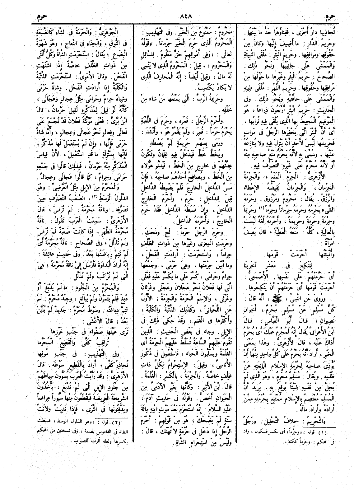 ( * قوله « وحرماً » أي بكسر فسكون زاد في المحكم وحرماً ككتف ) وحَريماً وحِرْمَةً وحَرِمَةً وحَريمةً وأَحْرَمَهُ لغةٌ ليست بالعالية كله منعه العطيّة قال يصف امرأة وأُنْبِئْتُها أَحْرَمَتْ قومَها لتَنْكِحَ في مَعْشَرٍ آخَرِينا أَي حَرَّمَتْهُم على نفسها الأَصمعي أَحْرَمَتْ قومها أَي حَرَمَتْهُم أَن ينكحوها وروي عن النبي صلى الله عليه وسلم أَنه قال كل مُسلمٍ عن مسلم مُحْرِمٌ أَخَوانِ نَصيرانِ قال أَبو العباس قال ابن الأَعرابي يقال إنه لمُحْرِمٌ عنك أَي يُحَرِّمُ أَذاكَ عليه قال الأَزهري وهذا بمعنى الخبر أَراد أَنه يَحْرُمُ على كل واحد منهما أَن يُؤْذي صاحبَهُ لحُرْمة الإسلام المانِعَتِه عن ظُلْمِه ويقال مُسلم مُحْرِمٌ وهو الذي لم يُحِلَّ من نفسه شيئاً يُوقِعُ به يريد أَن المسلم مُعْتَصِمٌ بالإسلام ممتنع بحُرْمتِهِ ممن أَراده وأَراد ماله والتَّحْرِيمُ خلاف التَّحْليل ورجل مَحْروم ممنوع من الخير وفي التهذيب المَحْروم الذي حُرِمَ الخيرَ حِرْماناً وقوله تعالى في أَموالهم حقٌّ معلوم للسائل والمَحْروم قيل المَحْروم الذي لا يَنْمِي له مال وقيل أَيضاً إِنه المُحارِفُ الذي لا يكاد يَكْتَسِبُ وحَرِيمةُ الربِّ التي يمنعها من شاء من خلقه وأَحْرَمَ الرجلَ قَمَرَه وحَرِمَ في اللُّعبة يحْرَمُ حَرَماً قَمِرَ ولم يَقْمُرْ هو وأَنشد ورَمَى بسَهْمِ حَريمةٍ لم يَصْطَدِ ويُخَطُّ خَطٌّ فيدخل فيه غِلمان وتكون عِدَّتُهُمْ في خارج من الخَطّ فيَدْنو هؤلاء من الخط ويصافحُ أَحدُهم صاحبَهُ فإن مسَّ الداخلُ الخارجَ فلم يضبطه الداخلُ قيل للداخل حَرِمَ وأَحْرَمَ الخارِجُ الداخلَ وإن ضبطه الداخلُ فقد حَرِمَ الخارِجُ وأَحْرَمَه الداخِلُ وحَرِمَ الرجلُ حَرماً لَجَّ ومَحَكَ وحَرِمَت المِعْزَى وغيرُها من ذوات الظِّلْف حِراماً واسْتحْرَمَتْ أَرادت الفحل وما أَبْيَنَ حِرْمَتَها وهي حَرْمَى وجمعها حِرامٌ وحَرامَى كُسِّرَ على ما يُكَسَّرُ عليه فَعْلَى التي لها فَعْلانُ نحو عَجْلان وعَجْلَى وغَرْثان وغَرْثى والاسم الحَرَمةُ والحِرمةُ الأَول عن اللحياني وكذلك الذِّئْبَةُ والكلبة وأكثرها في الغنم وقد حكي ذلك في الإبل وجاء في بعض الحديث الذين تقوم عليهم الساعةُ تُسَلَّطُ عليهم الحِرْمَةُ أَي الغُلْمَةُ ويُسْلَبُون الحياءَ فاسْتُعْمِل في ذكور الأَناسِيِّ وقيل الإسْتِحْرامُ لكل ذات ظِلْفٍ خاصةً والحِرْمَةُ بالكسر الغُلْمةُ قال ابن الأثير وكأنها بغير الآدمي من الحيوان أَخَصُّ وقوله في حديث آدم عليه السلام إنه اسْتَحْرَمَ بعد موت ابنه مائةَ سنةٍ لم يَضْحَكْ هو من قولهم أَحْرَمَ الرجلُ إذا دخل في حُرْمَةٍ لا تهْتَكُ قال وليس من اسْتِحْرام الشاة الجوهري والحِرْمةُ في الشاء كالضَّبْعَةِ في النُّوقِ والحِنَاء في النِّعاج وهو شهوة البِضاع يقال اسْتَحْرَمَت الشاةُ وكل أُنثى من ذوات الظلف خاصةً إذا اشتهت الفحل وقال الأُمَوِيُّ اسْتَحْرَمتِ الذِّئبةُ والكلبةُ إذا أَرادت الفحل وشاة حَرْمَى وشياه حِرامٌ وحَرامَى مثل عِجالٍ وعَجالى كأَنه لو قيل لمذكَّرِهِ لَقِيل حَرْمانُ قال ابن بري فَعْلَى مؤنثة فَعْلان قد تجمع على فَعالَى وفِعالٍ نحو عَجالَى وعِجالٍ وأَما شاة حَرْمَى فإنها وإن لم يستعمل لها مذكَّر فإنها بمنزلة ما قد استعمل لأَن قياس المذكر منه حَرْمانُ فلذلك قالوا في جمعه حَرامَى وحِرامٌ كما قالوا عَجالَى وعِجالٌ والمُحَرَّمُ من الإبل مثل العُرْضِيِّ وهو الذَّلُول الوَسَط