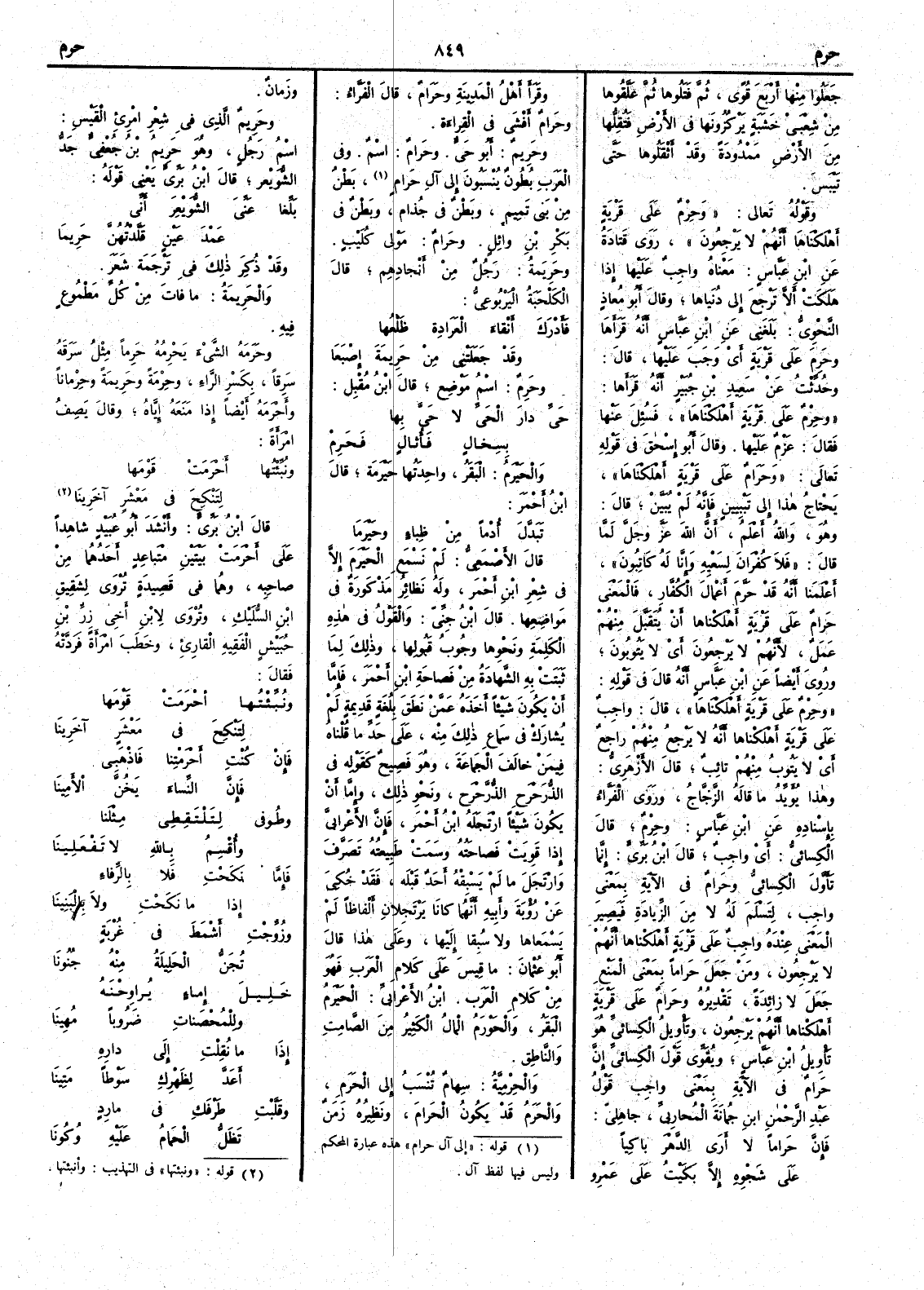 جعلوا منها أَربع قُوىً ثم فتلوها ثم علَّقوها من شِعْبَي خشبةٍ يَرْكُزونها في الأَرض فتُقِلُّها من الأَرض ممدودةً وقد أَثقلوها حتى تيبس وقوله تعالى وحِرْم على قرية أهلكناها أَنهم لا يرجعون روى قَتادةُ عن ابن عباس معناه واجبٌ عليها إذا هَلَكَتْ أن لا ترجع إلى دُنْياها وقال أَبو مُعاذٍ النحويّ بلغني عن ابن عباس أَنه قرأَها وحَرمَ على قرية أَي وَجَب عليها قال وحُدِّثْت عن سعيد بن جبير أَنه قرأَها وحِرْمٌ على قرية أَهلكناها فسئل عنها فقال عَزْمٌ عليها وقال أَبو إسحق في قوله تعالى وحرامٌ على قرية أَهلكناها يحتاج هذا إلى تَبْيين فإنه لم يُبَيَّنْ قال وهو والله أَعلم أَن الله عز وجل لما قال فلا كُفْرانَ لسعيه إنا له كاتبون أَعْلَمنا أَنه قد حَرَّمَ أعمال الكفار فالمعنى حَرامٌ على قرية أَهلكناها أَن يُتَقَبَّل منهم عَمَلٌ لأَنهم لا يرجعون أَي لا يتوبون وروي أَيضاً عن ابن عباس أَنه قال في قوله وحِرْمٌ على قرية أَهلكناها قال واجبٌ على قرية أَهلكناها أَنه لا يرجع منهم راجع أَي لا يتوب منهم تائب قال الأَزهري وهذا يؤيد ما قاله الزجاج وروى الفراء بإسناده عن ابن عباس وحِرْمٌ قال الكسائي أَي واجب قال ابن بري إنما تَأَوَّلَ الكسائي وحَرامٌ في الآية بمعنى واجب لتسلم له لا من الزيادة فيصير المعنى عند واجبٌ على قرية أَهلكناها أَنهم لا يرجعون ومن جعل حَراماً بمعنى المنع جعل لا زائدة تقديره وحَرامٌ على قرية أَهلكناها أَنهم يرجعون وتأويل الكسائي هو تأْويل ابن عباس ويقوّي قول الكسائي إن حَرام في الآية بمعنى واجب قولُ عبد الرحمن بن جُمانَةَ المُحاربيّ جاهليّ فإنَّ حَراماً لا أَرى الدِّهْرَ باكِياً على شَجْوِهِ إلاَّ بَكَيْتُ على عَمْرو وقرأ أَهل المدينة وحَرامٌ قال الفراء وحَرامٌ أَفشى في القراءة وحَرِيمٌ أَبو حَيّ وحَرامٌ اسم وفي العرب بُطون ينسبون إلى آل حَرامٍ