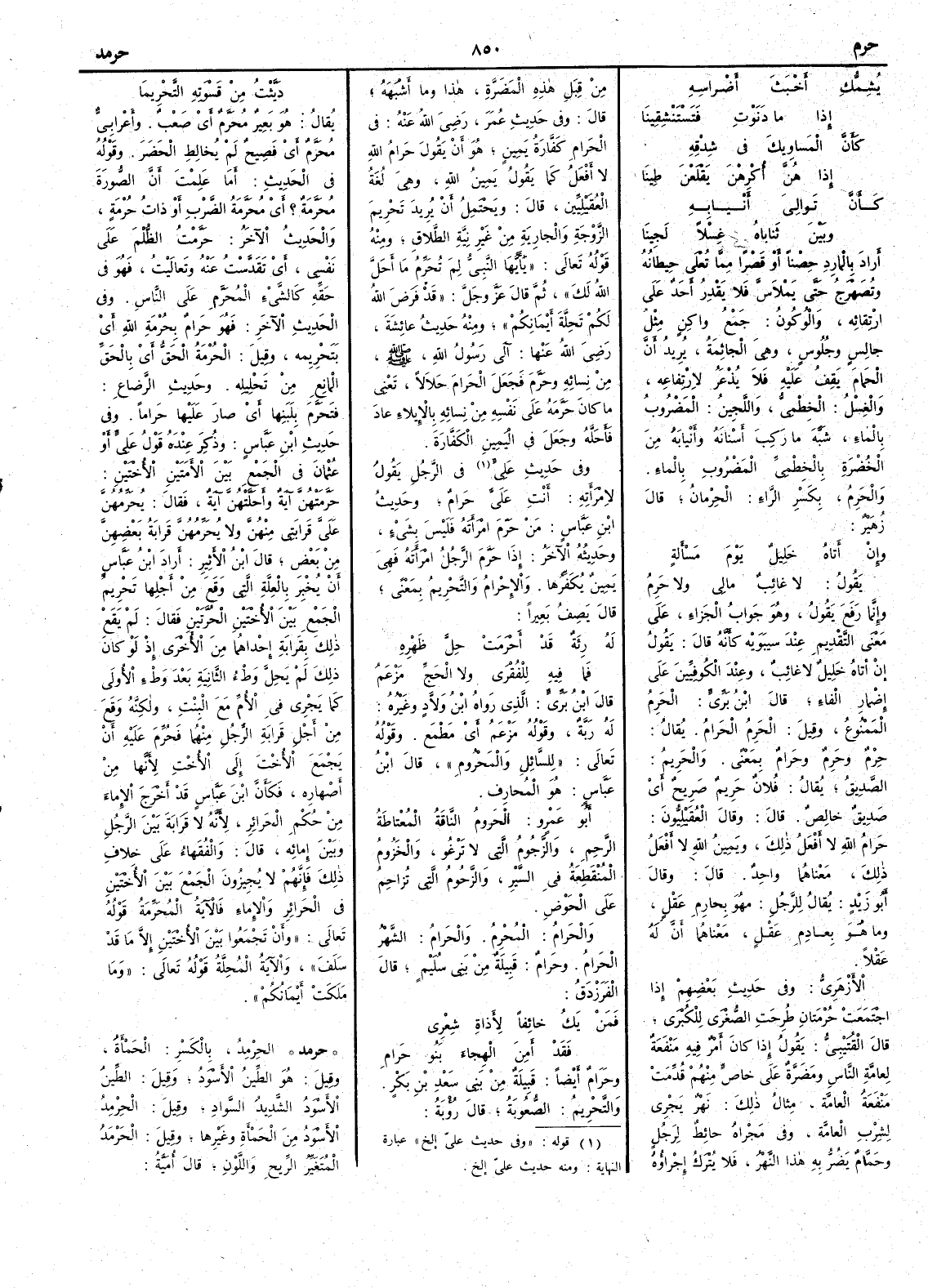 يُشِمُّكِ أَخْبَثَ أَضْراسِه إذا ما دَنَوْتِ فتسْتَنْشِقِينا كأَن المَساويكَ في شِدْقِه إذا هُنَّ أُكرِهن يَقلَعنَ طينا كأَنَّ تَواليَ أَنْيابِهِ وبين ثَناياهُ غِسْلاً لَجِينا أَراد بالمارِدِ حِصْناً أَو قَصراً مما تُُعْلى حيطانُه وتُصَهْرَجُ حتى يَمْلاسَّ فلا يقدر أَحد على ارتقائه والوُكُونُ جمع واكِنٍ مثل جالس وجُلوسٍ وهي الجاثِمة يريد أَن الحمام يقف عليه فلا يُذْعَرُ لارتفاعه والغِسْل الخطْمِيُّ واللَّجِينُ المضروب بالماء شبَّه ما رَكِبَ أَسنانَه وأنيابَِ من الخضرة بالخِطميّ المضروب بالماء والحَرِمُ بكسر الراء الحِرْمانُ قال زهير وإنْ أَتاه خليلٌ يوم مَسْأَلةٍ يقولُ لا غائبٌ مالي ولا حَرِمُ وإنما رَفَعَ يقولُ وهو جواب الجزاء على معنى التقديم عند سيبويه كأَنه قال يقول إن أَتاه خليل لا غائب وعند الكوفيين على إضمار الفاء قال ابن بري الحَرِمُ الممنوع وقيل الحَرِمُ الحَرامُ يقال حِرْمٌ وحَرِمٌ وحَرامٌ بمعنى والحَريمُ الصديق يقال فلان حَريمٌ صَريح أَي صَديق خالص قال وقال العُقَيْلِيُّونَ حَرامُ الله لا أَفعلُ ذلك ويمينُ الله لا أَفعلُ ذلك معناهما واحد قال وقال أَبو زيد يقال للرجل ما هو بحارِم عَقْلٍ وما هو بعادِمِ عقل معناهما أَن له عقلاً الأزهري وفي حديث بعضهم إذا اجتمعت حُرْمتانِ طُرِحت الصُّغْرى للكُبْرى قال القتيبي يقول إذا كان أَمر فيه منفعة لعامَّة الناس ومَضَرَّةٌ على خاصّ منهم قُدِّمت منفعة العامة مثال ذلك نَهْرٌ يجري لشِرْب العامة وفي مَجْراه حائطٌ لرجل وحَمَّامٌ يَضُرُّ به هذا النهر فلا يُتْرَكُ إجراؤه من قِبَلِ هذه المَضَرَّة هذا وما أَشبهه قال وفي حديث عمر رضي الله عنه في الحَرامِ كَفَّارةُ يمينٍ هو أَن يقول حَرامُ الله لا أَفعلُ كما يقول يمينُ اللهِ وهي لغة العقيلِييّن قال ويحتمل أَن يريد تَحْريمَ الزوجة والجارية من غير نية الطلاق ومنه قوله تعالى يا أَيها النبي لِمَ تُحَرِّمُ ما أَحَلَّ الله لك ثم قال عز وجل قد فرض الله لكم تَحِلَّةَ أَيْمانِكم ومنه حديث عائشة رضي الله عنها آلى رسول الله صلى الله عليه وسلم من نسائه وحَرَّمَ فجعل الحَرامَ حلالاً تعني ما كان حَرّمهُ على نفسه من نسائه بالإيلاء عاد فأَحَلَّهُ وجعل في اليمين الكفارةَ وفي حديث عليّ