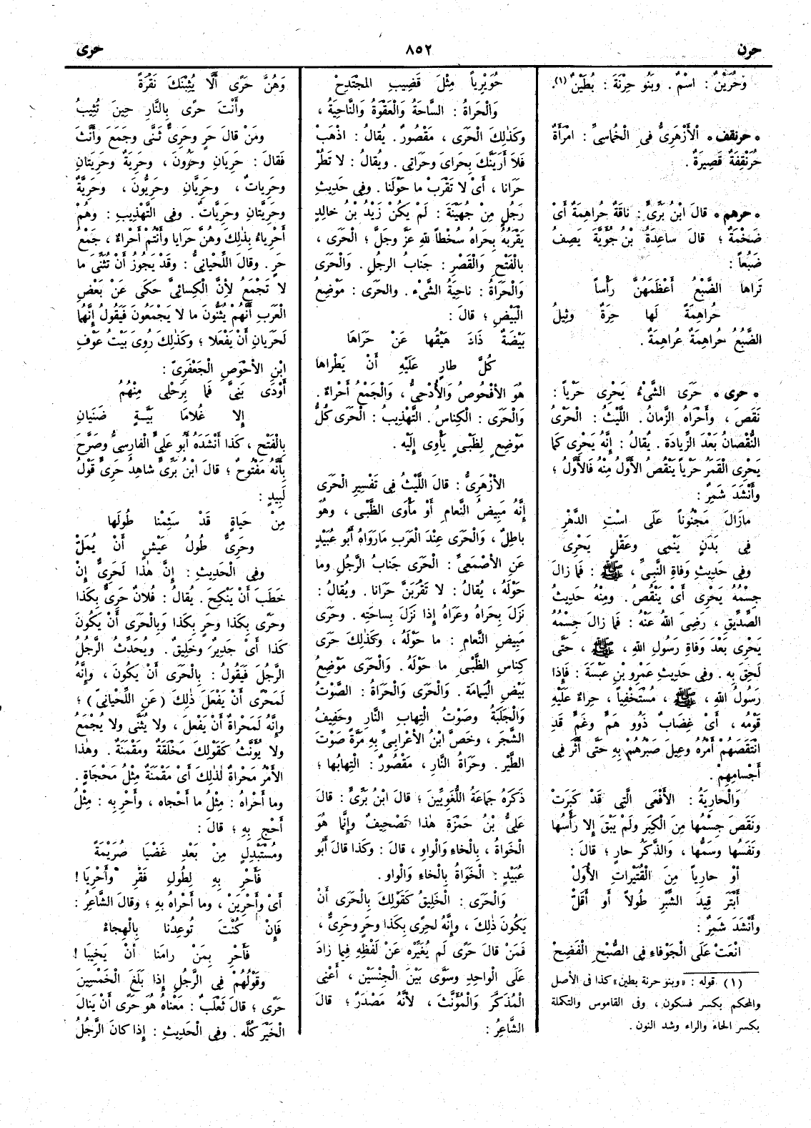 ( حري ) حَرَى الشيءُ يَحْرِي حَرْياً نَقَصَ وأَحْرَاه الزمانُ الليث الحَرْيُ النُّقصان بعد الزيادة يقال إِنه يَحْرِي كما يَحْرِي القمرُ حَرْياً يَنْقُصُ الأَوّل منه فالأَول وأَنشد شمر ما زَالَ مَجْنُوناً على اسْتِ الدَّهْرِ في بَدَنٍ يَنْمِي وعَقْلٍ يَحْرِي وفي حديث وفاة النبي صلى الله عليه وسلم فما زال جِسْمُه يَحْرِي أَي يَنْقُص ومنه حديث الصِّديق رضي الله عنه فما زال جِسْمُه يَحْرِي بعد وفاةِ رسول الله صلى الله عليه وسلم حتى لَحِقَ به وفي حديث عمرو بن عَبْسَة فإِذا رسول الله صلى الله عليه وسلم مُسْتَخْفِياً حِراءٌ عليه قومُه أَي غِضَابٌ ذَوُو هَمٍّ وغَمٍّ قد انْتَقَصَهم أَمْرُه وعِيلَ صَبْرُهم به حتى أَثَّر في أَجْسامهم والحارِيَةُ الأَفْعى التي قد كبِرتْ ونَقَص جسمها من الكِبَر ولم يبق إِلا رأْسُها ونَفَسُها وسَمُّها والذَّكر حارٍ قال أَو حارِياً من القُتَيْراتِ الأُوَلْ أَبْتَرَ قِيدَ الشِّبرِ طُولاً أَو أَقَلْ وأَنشد شمر انْعَتْ على الجَوْفاءِ في الصُّبْح الفَضِحْ حوَيْرِياً مثلَ قَضِيبِ المُجْتَدِحْ والحَراة الساحةُ والعَقْوَةُ والناحيةُ وكذلك الحَرَا مقصور يقال اذْهَبْ فلا أَرَيَنَّكَ بِحَرايَ وحَرَاتِي ويقال لا تَطُرْ حَرَانا أَي لا تَقْرَبْ ما حولنا وفي حديث رجل من جُهَينة لم يكن زيد بنُ خالد يَقْرَبه بِحَراهُ سُخْطاً لله عز وجل الحَرَا بالفتح والقصر جَنابُ الرجل والحَرَا والحَرَاةُ ناحيةُ الشيء والحَرَا موضع البَيْض قال بَيْضَةٌ ذادَ هَيْقُها عن حَرَاها كُلَّ طارٍ عليه أَن يَطْراها هو الأُفْحُوصُ والأُدْحِيُّ والجمع أَحْراء والحَرَا الكِناسُ التهذيب الحَرَا كُلُّ موضع لظَبْيٍ يأْوِي إِليه الأَزهري قال الليث في تفسير الحَرَا إِنه مَبِيضُ النَّعام أَو مأْوَى الظَّبْي وهو باطل والحَرَا عند العرب ما رواه أَبو عبيد عن الأَصمعي الحَرَا جَنابُ الرجل وما حوله يقال لا تَقْرَبَنَّ حَرَانا ويقال نزل بحَراهُ وعَرَاهُ إِذا نزل بساحته وحَرَا مَبِيضِ النَّعامِ ما حَوْله وكذلك حَرَا كِناسِ الظَّبْي ما حَوْله والحَرَا موضعُ بَيْضِ اليَمامة والحَرَا والحَرَاة الصوتُ والجَلَبة وصوتُ التِهاب النار وحَفيفُ الشجر وخَصَّ ابن الأَعرابي به مرةً صوتَ الطير وحَرَاةُ النار مقصورٌ التهابها ذكره جماعة اللغويين قال ابن بري قال علي بن حمزة هذا تصحيف وإِنما هو الخَوَاة بالخاء والواو قال وكذا قال أَبو عبيد الخَوَاة بالخاء والواو والحَرَى الخَلِيقُ كقولك بالحَرَى أَن يكون ذلك وإِنه لَحَرىً بكذا وحَرٍ وحَرِيٌّ فمن قال حَرىً لم يغيره عن لفظه فيما زاد على الواحد وسَوَّى بين الجِنْسين أَعني المذكر والمؤنث لأَنه مصدر قال الشاعر وهُنَّ حَرىً أَن لا يُثِبْنَكَ نَقْرَةً وأَنتَ حَرىً بالنارِ حينَ تُثِيبُ ومن قال حَرٍ وحَرِيٌّ ثَنَّى وجمع وأَنث فقال حَرِيانِ وحَرُونَ وحَرِيَة وحَرِيَتانِ وحَرِياتٌ وحَرِيَّانِ وحَرِيُّونَ وحَرِيَّة وحَرِيَّتانِ وحَرِيَّاتٌ وفي التهذيب وهم أَحْرِياء بذلك وهُنَّ حَرَايَا وأَنتم أَحْراءٌ جمع حَرٍ وقال اللحياني وقد يجوز أَن تثني ما لا تجمع لأَن الكسائي حكى عن بعض العرب أَنهم يثنون ما لا يجمعون فيقول إِنهما لحَرَيانِ أَن يفعلا وكذلك رُوِيَ بيتُ عَوْفِ بن الأَحْوصِ الجَعْفَرِي أَوْدَى بَنِيَّ فَما بِرَحْلِي مِنْهُمُ إِلا غُلاما بَيَّةٍ ضَنَيانِ بالفتح كذا أَنشده أَبو علي الفارسي وصرح بأَنه مفتوح قال ابن بري شاهدُ حَرِيّ قولُ لبيد من حَياةٍ قد سَئِمْنا طُولَها وحَرِيٌّ طُولُ عَيْشٍ أَن يُمَلّْ وفي الحديث إِنَّ هذا لَحرِيٌّ إِنْ خَطَبَ أَن يَنْكِحَ يقال فلان حَرِيٌّ بكذا وحَرىً بكذا وحَرٍ بكذا وبالحَرَى أَن يكون كذا أَي جَديرٌ وخَلِيقٌ ويُحَدِّثُ الرجلُ الرجلَ فيقولُ بالحَرَى أَن يكون وإِنه لمَحْرىً أَن يفعل ذلك عن اللحياني وإِنه لمَحْراة أَن يفعلَ ولا يثنى ولا يجمع ولا يؤنث كقولك مَخْلَقة ومَقْمَنة وهذا ال