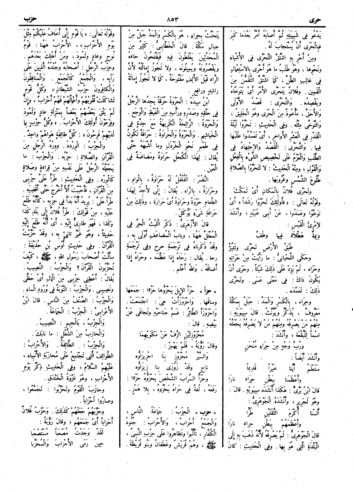 ( حزب ) الحِزْبُ جَماعةُ الناسِ والجمع أَحْزابٌ والأَحْزابُ جُنودُ الكُفَّار تأَلَّبوا وتظاهروا على حِزبْ النبيّ صلى اللّه عليه وسلم وهم قريش وغطفان وبنو قريظة وقوله تعالى يا قوم إِني أَخاف عليكم مثلَ يومِ الأَحزابِ الأَحْزابُ ههنا قوم نوح وعاد وثمود ومن أُهلك بعدهم وحِزْبُ الرجل أَصْحابُه وجُنْدُه الذين على رأْيِه والجَمْعُ كالجمع والمُنافِقُونَ والكافِرُونَ حِزْبُ الشَّيطانِ وكل قوم تَشاكَلَتْ قُلُوبهُم وأَعْمالُهم فهم أَحْزابٌ وإِن لم يَلْقَ بعضُهم بَعْضاً بمنزلة عادٍ وَثُمودَ وفِرعَوْنَ أُولئك الأَحزابُ وكل حِزْبٍ بما لَدَيْهم فَرِحُون كلُّ طائفةٍ هَواهُم واحدٌ والحِزْبُ الوِرْدُ ووِرْدُ الرَّجلِ من القرآن والصلاة حِزبُه والحِزْبُ ما يَجْعَلُه الرَّجل على نَفْسِهِ من قِراءةٍ وصَلاةٍ كالوِرْد وفي الحديث طَرَأَ عَلَيَّ حِزْبي مِن القُرْآنِ فأَحْبَبْتُ أَن لا أَخْرُج حتى أَقْضِيَه طرأَ عليَّ يريد أَنه بَدأَ في حِزْبه كأَنَّه طَلَعَ عليهِ من قولك طَرَأَ فلان إِلى بلَد كذا وكذا فهو طارئٌ إِليه أَي إِنه طَلَعَ إِليه حديثاً وهو غير تانِئٍ به وقد حَزَّبْتُ القُرْآنَ وفي حديث أَوس بن حذيفة سأَلتُ أَصحابَ رَسُولِ اللّهِ صلى اللّه عليه وسلم كيف تُحزِّبونَ القُرآن ؟ والحِزْبُ النَّصيبُ يقال أَعْطِني حِزْبِي مِن المال أَي حَظِّي ونَصيبي والحِزْبُ النَّوْبةُ في وُرُودِ [ ص 309 ] الماء والحِزْبُ الصِّنْفُ من الناس قال ابن الأَعرابي الحِزْب الجَماعةُ والجِزْبُ بالجيم النَّصيبُ والحازِبُ مِن الشُّغُلِ ما نابَكَ والحِزْبُ الطَّائفةُ والأَحْزابُ الطَّوائفُ التي تَجتمع على مُحارَبة الأَنبِياء عليهم السلام وفي الحديث ذِكْرُ يوم الأَحزاب وهو غَزْوةُ الخَنْدَقِ وحازَبَ القومُ وتَحَزَّبُوا تَجَمَّعوا وصاروا أَحْزاباً وحَزَّبَهم جعلَهم كذلك وحَزَّبَ فُلان أَحْزاباً أَي جَمَعَهُم وقال رُؤْبة