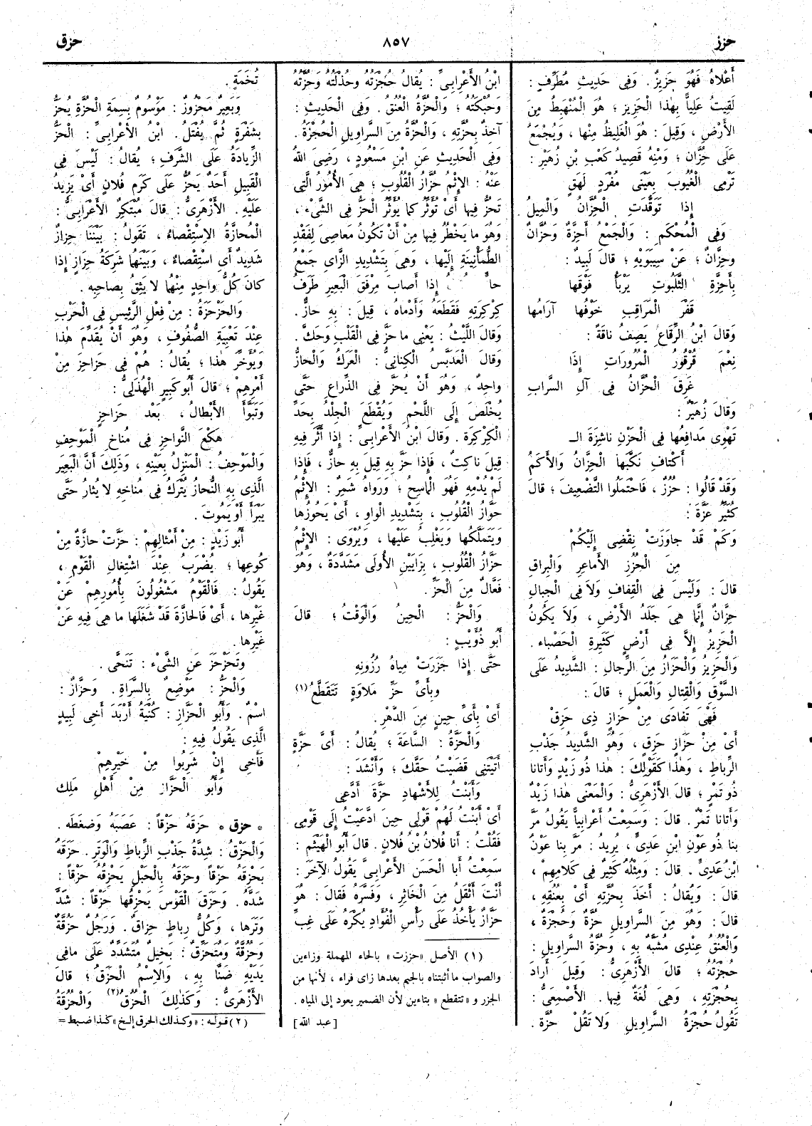 أَعلاه فهو حَزِيزٌ وفي حديث مطرّف لقيتُ عَلِيّاً بهذا الحَزِيز هو المُنْهبط من الأَرض وقيل هو الغليظ منها ويجمع على حُِزَّان ومنه قصيد كعب بن زهير تَرْمِي الغُيُوبَ بِعَيْنَيْ مُفْرَدٍ لَهَقٍ إِذا تَوَقَّدَت الحُزَّان والمِيلُ وفي المحكم والجمع أَحِزَّةٌ وحُزَّان وحِزَّانٌ عن سيبويه قال لبيد بأَحِزَّة الثَّلَبُوتِ يَرْبَأُ فَوْقَها قَفْرَ المَرَاقِبِ خَوْفُها آرَامُها وقال ابن الرِّقَاعِ يصف ناقة نِعْم قُرْقُور المرُورَاتِ إِذا غَرِقَ الحُزَّانُ في آلِ السَّرابِ وقال زهير تَهْوي مَدافِعُها في الحَزْنِ ناشِزَة ال أَكتاف نَكَّبَها الحِزَّانُ والأَكَمُ وقد قالوا حُزُزٌ فاحتملوا التضعيف قال كثير عزة وكم قد جاوَزَت نِقْضي إِليكمْ من الحُزُزِ الأَماعِرِ والبِرَاقِ قال وليس في القِفاف ولا في الجبال حِزَّانٌ إِنما هي جَلَد الأَرض ولا يكون الحَزيز إِلاَّ في أَرض كثيرة الحَصْباء والحَزِيزُ والحَزَازُ من الرجال الشديدُ على السَّوق والقتال والعمل قال فَهْيَ تَفادَى من حَزازٍ ذي حَزِقْ أَي من حَزَازٍ حَزِقٍ وهو الشيديد جَذْبِ الرِّباط وهذا كقولك هذا ذُو زَيْد وأَتانا ذو تَمْرٍ قال الأَزهري والمعنى هذا زيد وأَتانا تمر قال وسمعت أَعرابيّاً يقول مرّ بنا ذو عَوْن بن عَدِيّ يريد مرَّ بنا عون بن عدّي قال ومثله كثير في كلامهم قال ويقال أَخذ بحُزَّته أَي بعنقه قال وهو من السراويل حُزَّة وحُجْزَة والعنق عندي مشبه به وحُزَّة السراويل حُجْزته قال الأَزهري وقيل أَراد بحُجْزَته وهي لغة فيها الأَصمعي تقول حُجْزة السراويل ولا تقل حُزَّة ابن الأَعرابي يقال حُجْزَتُه وحُذْلته وحُزَّتُه وحُبْكَتُه والحُزَّةُ العُنق وفي الحديث آخذ بحُزَّته والحُزَّة من السراويل الحُجْزة وفي الحديث عن ابن مسعود رضي الله عنه الإِثْم حُزّاز القلوب هي الأُمور التي تَحُزُّ فيها أَي تُؤَثر كما يؤَثر الحَزُّ في الشيء وهو ما يخطر فيها من أَن تكون معاصي لفقد الطمأْنينة إِليها وهي بتشديد الزاي جمع حازٍّ يقال إِذا أَصاب مِرْفَقَ البعير طَرَفُ كِرْكِرَتِه فقطعه وأَدماه قيل به حازٌّ وقال الليث يعني ما حَزَّ في القلب وحَكَّ وقال العَدَبَّس الكناني العَرَك والحازّ واحد وهو أَن يُحَزَّ في الذراع حتى يُخْلَصَ إِلى اللحم ويُقْطع الجلدُ بحدِّ الكِرْكِرَة وقال ابن الأَعرابي إِذا أَثَّر فيه قيل ناكِتٌ فإِذا حَزَّ به قيل به حازٌّ فإِذا لم يُدْمه فهو الماسح ورواه شمر الإِثم حَوَّاز القلوب بتشديد الواو أَي يَحُوزها ويتملكها ويغلب عليها ويروى الإِثم حَزَّازُ القلوب بزايين الأُولى مشددة وهو فعَّال من الحَزّ والحَزّ الحِينُ والوقت قال أَبو ذؤَيب حتى إِذا حَزَزَتْ مِياهُ رُزُونِهِ وبأَيِّ حَزّ مَلاوَةٍ يتقطع أَي بأَي حين من الدهر والحَزَّة الساعة يقال أَيَّ حَزَّة أَتيتني قضيتُ حقك وأَنشد وأَبَنْت للأَشْهاد حَزَّة أَدَّعي أَي أَبَنْت لهم قولي حين ادَّعيت إِلى قومي فقلت أَنا فلان بن فلان قال أَبو الهثيم سمعت أَبا الحسن الأَعرابي يقول لآخر أَنت أَثقل من الخاثر وفسره فقال هو حَزَّاز يأْخذ على رأْس الفؤاد يُكْره على غِبِّ تُخَمة وبعير مَحْزوز موسوم بِسِمَة الحُزّة يُحَزُّ بشَفْرة ثم يفتل ابن الأَعرابي الحَزّ الزيادة على الشرف يقال ليس في القبيل أَحد يَحُزُّ على كرم فلان أَي يزيد عليه الأَزهري قال مبتكر الأَعرابي المُحازَّة الاسْتِقْصاء تقول بيننا حِزاز شديد أَي استقصاء وبينهما شركة حِزَازٍ إِذا كان كل واحد منهما لا يَثِق بصاحبه والحَزْحَزة من فعل الرئيس في الحرب عند تَعْبِيَة الصفوف وهو أن يقدّم هذا ويؤخر هذا يقال هم في حَزاحِز من أَمرهم قال أَبو كبير الهذلي وتَبَوَّأَ الأَبْطالُ بعد حَزاحِزٍ هَكْعَ النَّواحِزِ في مُناخ المَوْحِف والموحف المَنْزل بعينه وذلك أَن البعير الذي به النُّحاز يترك في مُناخه لا يثار حتى يبرأَ أَو يموت أَبو زيد من أَمثالهم حَزَّت حازَّةٌ من كُوعِها يضرب عند اشتغ
