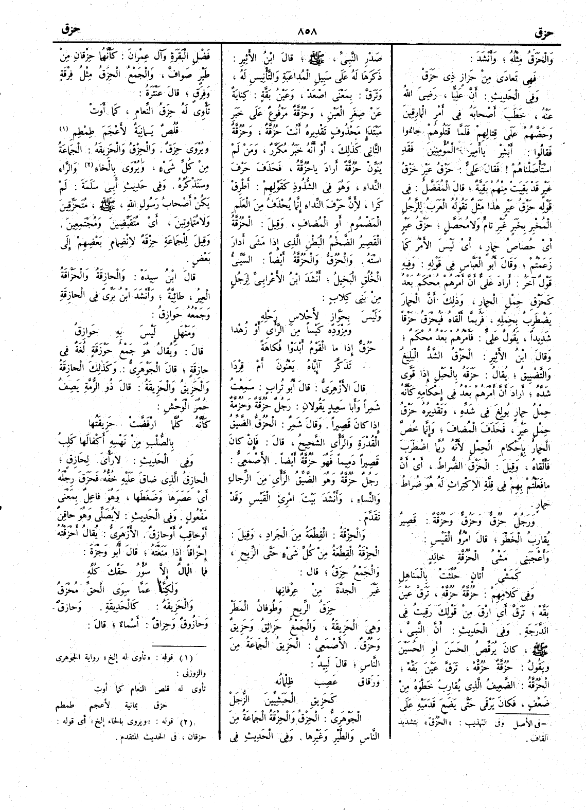 والحَزَقُ مثله وأنشد فهي تَعادَى من حُزازٍ ذي حَزَقْ وفي الحديث أنّ عليّاً رضي الله عنه خطب أصحابه في أمرِ المارِقينَ وحضَّهم على قتالهم فلما قتلوهم جاؤوا فقالوا أبْشِر يا أمير المؤمنين فقد استأْصَلْناهم فقال عليّ حَزقُ عيرٍ قد بَقِيت منهم بَقِيّة قال المفضل في قوله حزقُ عيرٍ هذا مثل تقوله العرب للرجل المُخْبِر بخَبَر غير تامّ ولا مُحصِّلٍ حَزْقُ عيْرٍ أي حُصاصُ حِمار أي ليس الأَمر كما زعمتم وقال أبو العباس في قوله وفيه قول آخر أراد عليّ أن أمرهم مُحكَم بعدُ كحَزْقِ حِمل الحمار وذلك أن الحمار يضْطرب بحمله فربما ألقاه فيُحْزَقُ حَزْقاً شديداً يقول عليّ فأمرُهم بعدُ مُحكَم وقال ابن الأَثير الحزْقُ الشدّ البليغ والتضْييقُ يقال حزَقَه بالحبل إذا قوَّى شدَّه أراد أن أمرهم بعدُ في إحكامه كأنه حمل حمار بُولِغ في شدِّه وتقديرُه حزْقُ حِمل عَير فحذف المضاف وإنما خص الحمار بإحكامِ الحِمل لأنه ربما اضطرب فألقاه وقيل الحَزْقُ الضُّراط أي إنّ ما فعلتم بهم في قلة الاكْتِراث له هو ضراط حمار ورجل حُزُقٌّ وحَزُقٌّ وحُزُقٌّ وحُزُقَّة قصير يقارِب الخَطْو قال امرؤ القيس وأعْجَبَني مَشْيُ الحُزُقّةِ خالِدٍ كمَشْيِ أتانٍ حُلِّئتْ بالمَناهِلِ وفي كلامهم حُزُقَّةٌ حُزُقّهْ ترَقَّ عينَ بَقّهْ ترَقَّ أي ارْقَ من قولك رَقِيتُ في الدَّرجة وفي الحديث أن النبي صلى الله عليه وسلم كان يُرقِّص الحسن أو الحسين ويقول حُزقة حزقه ترَقَّ عين بقه الحزقة الضعيف الذي يقارب خَطوه من ضَعف فكان يَرْقى حتى يضَع قدميه على صدر النبي صلى الله عليه وسلم قال ابن الأثير ذكرها له على سبيل المُداعَبة والتأْنيس له وترقَّ بمعنى اصْعَد وعين بقة كناية عن صغر العين وحزقةٌ مرفوع على خبر مبتدإ محذوف تقديره أنت حزقة وحزقة الثاني كذلك أو أنه خبر مكرّر ومن لم ينوّن حزقة أراد يا حزقة فحذف حرف النداء وهو في الشذوذ كقولهم أطْرِقْ كرا لأن حرف النداء إنما يحذف من العَلم المضموم أو المضاف وقيل الحُزُقّة القصير الضخْمُ البطنِ الذي إذا مشى أدار اسْتَه والحُزُقّ والحُزُقّة أيضاً السيء الخُلق البخيل أنشد ابن الأَعرابي لرجل من بني كلاب وليس بحَوّازٍ لأَحْلاسِ رَحْلِه ومِزْوَدِه كَيْساً من الرّأي أو زُهْدا حُزُقّ إذا ما القومُ أبْدَوْا فُكاهةً تَذَكَّرَ آإيّاه يَعْنونَ أمْ قِرْدا قال الأَزهري قال أبو تراب سمعت شمراً وأبا سعيد يقولان رجل حُزُقَّةٌ وحُزُمّةٌ إذا كان قصيراً وقال شمر الحزق الضَّيق القُدرة والرأي الشحِيحُ قال فإن كان قصيراً دَمِيماً فهو حزقة أيضاً الأَصمعي رج حُزُقة وهو الضيقُ الرأي من الرجال والنساء وأنشد بيت امرئ القيس وقد تقدَّم والحُزْقةُ القِطعة من الجَراد وقيل الحِزقة القِطعة من كل شيء حتى الر يح والجمع حِزَقٌ قال غَيَّرَ الجِدَّةَ من عِرْفانِها حِزَقُ الريحِ وطُوفانُ المَطَرْ وهي الحَزِيقةُ والجمع حَزائقُ وحَزِيقٌ وحُزُقٌ الأَصمعي الحَزِيقُ الجماعة من الناس قال لبيد ورَقاق عَصِب ظِلْمانُه كحَزِيقِ الحَبَشِيِّينَ الزُّجلْ الجوهري الحِزْقُ والحِزْقةُ الجماعة من الناس والطير وغيرها وفي الحديث في فَضْل البقرة وآل عِمْرانَ كأنهما حِزْقانِ من طيرٍ صوافَّ والجمع الحِزَق مثل فِرْقة وفِرَق قال عنترة تأْوي له حِزَقُ النِّعامِ كما أوَتْ قُلُصٌ يَمانِيةٌ لأَعْجَمَ طِمْطِمِ