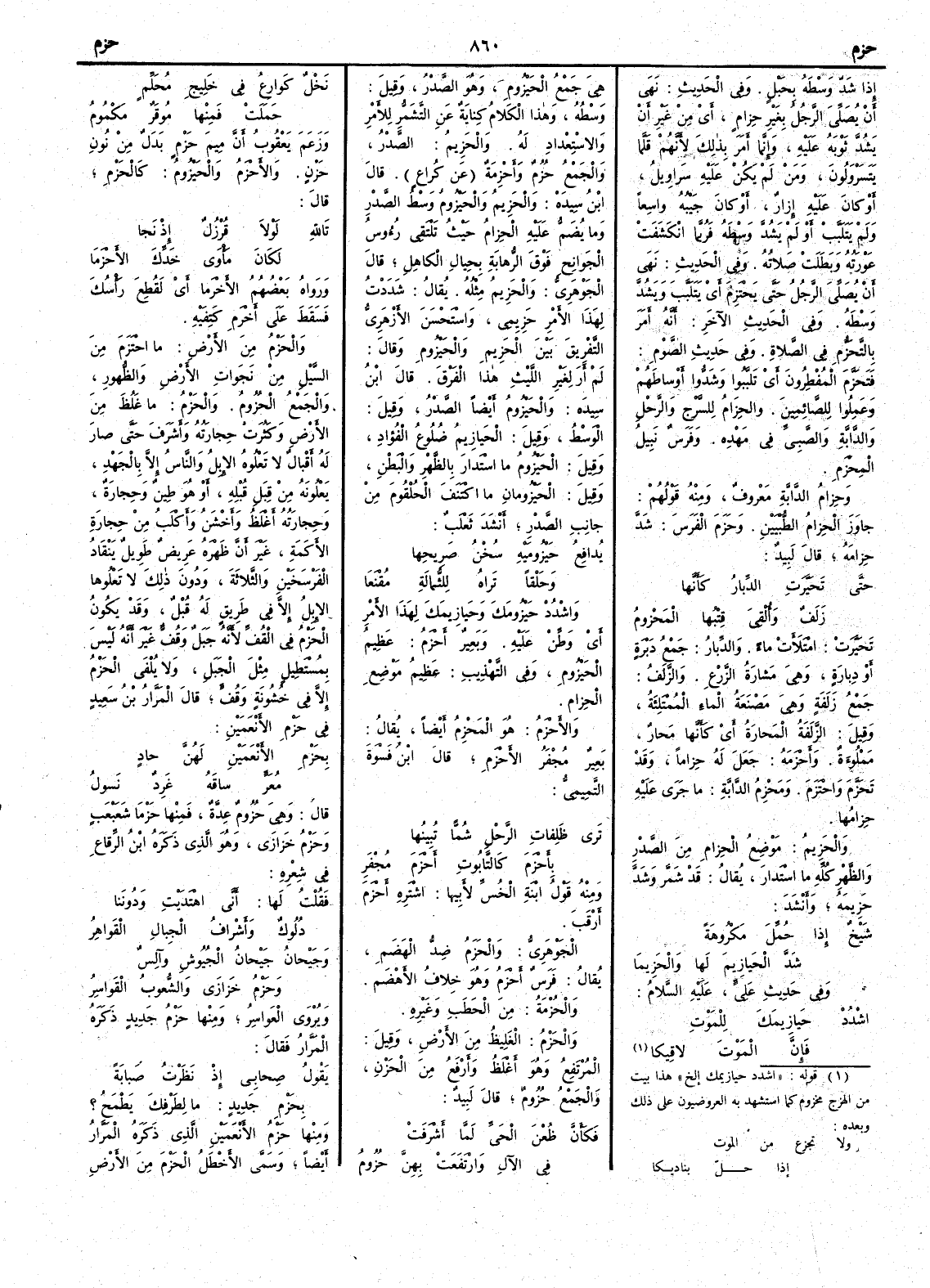 إذا شَدَّ وسطه بحبل وفي الحديث نهى أَن يصلي الرجل بغير حِزامٍ أَي من غير أَن يشُدَّ ثوبه عليه وإنما أَمر بذلك لأَنهم قَلَّما يَتَسَرْوَلُونَ ومن لم يكن عليه سَراويلُ أَو كان عليه إزار أَو كان جَيْبُه واسعاً ولم يَتَلَبَّبْ أَو لم يشد وسْطه فربما إنكشفت عورتُه وبطلت صلاته وفي الحديث نهى أَن يصلي الرجلُ حتى يَحْتَزِمَ أَي يتَلَبَّبَ ويشد وسطه وفي الحديث الآخر أَنه أَمر بالتَّحَزُّمِ في الصلاة وفي حديث الصوم فتَحَزَّمَ المفطرون أَي تلَبَّبُوا وشدوا أَوساطهم وعَمِلُوا للصائمين والحِزامُ للسِّرْج والرحْل والدابةِ والصبيّ في مَهْدِه وفرس نبيلُ المِحْزَمِ وحِزامُ الدابة معروف ومنه قولهم جاوَزَ الحِزامُ الطُّبْيَيْنِ وحَزَمَ الفرسَ شَدَّ حزامَهُ قال لبيد حتى تَحَيَّرَتِ الدِّبارُ كأَنها زَلَفٌ وأُلقِيَ قِتْبُها المَحْزوم تَحَيَّرَت امتلأَت ماءً والدّبارُ جمع دَبْرةٍ أَو دِبارَة وهي مَشارَةُ الزرع والزَّلَفُ جمع زَلَفَةٍ وهي مَصْنَعة الماء الممتلئة وقيل الزَّلَفَةُ المَحارَةُ أَي كأَنها محار مملوءة وأَحْزَمهُ جعل له حِزاماً وقد تَحَزَّمَ واحْتَزَمَ ومَحْزِمُ الدابة ما جرى عليه حِزامُها والحَزيمُ موضع الحِزامِ من الصدر والظهرِ كله ما استدار يقال قد شَمَّر وشدَّ حَزيمَهُ وأَنشد شيخٌ إذا حُمِّلَ مَكْروهة شَدَّ الحَيازِيمَ لها والحَزِيما وفي حديث عليّ عليه السلام اشْدُدْ حَيازيمكَ للمَوْتِ فإن المَوْتَ لاقِيكا