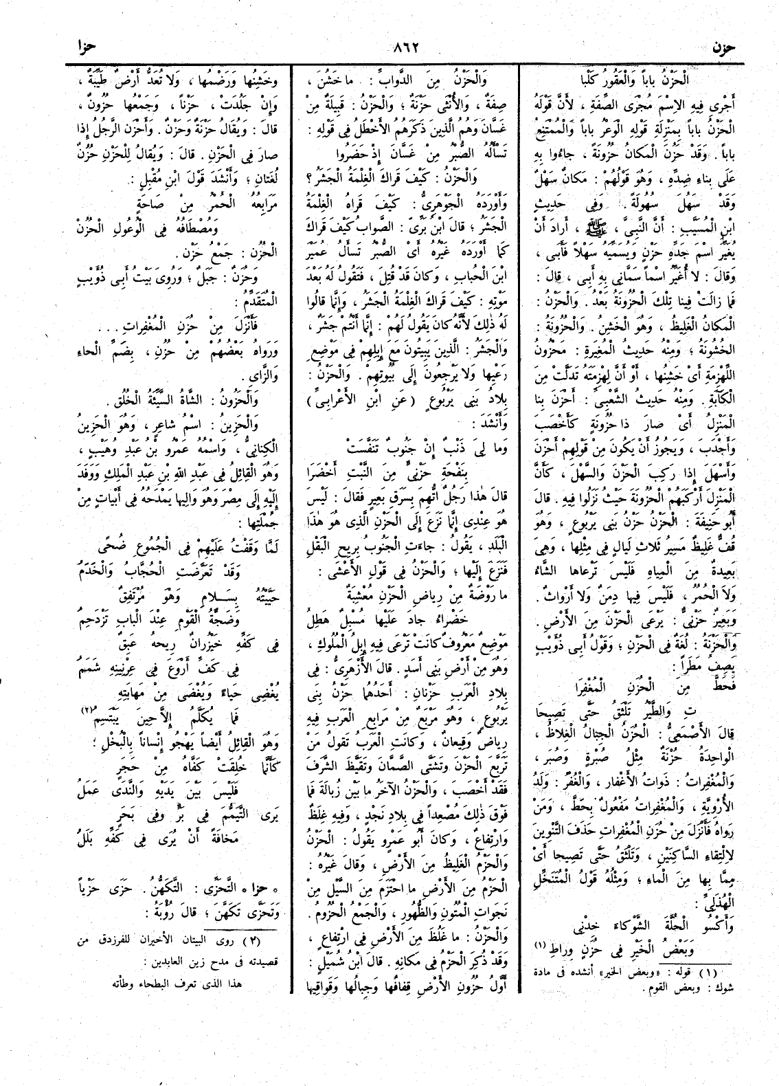 ( * قوله « وبعض الخير » أنشده في مادة شوك وبعض القوم ) والحَزْنُ من الدوابِّ ما خَشُنَ صفةٌ والأُنْثَى حَزْنةٌ والحَزْنُ قبيلةٌ من غَسَّانَ وهم الذين ذكرهم الأَخطل في قوله تَسْأَلُه الصُّبْرُ مِنْ غَسَّان إذْ حَضروا والحَزْنُ كَيْفَ قَراكَ الغِلْمةُ الجَشَرُ ؟ وأَورده الجوهري كيف قراه الغلمة الجشر قال ابن بري الصواب كيف قَراك كما أَورده غيره أَي الصُّبْرُ تسأَل عُمَيْر بنَ الحُباب وكان قد قُتِل فتقول له بعد موته كيف قَراكَ الغِلمةُ الجشَر وإنما قالوا له ذلك لأَنه كان يقول لهم إنما أَنتم جَشَرٌ والجَشَرُ الذين يَبِيتون مع إبلهم في موضع رَعْيِها ولا يرجعون إلى بيوتهم والحَزْنُ بلادُ بني يربوعٍ عن ابن الأَعرابي وأَنشد وما لِيَ ذَنْبٌ إنْ جَنُوبٌ تَنَفَّسَتْ بِنَفْحةِ حَزْنِيٍّ من النَّبْتِ أَخضرا قال هذا رجل اتُّهم بِسَرَق بَعِير فقال ليس هُوَ عندي إنَّما نَزَع إلى الحَزْن الذي هو هذا البَلَد يقول جاءت الجَنُوبُ بريحِ البَقْلِ فنَزَع إليها والحَزْنُ في قول الأَعشى ما رَوْضَةٌ مِنْ رِياضِ الحَزْن مُعْشِبَةٌ خَضْراءَ جادَ عليها مُسْبِلٌ هَطِلُ موضعٌ معروف كانت تَرْعَى فيه إبِلُ المُلوك وهو من أَرض بني أَسَدٍ قال الأَزهري في بلاد العَرب حَزْنانِ أَحدهما حَزْن بني يَرْبوعٍ وهو مَرْبَعٌ من مَرابعِ العرَب فيه رياضٌ وقِيعانٌ وكانت العرب تقول مَنْ تَرَبَّعَ الحَزْنَ وتَشَتَّى الصَّمَّانَ وتَقَيَّظَ الشَّرَفَ فقد أَخْصَبَ والحَزْنُ الآخرُ ما بين زُبالة فما فوق ذلك مُصْعِداً في بلاد نَجْد وفيه غِلَظٌ وارتفاعٌ وكان أَبو عمرو يقول الحَزْنُ والحَزْمُ الغلَيظُ من الأَرض وقال غيره الحَزْمُ من الأَرض ما احْتَزم من السَّيْل من نَجَوات المُتُون والظُّهور والجمع الحُزُوم والحَزْنُ ما غَلُظ من الأَرض في ارْتفاعٍ وقد ذُكِرَ الحَزْم في مكانه قال ابن شميل أَوَّلُ حُزُونِ الأَرض قِفافُها وجِبالُها وقَواقِيها وخَشِنُها ورَضْمُها ولا تُعَدُّ أَرضٌ طَيِّبَةٌ وإن جَلُدَتْ حَزْناً وجمعُها حُزُون قال ويقال حَزْنَةٌ وحَزْن وأَحْزَن الرجلُ إذا صار في الحَزْن قال ويقال للحَزْن حُزُن لُغَتان وأَنشد قول ابنِ مُقْبل مَرَابِعُهُ الحُمْرُ مِنْ صَاحَةٍ ومُصْطَافُهُ في الوُعُولِ الحُزُنْ الحُزُن جمع حَزْن وحُزَن جبل وروي بيت أَبي ذؤيب المتقدّم فأَنْزَلَ من حُزَن المُغْفِرات ورواه بعضهم من حُزُن بضم الحاء والزاي والحَزُون الشاة السيِّئة الخُلق والحَزينُ اسم شاعر وهو الحزين الكِنانيُّ واسمه عمرو بن عبد وُهَيب وهو القائل في عبد الله بن عبد الملك ووفَد إليه إلى مصر وهو واليها يمدحُه في أَبيات من جملتها لمَّا وقَفْت عليهم في الجُموع ضُحىً وقد تَعَرَّضَتِ الحُجَّابُ والخَدَمُ حَيَّيْتُه بسَلامٍ وهو مُرْتَفِقٌ وضَجَّةُ القَوْمِ عند الباب تَزْدَحِمُ في كَفِّه خَيزُرانٌ رِيحُه عَبِق في كَفِّ أَرْوَعَ في عِرْنِينِه شَمَمُ يُغْضِي حَياءً ويُغْضَى من مَهابَتِهِ فما يُكَلِّمُ إلاَّ حين يَبْتَسِمُ