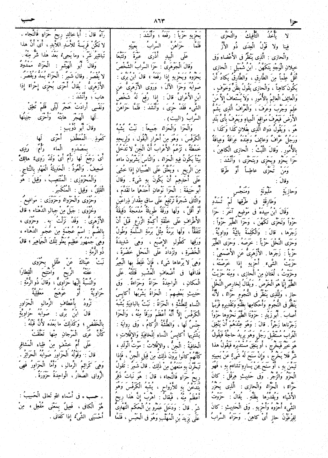 والحَزَا والحَزاءُ جميعاً نبتٌ يشبِه الكَرَفْس وهو من أَخْرار البُقول ولريحه خَمْطَةٌ تزعم الأَعراب أَن الجن لا تدخل بيتاً يكون فيه الحَزاءُ والناس يَشْرَبون ماءَه من الرِّيح ويُعَلَّقُ على الصبيان إِذا خُشِيَ على أَحدهم أَن يكون به شيء وقال أَبو حنيفة الحَزَا نوعانِ أَحدهما ما تقدم والثاني شجرة ترتفع على ساق مقدارَ ذراعين أَو أَقلّ ولها ورقة طويلة مُدْمَجة دقيقةُ الأَطراف على خِلْقَة أَكِمَّةِ الزَّرْع قبل أَن تتَفَقَّأ ولها بَرَمَة مثل بَرَمَةِ السَّلَمَةِ وطولُ ورَقها كطول الإِصْبَع وهي شديدة الخُضْرة وتزداد على المَحْلِ خُضْرَةً وهي لا يَرْعاها شيء فإِن غَلِطَ بها البعير فذاقها في أَضعاف العُشْب قتَلَتْه على المكان الواحدة حَزَاةٌ وحَزَاءةٌ وفي حديث بعضهم الحَزاة يشربها أَكايِسُ النساء للطُّشَّةِ الحَزَاة نبت بالبادية يشبه الكَرَفْس إِلا أَنه أَعظم ورقاً منه والحَزَا جِنسٌ لها والطُّشَّةُ الزُّكامُ وفي رواية يَشْترِيها أَكايسُ النساء للخافِيَةِ والإِقْلاتِ الخافِيَةُ الجِنُّ والإِقلاتُ مَوْتُ الوَلد كأَنهم كانوا يَرَوْنَ ذلك من قِبَلِ الجنّ فإِذا تبَخَّرْنَ به منَعَهُنَّ من ذلك قال شمر تقول ريحُ حَزَاء فالنَّجاء قال هو نباتٌ ذَفِرٌ يُتَدَخَّنُ به للأَرْواح يُشْبه الكَرَفْسَ وهو أَعظم منه فيقال اهْرُبْ إِن هذا ريحُ شرٍّ قال ودخل عَمْرو بن الحَكَم النَّهْدِيُّ على يزيد بن المُهَلَّب وهو في الحبس فلما رآه قال أَبا خالد ريحُ حَزَاء فالنَّجاء لا تَكُنْ فَريسةً للأَسَدِ اللاَّبِدِ أَي أَن هذا تَباشِيرُ شَرٍّ وما يجيء بعد هذا شرٌّ منه وقال أَبو الهيثم الحَزَاء ممدود لا يقصر وقال شمر الحَزَاء يمدّ ويقصر الأَزهري يقال أَحْزَى يُحْزي إِحْزاءً إِذا هابَ وأَنشد ونفْسِي أَرادَتْ هَجْرَ ليْلى فلم تُطِقْ لها الهَجْرَ هابَتْه وأَحْزَى جَنِينُها وقال أَبو ذؤَيب كعُوذِ المُعَطَّعفِ أَحْزَى لها بمَصْدَرِه الماءَ رَأْمٌ رَدِي أَي رَجَع لها رَأْمٌ أَي ولدٌ رديءٌ هالكٌ ضعيفٌ والعُوذُ الحديثةُ العهد بالنَّتاج والمُحْزَوْزي المُنْتَصِبُ وقيل هو القَلِقُ وقيل المُنْكسر وحُزْوَى والحَزْواءُ وحَزَوْزَى مواضع وحُزْوَى جبل من جبال الدَّهْناء قال الأَزهري وقد نزلت به وحُزْوَى بالضم اسم عُجْمةٍ من عُجَمِ الدَّهْناء وهي جُمْهور عظيم يَعْلو تلك الجماهيرَ قال ذو الرمة نَبَتْ عيناكَ عن طَللٍ بحُزْوَى عَفَتْه الريحُ وامْتُنِحَ القِطارَا والنسبة إِليها حُزَاوِيٌّ وقال ذو الرمة حُزَاوِيَّةٌ أَو عَوْهَجٌ مَعْقِلِيَّةٌ تَرُودُ بأَعْطافِ الرِّمالِ الحَزَاورِ قال ابن بري صوابه حُزاويةٍ بالخفض وكذلك ما بعده لأَن قبله كأَنَّ عُرَى المَرْجانِ منها تعلَّقَتْ على أُمِّ خِشْفٍ من ظِباءِ المَشاقِر قال وقوله الحَزَاور صوابه الحَرَائِر وهي كرائم الرِّمال وأَما الحَزَاورُ فهي الرَّوابي الصِّغارُ الواحدة حَزْوَرَةٌ