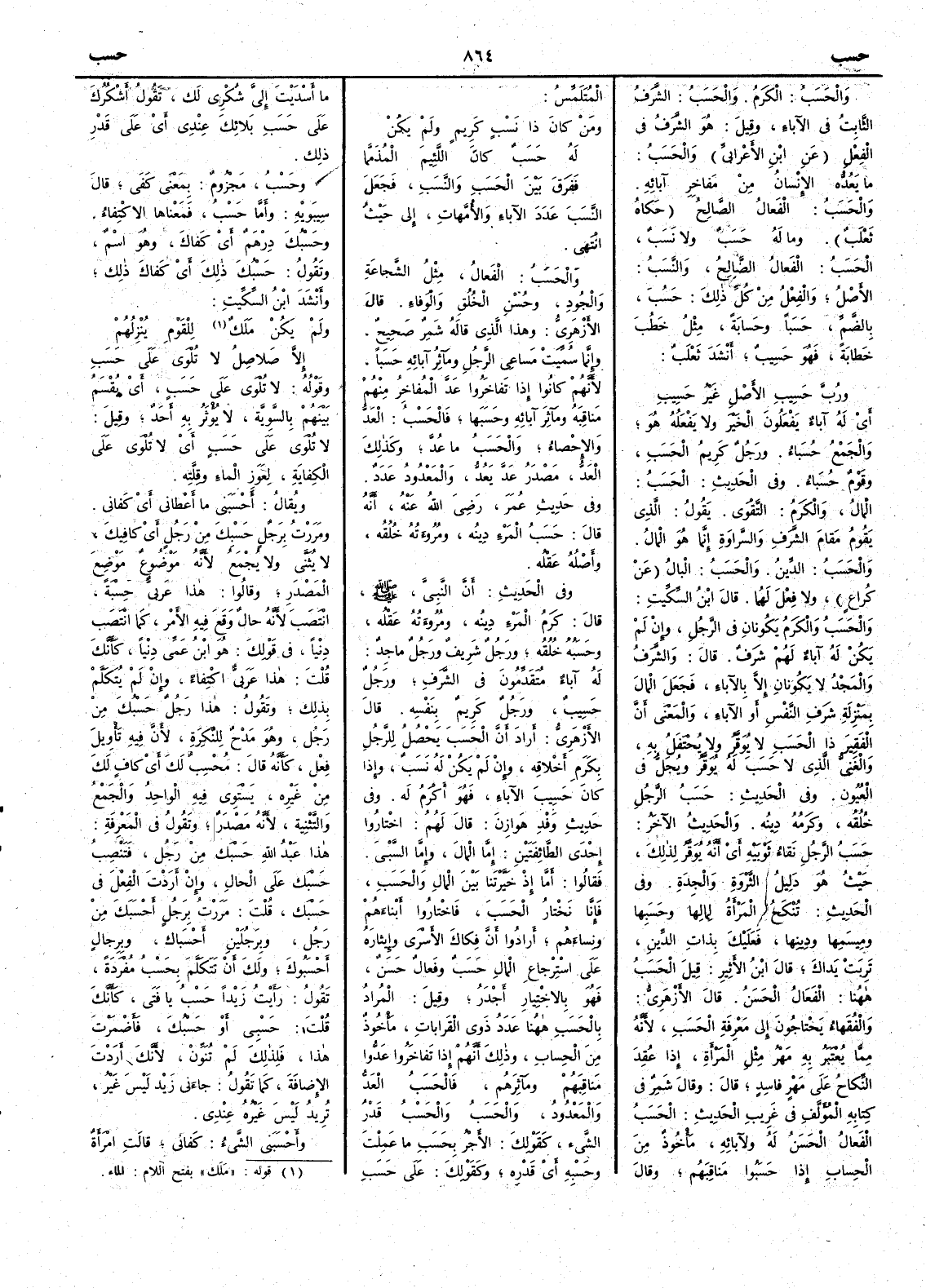 ففَرقَ بَين الحَسَبِ والنَّسَبِ فجعل النَّسَبَ عدَد الآباءِ والأُمهاتِ إِلى حيث انْتَهى والحَسَبُ الفَعالُ مثل الشَّجاعةِ والجُود وحُسْنِ الخُلُقِ والوَفاءِ قال الأَزهري وهذا الذي قاله شمر صحيح وإِنما سُميت مَساعِي الرجُل ومآثِرُ آبائه حَسَباً لأَنهم كانوا إِذا تَفاخَرُوا عَدَّ المُفاخِرُ منهم مَناقِبَه ومَآثِرَ آبائه وحَسَبها فالحَسْبُ العَدُّ والإِحْصاءُ والحَسَبُ ما عُدَّ وكذلك العَدُّ مصدر عَدَّ يَعُدُّ والمَعْدُودُ عَدَدٌ وفي حديث عمر رضي اللّه عنه أَنه قال حَسَبُ المَرْءِ دِينُه ومُرُوءَتُه خُلُقه وأَصلُه عَقْلُه وفي الحديث أَنَّ النبي صلى اللّه عليه وسلم قال كَرَمُ المَرْءِ دِينُه ومُرُوءَتُه عَقْلُه وحَسَبُه خُلُقُه ورَجُل شَريفٌ ورجُلٌ ماجِدٌ له آباءٌ مُتَقَدِّمون في الشَّرَفِ ورَجُلٌ حَسِيبٌ ورَجُلٌ كرِيمٌ بنفْسِه قال الأَزهري أَراد أَن الحَسَبَ يحصل للرَّجل بكَرم أَخْلاقِه وإِن لم يكن له نَسَبٌ وإِذا كان حَسِيبَ الآباءِ فهو أَكرَمُ له وفي حديث وَفْدِ هَوازِنَ قال لهم اخْتاروا إِحْدَى الطائِفَتَيْنِ إِما المالَ وإِما السَّبْيَ فقالوا أَمَّا إِذْ خَيَّرْتَنا بَيْنَ المالِ والحَسَبِ فإِنَّا نَخْتارُ الحَسَبَ فاخْتاروا أَبْناءَهم ونِساءَهم أَرادوا أَنَّ فِكاكَ الأَسْرَى وإِيثارَه على اسْتِرْجاعِ المالِ حَسَبٌ وفَعالٌ حَسَنٌ فهو بالاختِيار أَجْدَرُ وقيل المراد بالحَسَب ههنا عَدَد ذَوي القَراباتِ مأْخوذ من الحِساب وذلك أَنهم إِذا تَفاخَرُوا عَدُّوا مَناقِبَهم ومآثِرَهم فالحَسَب العَدُّ والمَعْدُود والحَسَبُ والحَسْبُ قَدْرُ الشيءِ كقولك الأَجْرُ بحَسَبِ ما عَمِلْتَ وحَسْبِه أَي قَدْره وكقولك على حَسَبِ ما أَسْدَيْتَ إِليّ شُكْري لك تقول أَشْكُرُكَ على حَسَبِ بلائك عِنْدي أَي على قَدْر ذلك وحَسْبُ مجزوم بمعنى كَفَى قال سيبويه وأَمَّا حَسْبُ فمعناها الاكْتِفاءُ وحَسْبُكَ دِرْهم أَي كَفاكَ وهو اسم وتقول حَسْبُكَ ذلك أَي كفاكَ ذلك وأَنشد ابن السكيت