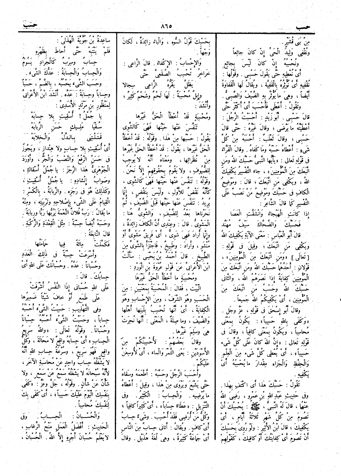 [ ص 314 ] وفي التهذيب حَسِبْتُ الشيءَ أَحْسَبُه حِساباً وحَسَبْتُ الشيءَ أَحْسُبُه حِسْباناً وحُسْباناً وقوله تعالى واللّهُ سَرِيعُ الحِسابِ أَي حِسابُه واقِعٌ لا مَحالَة وكلُّ واقِعٍ فهو سَرِيعٌ وسُرْعةُ حِسابِ اللّه أَنه لا يَشْغَلُه حِسابُ واحد عَن مُحاسَبةِ الآخَر لأَنه سبحانه لا يَشْغَلُه سَمْع عن سمع ولا شَأْنٌ عن شأْنٍ وقوله جل وعز كَفَى بِنَفْسِك اليومَ عليك حَسِيباً أَي كفَى بِك لنَفْسِكَ مُحاسِباً والحُسْبانُ الحِسابُ وفي الحديث أَفْضَلُ العَمَلِ مَنْحُ الرِّغابِ لا يَعْلَمُ حُسْبانَ أَجْرِهِ إِلا اللّهُ الحُسْبانُ