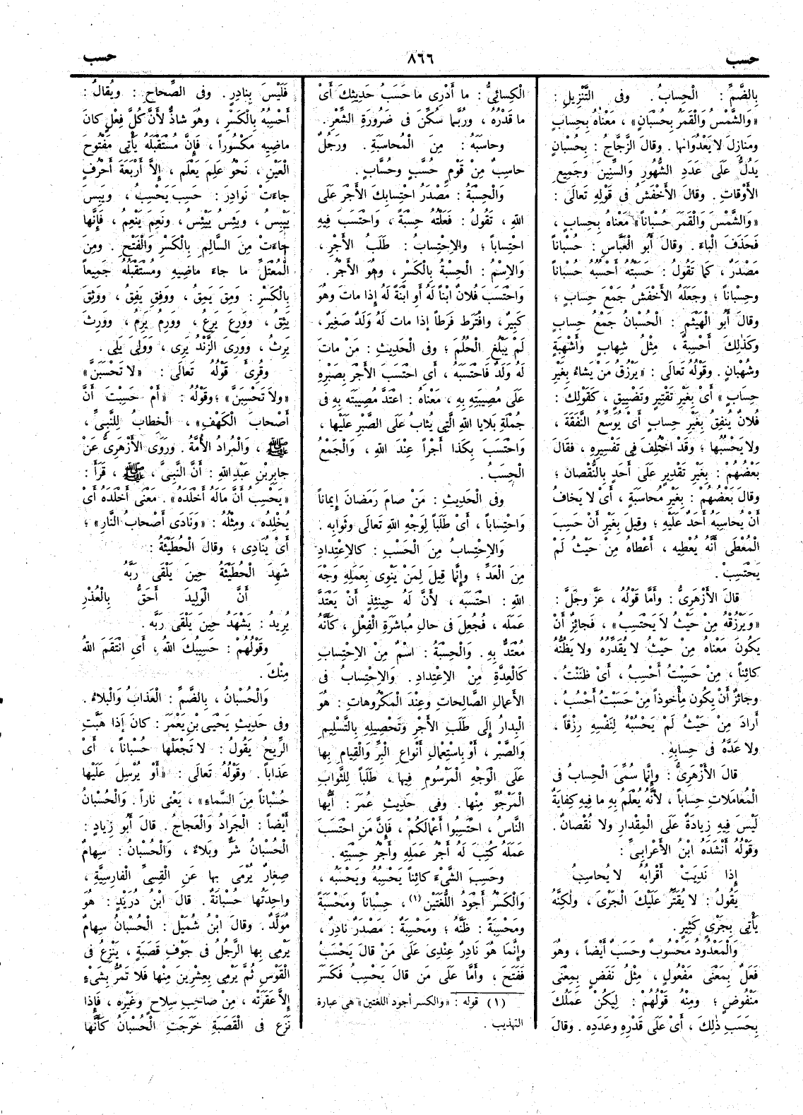 بالضم الحِسابُ وفي التنزيل الشمسُ والقَمَرُ بِحُسْبانٍ معناه بِحِسابٍ ومَنازِلَ لا يَعْدُوانِها وقال الزَجاج بحُسْبانٍ يدل على عَدَد الشهور والسنين وجميع الأَوقات وقال الأَخفش في قوله تعالى والشمسَ والقَمَر حُسْباناً معناه بِحِسابٍ فحذَف الباءَ وقال أَبو العباس حُسْباناً مصدر كما تقول حَسَبْتُه أَحْسُبُه حُسْباناً وحِسْباناً وجعله الأَحفش جمع حِسابٍ وقال أَبو الهيثم الحُسْبانُ جمع حِسابٍ وكذلك أَحْسِبةٌ مِثل شِهابٍ وأَشْهِبةٍ وشُهْبانٍ وقوله تعالى يَرْزُقُ من يشاءُ بغير حساب أَي بغير تَقْتِير وتَضْيِيقٍ كقولك فلان يُنْفِقُ بغير حِساب أَي يُوَسِّعُ النَّفَقة ولا يَحْسُبُها وقد اختُلف في تفسيره فقال بعضهم بغير تقدير على أَحد بالنُّقصان وقال بعضهم بغير مُحاسَبةٍ أَي لا يخافُ أَن يُحاسِبه أَحد عليه وقيل بغير أَنْ حَسِبَ المُعْطَى أَنه يُعْطِيه أَعطاهُ من حَيْثُ لم يَحْتَسِبْ قال الأَزهري وأَما قوله عز وجل ويَرْزُقْه من حَيثُ لا يَحْتَسِبُ فجائز أَن يكون معناه من حَيْثُ لا يُقَدِّره ولا يَظُنُّه كائناً مِن حَسِبْتُ أَحْسِبُ أَي ظَنَنْتُ وجائز أَن يكون مأْخوذاً مِن حَسَبْتُ أَحْسُبُ أَراد مِن حيث لم يَحْسُبْه لنفْسِه رِزقاً ولا عَدَّه في حِسابه قال الأَزهري وإِنما سُمِّي الحِسابُ في المُعامَلاتِ حِساباً لأَنهُ يُعلم به ما فيه كِفايةٌ ليس فيه زيادةٌ على المِقْدار ولا نُقْصان وقوله أَنشده ابن الأَعرابي إِذا نَدِيَتْ أَقْرابُهُ لا يُحاسِبُ يَقول لا يُقَتِّر عليك الجَرْيَ ولكنه يأْتي بِجَرْيٍ كثير والمَعْدُود مَحْسُوبٌ وحَسَبٌ أَيضاً وهو فَعَلٌ بمعنى مَفْعولٍ مثل نَفَضٍ بمعنى مَنْفُوضٍ ومنه قولهم لِيَكُنْ عَمَلُكَ بحَسَبِ ذلك أَي على قَدْرِه وعَدَدِه وقال الكسائي ما أَدري ما حَسَبُ حَدِيثك أَي ما قَدْرُه وربما سكن في ضرورة الشعر وحاسَبَه من المُحاسَبةِ ورجل حاسِبٌ من قَوْمٍ حُسَّبٍ وحُسَّابٍ