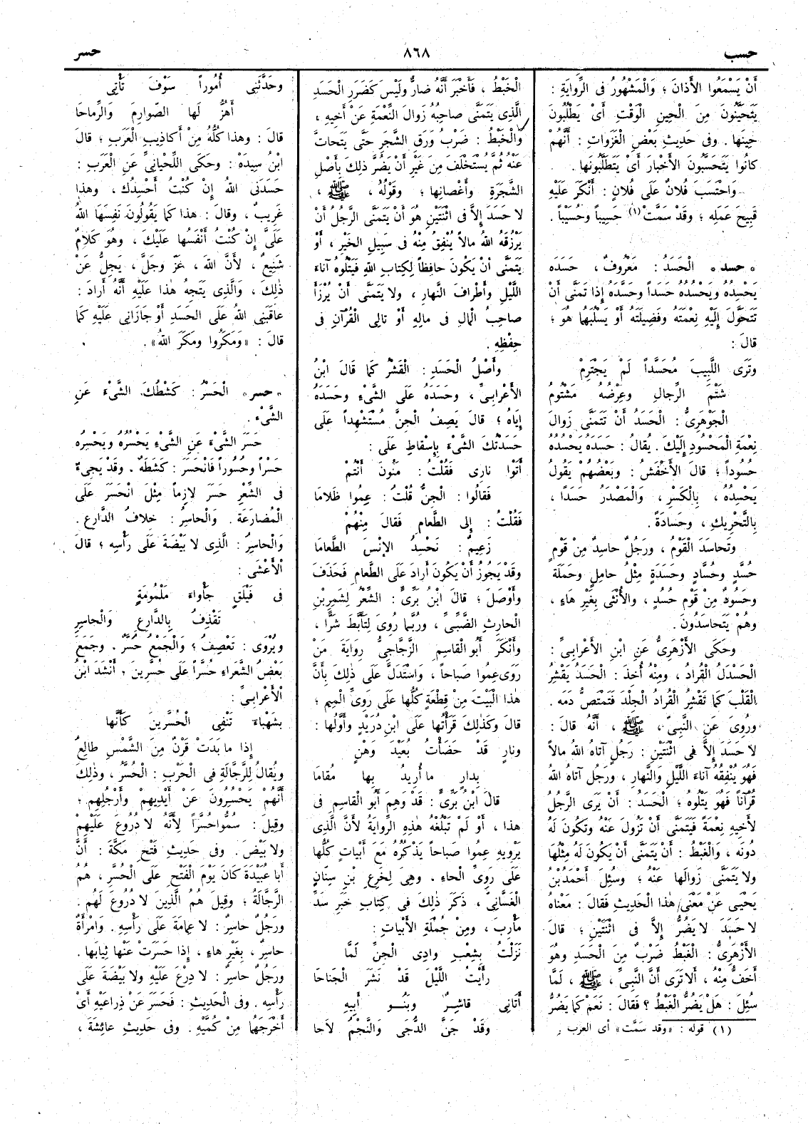 ( حسد ) الحسد معروف حَسَدَه يَحْسِدُه ويَحْسُدُه حَسَداً وحَسَّدَه إِذا تمنى أَن تتحول إِليه نعمته وفضيلته أَو يسلبهما هو قال وترى اللبيبَ مُحَسَّداً لم يَجْتَرِمْ شَتْمَ الرجال وعِرْضُه مَشْتوم الجوهري الحسد أَن تتمنى زوال نعمة المحسود إِليك يقال حَسَدَه يَحْسُدُه حُسوداً قال الأَخفش وبعضهم يقول يحسِده بالكسر والمصدر حسَداً بالتحريك وحَسادَةً وتحاسد القوم ورجل حاسد من قوم حُسَّدٍ وحُسَّادٍ وحَسَدة مثل حامل وحَمَلَة وحَسودٌ من قوم حُسُدٍ والأُنثى بغير هاء وهم يتحاسدون وحكى الأَزهري عن ابن الأَعرابي الحَسْدَلُ القُراد ومنه أُخذ الحسد يقشر القلب كما تقشر القراد الجلد فتمتص دمه وروي عن النبي صلى الله عليه وسلم أَنه قال لا حسد إِلاَّ في اثنتين رجل آتاه الله مالاً فهو ينفقه آناء الليل والنهار ورجل آتاه الله قرآناً فهو يتلوه الحسد أَن يرى الرجل لأَخيه نعمة فيتمنى أَن تزول عنه وتكون له دونه والغَبْطُ أَن يتمنى أَن يكون له مثلها ولا يتمنى زوالها عنه وسئل أَحمد بن يحيى عن معنى هذا الحديث فقال معناه لا حسد لا يضر إِلاَّ في اثنتين قال الأَزهري الغبط ضرب من الحسد وهو أَخف منه أَلا ترى أَن النبي صلى الله عليه وسلم لما سئل هل يضر الغَبْط ؟ فقال نعم كما يضر الخَبْطُ فأَخبر أَنه ضار وليس كضرر الحسد الذي يتمنى صاحبه زوال النعمة عن أَخيه والخبط ضرب ورق الشجر حتى يتحاتَّ عنه ثم يستخلف من غير أَن يضر ذلك بأَصل الشجرة وأَغصانها وقوله صلى الله عليه وسلم لا حسد إِلاَّ في اثنتين هو أَن يتمنى الرجل أَن يرزقه الله مالاً ينفق منه في سبيل الخير أَو يتمنى أَن يكون حافظاً لكتاب الله فيتلوه آناء الليل وأَطراف النهار ولا يتمنى أَن يُرزأَ صاحب المال في ماله أَو تالي القرآن في حفظه وأَصل الحسد القشر كما قال ابن الأَعرابي وحَسَده على الشيء وحسده إِياه قال يصف الجن مستشهداً على حَسَدْتُك الشيءَ بإِسقاط على أَتَوْا ناري فقلتُ مَنُونَ أَنتم فقالوا الجِنُّ قلتُ عِمُوا ظَلاماً فقلتُ إِلى الطعام فقال منهم زَعِيمٌ نَحْسِدُ الإِنس الطعاما وقد يجوز أَن يكون أَراد على الطعام فحذف وأَوصل قال ابن بري الشعر لشمر بن الحرث الضبي وربما روي لتأَبط شرّجاً وأَنكر أَبو القاسم الزجاجي رواية من روى عِموا صباحاً واستدل على ذلك بأَن هذا البيت من قطعة كلها على رويّ الميم قال وكذلك قرأْتها على ابن دريد وأَولها ونارٍ قد حَضَأْتُ بُعَيْدَ وَهْنٍ بدارٍ ما أُريدُ بها مُقاما قال ابن بري قد وهم أَبو القاسم في هذا أَو لم تبلغه هذه الرواية لأَن الذي يرويه عِموا صباحاً يذكره مع أَبيات كلها على روي الحاء وهي لِخَرِع بن سنان الغساني ذكر ذلك في كتاب خبر سَدّ مَأْرِبَ ومن جملة الأَبيات نزلتُ بِشعْبِ وادي الجنِّ لَمَّا رأَيتُ الليلَ قد نَشَرَ الجناحا أَتاني قاشِرٌ وبَنُو أَبيه وقد جَنَّ الدُّجى والنجمُ لاحا وحدَّثني أُموراً سوف تأْتي أَهُزُّ لها الصَّوارمَ والرِّماحا قال وهذا كله من أَكاذيب العرب قال ابن سيده وحكى اللحياني عن العرب حسدني الله إِن كنت أَحسدك وهذا غريب وقال هذا كما يقولون نَفِسَها الله عليَّ إِن كنت أَنْفَسُها عليك وهو كلام شنيع لأَن الله عز وجل يجل عن ذلك والذي يتجه هذا عليه أَنه أَراد عاقبني الله على الحسد أَو جازاني عليه كما قال ومكروا ومكر الله