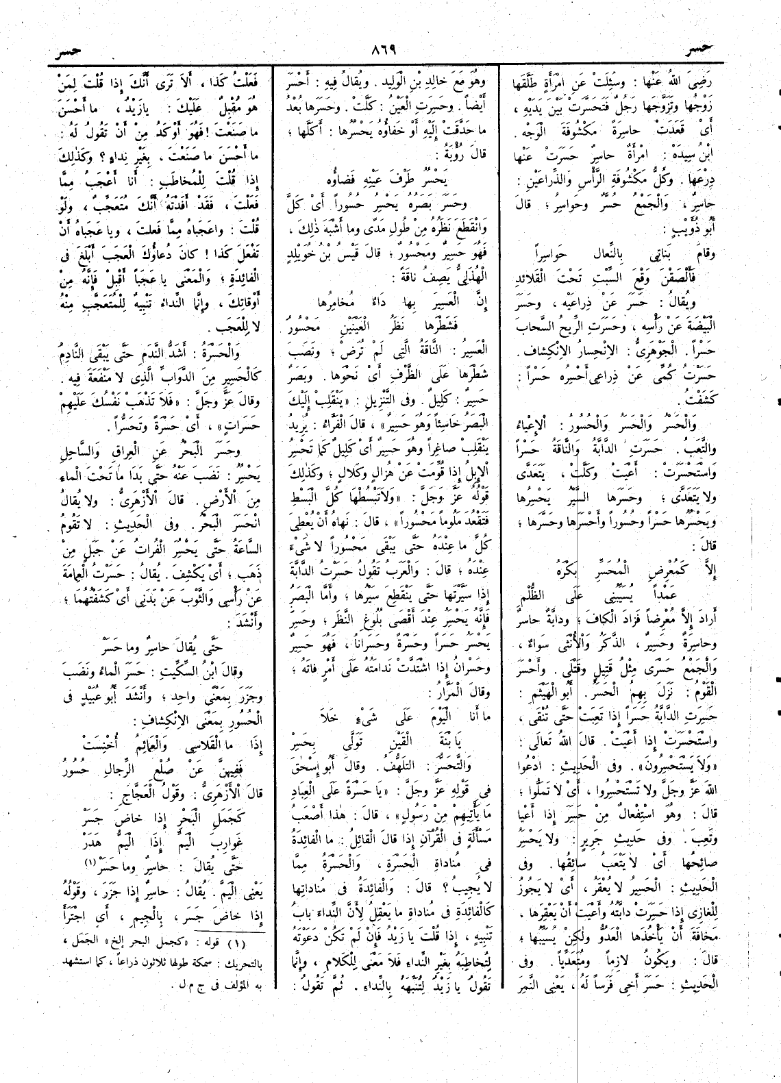 رضي الله عنها وسئلتْ عن امرأَة طلقها زوجها وتزّوجها رجل فَتَحَسَّرَتْ بين يديه أَي قعدت حاسرة مكشوفة الوجه ابن سيده امرأَة حاسِرٌ حَسَرَتْ عنها درعها وكلُّ مكشوفة الرأْس والذراعين حاسِرٌ والجمع حُسَّرٌ وحَواسِر قال أَبو ذؤيب وقامَ بَناتي بالنّعالِ حَواسِراً فأَلْصَقْنَ وَقْعَ السِّبْتِ تحتَ القَلائدِ ويقال حَسَرَ عن ذراعيه وحَسَرَ البَيْضَةَ عن رأْسه وحَسَرَتِ الريحُ السحابَ حَسْراً الجوهري الانحسار الانكشاف حَسَرْتُ كُمِّي عن ذراعي أَحْسِرُه حَسْراً كشفت والحَسْرُ والحَسَرُ والحُسُورُ الإِعْياءُ والتَّعَبُ حَسَرَتِ الدابةُ والناقة حَسْراً واسْتَحْسَرَتْ أَعْيَثْ وكَلَّتْ يتعدّى ولا يتعدى وحَسَرَها السير يَحْسِرُها ويَحْسُرها حَسْراً وحُسُوراً وأَحْسَرَها وحَسَّرَها قال إِلاَّ كَمُعْرِضِ المُحَسِّر بَكْرَهُ عَمْداً يُسَيِّبُنِي على الظُّلْمِ أَراد إِلاَّ مُعرضاً فزاد الكاف ودابة حاسِرٌ حاسِرَةٌ وحَسِيرٌ الذكر والأُنثى سواء والجمع حَسْرَى مثل قتيل وقَتْلَى وأَحْسَرَ القومُ نزل بهم الحَسَرُ أَبو الهيثم حَسِرَتِ الدابة حَسَراً إِذا تعبت حتى تُنْقَى واسْتَحْسَرَتْ إِذا أَعْيَتْ قال الله تعالى ولا يَسْتَحْسِروُن وفي الحديث ادْعُوا الله عز وجل ولا تَسْتَخْسِرُوا أَي لا تملوا قال وهو استفعال من حَسَرَ إِذا أَعيا وتعب وفي حديث جرير ولا يَحْسَِرُ صائحها أَي لا يتعب سائقها وفي الحديث الحَسِيرُ لا يُعْقَرُ أَي لا يجوز للغازي إِذا حَسَِرَتْ دابته وأَعيت أَن يَعْقِرَها مخافة أَن يأْخذها العدوّ ولكن يسيبها قال ويكون لازماً ومتعدياً وفي الحديث حَسَرَ أَخي فرساً له يعني النَّمِرَ وهو مع خالد بن الوليد ويقال فيه أَحْسَرَ أَيضاً وحَسِرَتِ العين كَلَّتْ وحَسَرَها بُعْدُ ما حَدَّقَتْ إِليه أَو خفاؤُه يَحْسُرُها أَكَلَّها قال رؤبة يَحْسُرُ طَرْفَ عَيْنِه فَضاؤُه وحَسَرَ بَصَرُه يَحْسِرُ حُسُوراً أَي كَلَّ وانقطع نظره من طول مَدًى وما أَشبه ذلك فهو حَسِير ومَحْسُورٌ قال قيس بن خويلد الهذلي يصف ناقة إِنَّ العَسِيرَ بها دَاءٌ مُخامِرُها فَشَطْرَها نَظَرُ العينينِ مَحْسُورُ العسير الناقة التي لم تُرَضْ ونصب شطرها على الظرف أَي نَحْوَها وبَصَرٌ حَسير كليل وفي التنزيل ينقلب إِليك البصر خاسئاً وهو حَسِيرٌ قال الفراء يريد ينقلب صاغراً وهو حسير أَي كليل كما تَحْسِرُ الإِبلُ إِذا قُوِّمَتْ عن هُزال وكَلالٍ وكذلك قوله عز وجل ولا تَبْسُطْها كُلَّ البَسْطِ فَتَقْعُدَ مَلُوماً مَحْسُوراً قال نهاه أَن يعطي كل ما عنده حتى يبقى محسوراً لا شيء عنده قال والعرب تقول حَسَرْتُ الدابة إِذا سَيَّرتها حتى ينقطع سَيْرُها وأَما البصر فإِنه يَحْسَِرُ عند أَقصى بلوغ النظر وحَسِرَ يَحْسَرُ حَسَراً وحَسْرَةً وحَسَراناً فهو حَسِيرٌ وحَسْرانُ إِذا اشتدّت ندامته على أَمرٍ فاته وقال المرّار ما أَنا اليومَ على شيء خَلا يا ابْنَة القَيْن تَوَلَّى بِحَسِرْ والتَّحَسُّر التَّلَهُّفُ وقال أَبو اسحق في قوله عز وجل يا حَسْرَةً على العباد ما يأْتيهم من رسول قال هذا أَصعب مسأَلة في القرآن إِذا قال القائل ما الفائدة في مناداة الحسرة والحسرة مما لا يجيب ؟ قال والفائدة في مناداتها كالفائدة في مناداة ما يعقل لأَن النداء باب تنبيه إِذا قلت يا زيد فإِن لم تكن دعوته لتخاطبه بغير النداء فلا معنى للكلام وإِنما تقول يا زيد لتنبهه بالنداء ثم تقول فعلت كذا أَلا ترى أَنك إِذا قلت لمن هو مقبل عليك يا زيد ما أَحسن ما صنعت فهو أَوكد من أَن تقول له ما أَحسن ما صنعت بغير نداء وكذلك إِذا قلت للمخاطَب أَنا أَعجب مما فعلت فقد أَفدته أَنك متعجب ولو قلت واعجباه مما فعلت ويا عجباه أَن تفعل كذا كان دعاؤُك العَجَبَ أَبلغ في الفائدة والمعنى يا عجبا أَقبل فإِنه من أَوقاتك وإِنما النداء تنبيه للمتعجَّب منه لا للعجب والحَسْرَةُ أَشدَّ الندم حتى يبقى النادم كالحَسِيرِ من الدواب الذي لا منفعة فيه 