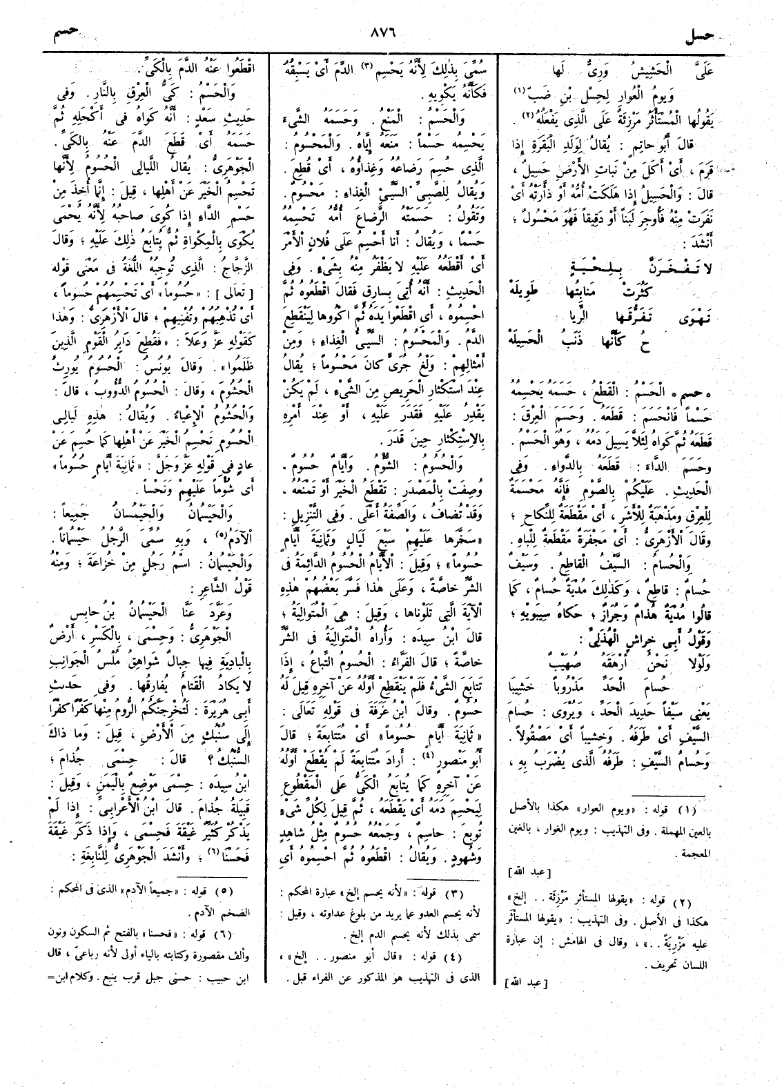 ( * قوله « لأنه يحسم إلخ » عبارة المحكم لأنه يحسم العدو عما يريد من بلوغ عداوته وقيل سمي بذلك لأنه يحسم الدم إلخ ) الدم أَي يسبقه فكأَنه يكويه والحَسْمُ المنع وحَسَمَه الشيءَ يَحْسِمُهُ حَسْماً منعه إياه والمَحْسُومُ الذي حُسِمَ رَضاعُه وغِذاؤُه أَي قُطِعَ ويقال للصبي السَّيِّء الغذاء مَحسُومٌ وتقول حَسَمَتْه الرَّضاعَ أُمُّه تَحْسِمُهُ حَسْماً ويقال أَنا أَحْسِمُ على فلان الأَمر أَي أَقطعه عليه لا يَظْفَرُ منه بشيء وفي الحديث أَنه أُتيَ بسارق فقال اقْطعوه ثم احْسِموه أَي اقطعوا يده ثم اكووها لينقطع الدم والمَحْسومُ السَّيِّءُ الغِذاء ومن أَمثالهم وَلْغُ جُرَيٍّ كان مَحْسوماً يقال عند استكثار الحريص من الشيء لم يكن يَقْدِرُ عليه فقَدَرَ عليه أَو عند أَمره بالإستكثار حين قَدَرَ والحُسُوم الشُّؤْمُ وأَيام حُسومٌ وصفت بالمصدر تقطع الخيرَ أَو تمنعه وقد تضاف والصفة أَعلى وفي التنزيل سَخَّرَها عليهم سبعَ ليالٍ وثمانيةَ أَيامٍ حُسوماً وقيل الأَيام الحُسومُ الدائمة في الشر خاصةً وعلى هذا فسر بعضهم هذه الآية التي تلوناها وقيل هي المُتَواليةُ قال ابن سيده وأُراه المتوالية في الشر خاصةً قال الفراء الحُسومُ التِّباعُ إذا تَتابع الشيءُ فلم ينقطع أَولهُ عن آخره قيل له حُسومٌ وقال ابن عرفة في قوله ثمانية أَيام حُسوماً أَي متتابعة قال أَبو منصور أَراد متتابعة لم يُقطع أَوله عن آخره كما يُتابَعُ الكَيُّ على المقطوع ليَحْسِمَ دمَهُ أَي يقطعه ثم قيل لكل شيء تُوبِعَ حاسِمٌ وجمعه حُسومٌ مثل شاهِدٍ وشُهودٍ ويقال اقطعوه ثم احْسِموهُ أَي اقطعوا عنه الدم بالكي والحَسْمُ كَيُّ العِرْقِ بالنار وفي حديث سَعْدٍ أَنه كواه في أَكْحَلِهِ ثم حَسَمَهُ أَي قطع الدم عنه بالكَيّ الجوهري يقال الليالي الحُسُومُ لأنها تَحْسِمُ الخير عن أَهلها قيل إنما أُخِذَ من حَسْمِ الداء إذا كُوِيَ صاحبُه لأَنه يُحْمَى يُكوى بالمِكْواة ثم يتابَعُ ذلك عليه وقال الزجاج الذي توجِبُه اللغةُ في معنى قوله حُسوماً أَي تَحْسِمُهُمْ حُسوماً أَي تُذْهبهم وتُفْنيهم قال الأَزهري وهذا كقوله عز وعلا فقُطِعَ دابرُ القومِ الذين ظلموا وقال يونس الحُسُومُ يورِثُ الحُشومَ وقال الحُسومُ الدُّؤوبُ قال والحُشومُ الإعْياءُ ويقال هذه ليالي الحُسوم تَحْسِمُ الخيرَ عن أَهلها كما حُسِمَ عن عاد في قوله عز وجل ثمانية أَيام حُسوماً أَي شُؤْماً عليهم ونَحْساً والحَيْسُمانُ والحَيْمُسان جميعاً الآدَمُ