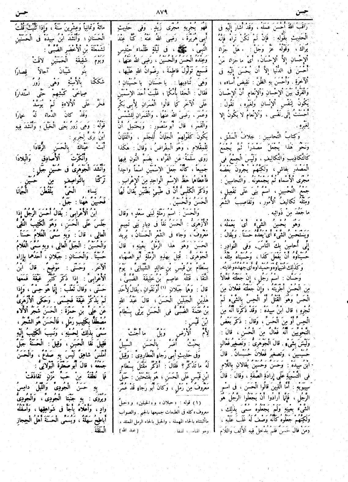 راقَبَ اللهَ أَحسَن عمَله وقد أَشار إليه في الحديث بقوله فإن لم تكن تراه فإِنه يراك وقوله عز وجل هل جزاءُ الإحسان إلا الإحسان أَي ما جزاءُ مَنْ أَحْسَن في الدُّنيا إلا أَن يُحْسَنَ إليه في الآخرة وأَحسَنَ به الظنَّ نقيضُ أَساءَه والفرق بين الإحسان والإنعام أَن الإحسانَ يكون لنفسِ الإنسان ولغيره تقول أَحْسَنْتُ إلى نفسي والإنعامُ لا يكون إلا لغيره وكتابُ التَّحاسين خلاف المَشْق ونحوُ هذا يُجْعَل مصدراً في المصدر كالتَّكاذِيب والتَّكاليف وليس الجمعُ في المصدر بفاشٍ ولكنهم يُجْرُون بعضه مُجْرى الأَسماء ثم يجمعونه والتَّحاسينُ جمعُ التَّحْسِين اسم بُنِيَ على تَفْعيل ومثلُه تَكاليفُ الأُمور وتَقاصيبُ الشَّعَرِ ما جَعُدَ مِنْ ذَوائِبه وهو يُحْسِنُ الشيءَ أَي يَعْمَلَه ويَسْتَحْسِنُ الشيءَ أَي يَعُدُّه حَسَناً ويقال إني أُحاسِنُ بك الناسَ وفي النوادر حُسَيْناؤُه أن يفعل كذا وحُسَيْناه مِثْلُه وكذلك غُنَيْماؤه وحُمَيْداؤه أَي جُهْدُه وغايتُه وحَسَّان اسم رجل إن جعلته فعَّالاً من الحُسْنِ أَجْرَيْتَه وإن جَعَلْتَه فَعْلاَنَ من الحَسِّ وهو القَتْل أَو الحِسِّ بالشيء لم تُجْرِه قال ابن سيده وقد ذكرنا أَنه من الحِسِّ أَو من الحَسِّ وقال ذكر بعض النحويين أَنه فَعَّالٌ من الحُسْنِ قال وليس بشيء قال الجوهري وتصغيرُ فعَّالٍ حُسَيْسِين وتصغيرُ فَعْلانَ حُسَيْسان قال ابن سيده وحَسَنٌ وحُسَيْن يقالانِ باللام في التسمية على إرادة الصفة وقال قال سيبويه أَما الذين قالوا الحَسَن في اسم الرجل فإنما أَرادوا أَن يجعلوا الرجلَ هو الشيءَ بعينه ولم يَجْعلوه سُمِّيَ بذلك ولكنهم جعلوه كأَنه وصفٌ له غَلَب عليه ومن قال حَسَن فلم يُدْخِل فيه الأَلفَ واللامَ فهو يُجْريه مُجْرَى زيدٍ وفي حديث أَبي هريرة رضي الله عنه كنا عند النبي صلى الله عليه وسلم في ليلةٍ ظَلْماءَ حِنْدِسٍ وعندَه الحَسَنُ والحُسَيْنُ رضي الله عنهما فسَمِعَ تَوَلْوُلَ فاطمةَ رضوانُ الله عليها وهي تُنادِيهما يا حَسَنانِ يا حُسَيْنانِ فقال الْحَقا بأُمّكما غَلَّبَت أَحدَ الإسمين على الآخر كما قالوا العُمَران لأَبي بكر وعمر رضي الله عنهما والقَمَران للشمس والقمر قال أَبو منصور ويحتمل أَن يكون كقولهم الجَلَمانُ للجَلَم والقَلَمانُ للمِقْلامِ وهو المِقْراضُ وقال هكذا روى سلمة عن الفراء بضم النون فيهما جميعاً كأَنه جعل الاسمين اسماً واحداً فأَعطاهما حظ الاسم الواحد من الإعراب وذكر الكلبي أَن في طيِّء بَطْنَيْن يقال لهما الحسَن والحُسَيْن والحَسَنُ اسمُ رملة لبني سَعْد وقال الأَزهري الحَسَنُ نَقاً في ديار بني تميم معروف وجاء في الشعر الحَسَنانُ يريد الحَسَنَ وهو هذا الرملُ بعينه قال الجوهري قُتِل بهذه الرملة أَبو الصَّهْباء بِسْطامُ بنُ قيْس بنِ خالدٍ الشَّيْبانيِّ يَوْمَ النَّقَا قتَله عاصِمُ بن خَلِيفةَ الضَّبِّي قال وهما جَبَلانِ أَو نَقَوانِ يقال لأَحد هذين الجَبَلَيْن الحَسَن قال عبد الله بن عَنَمة الضَّبّيّ في الحَسَن يَرْثِي بِسْطَامَ بنَ قَيْس لأُمِّ الأَرضِ وَيْلٌ ما أَجَنَّتْ بحيثُ أَضَرَّ بالحَسَنِ السَّبيلُ وفي حديث أَبي رَجاء العُطارِدِيِّ وقيل له ما تَذْكُر ؟ فقال أَذْكُرُ مَقْتَلَ بِسْطام بنِ قَيْسٍ على الحَسَنِ هو بفتحتين جَبَل معروف من رمل وكان أَبو رجاء قد عُمِّر مائةً وثمانِياً وعشرين سَنَةً وإذا ثنّيت قلت الحَسَنانِ وأَنشد ابن سيده في الحَسَنين لشَمْعَلة بن الأَخْضَر الضَّبِّيّ ويوْمَ شَقيقةِ الحَسَنَيْنِ لاقَتْ بَنُو شَيْبان آجالاً قِصارا شَكَكْنا بالأَسِنَّة وهْيَ زُورٌ صِماخَيْ كَبْشِهم حتى اسْتَدارا فَخَرَّ على الأَلاءةِ لم يُوَسَّدْ وقد كان الدِّماءُ له خِمارا قوله وهي زُورٌ يعني الخيلَ وأَنشد فيه ابنُ بري لجرير أَبَتْ عيْناكِ بالحَسَنِ الرُّقادا وأَنْكَرْتَ الأَصادِقَ والبِلادا وأَنشد الجوهري في حُسَيْن جبل تَركْنَا بالنَّواصِف من حُسَيْنٍ نسا
