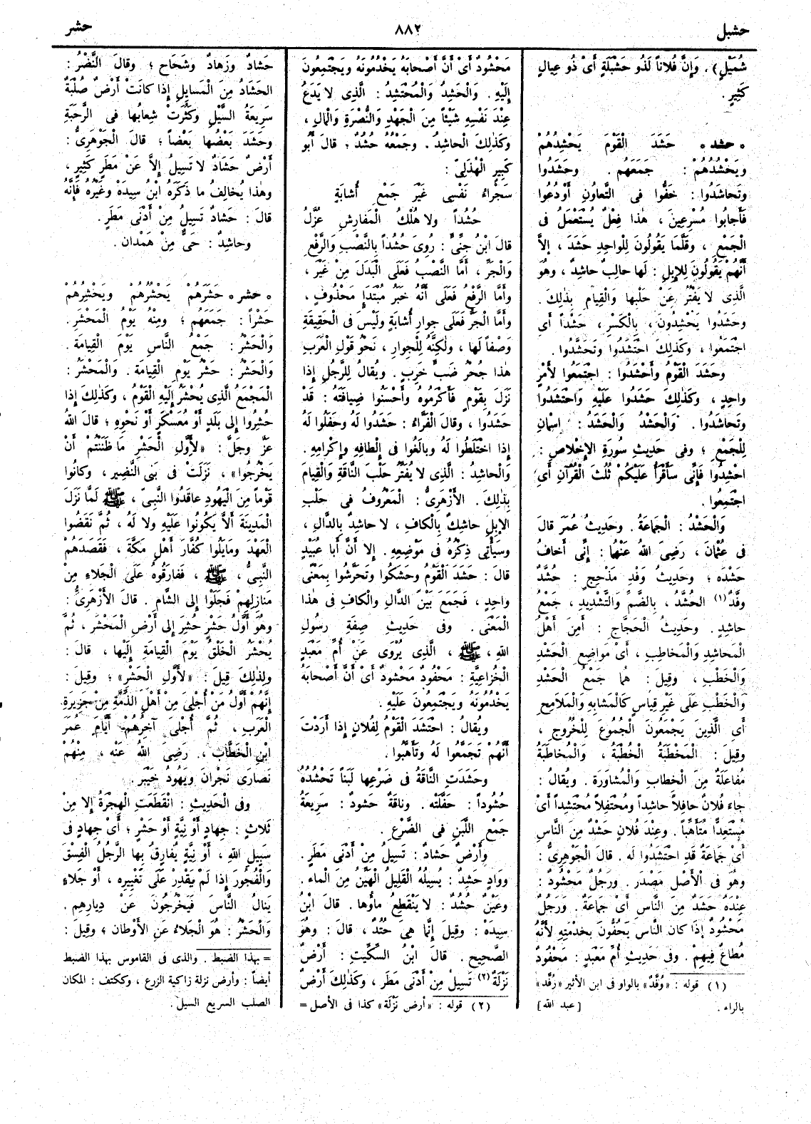 شميل وإِن فلاناً لَذُو حَشْبَلة أَي ذو عِيال كثير ( حشد ) حَشَدَ القومَ يَحْشِدُهم ويَحْشُدُهم جمعهم وحَشَدوا وتحاشدوا خفوا في التعاون أَو دُعُوا فأَجابوا مسرعين هذا فعل يستعمل في الجمع وقلما يقولون للواحد حَشَد إِلاَّ أَنهم يقولون للإِبل لها حالب حاشد وهو الذي لا يَفْتُرُ عن حَلْبها والقيام بذلك وحَشَدوا يَحْشِدون بالكسر حَشْداً أَي اجتمعوا وكذلك احتشدوا وتحشدوا وحَشَدَ القوم وأَحْشَدوا اجتمعوا لأَمر واحد وكذلك حَشَدوا عليه واحْتَشَدوا وتحاشدوا والحَشْدُ والحَشَدُ اسمان للجمع وفي حديث سورة الإِخلاص احشِدوا فإِني سأَقرأُ عليكم ثلث القرآن أَي اجتمعوا والحشْد الجماعة وحديث عمر قال في عثمان رضي الله عنهما إِني أَخاف حَشْدَه وحديث وَفْدِ مَذْحِج حُشَّدٌ وُفَّدٌ الحُشَّد بالضم والتشديد جمع حاشد وحديث الحجاج أَمنَ أَهلُ المَحاشد والمَخاطب أَي مواضع الحَشْدِ والخَطْب وقيل هما جمع الحشد والخطب على غير قياس كالمَشابه والمَلامح أَي الذين يجمعون الجموع للخروج وقيل المَخْطَبَةُ الخُطْبَةُ والمخاطبة مفاعلة من الخطاب والمشاورة ويقال جاء فلان حافلاً حاشداً ومحتفلاً محتشداً أَي مستعداً متأَهباً وعند فلان حَشْدٌ من الناس أَي جماعة قد احتشدوا له قال الجوهري وهو في الأَصل مصدر ورجل محشود عنده حَشَدٌ من الناس أَي جماعة ورجل محشود إِذا كان الناس يَحُفُّون بخدمته لأَنه مطاع فيهم وفي حديث أُم معبد محفود محشود أَي أَن أَصحابه يخدمونه ويجتمعون إِليه والحَشِدُ والمحتَشِدُ الذي لا يدع عند نفسه شيئاً من الجَهْدِ والنُّصْرَة والمال وكذلك الحاشد وجمعه حُشُدٌ قال أَبو كبير الهذلي سَجْراء نفسي غيرَ جَمْعِ أُشابَةٍ حُشُداً ولا هُلْك المفارش عُزَّل قال ابن جني روي حُشُداً بالنصب والرفع والجر أَما النصب فعلى البدل من غير وأَما الرفع فعلى أَنه خبر متبدإِ محذوف وأَما الجر فعلى جوار أُشابة وليس في الحقيقة وصفاً لها ولكنه للجوار نحو قول العرب هذا جُحْرُ ضَبٍّ خربٍ ويقال للرجل إِذا نزل بقوم فأَكرموه وأَحسنوا ضيافته قد حَشَدوا وقال الفراء حَشَدوا له وحَفَلوا له إِذا اختلطوا له وبالغوا في إِلطافه وإِكرامه والحاشدُ الذي لا يُفَتِّرُ حَلْبَ الناقة والقيامَ بذلك الأَزهري المعروف في حلب الإِبل حاشك بالكاف لا حاشد بالدال وسيأْتي ذكره في موضعه إِلا أَن أَبا عبيد قال حَشَدَ القومُ وحَشَكوا وتحرّشوا بمعنى واحد فجمع بين الدال والكاف في هذا المعنى وفي حديث صفة رسول الله صلى الله عليه وسلم الذي يروى عن أُم معبد الخزاعية محفود محشود أَي أَن أَصحابه يخدمونه ويجتمعون عليه ويقال احتشد القوم لفلان إِذا أَردت أَنهم تجمعوا له وتأَهبوا وحَشَدَت الناقةُ في ضرعها لبناً تَحْشُده حُشوداً حَفَّلته وناقة حَشود سريعة جمع اللبن في الضرع وأَرض حَشاد تسيل من أَدنى مطر وواد حَشِدٌ يُسيله القليل الهَيِّن من الماء وعين حُشُدٌ لا ينقطع ماؤها قال ابن سيده وقيل إِنما هي حُتُدٌ قال وهو الصحيح قال ابن السكيت أَرض نَزْلةٌ