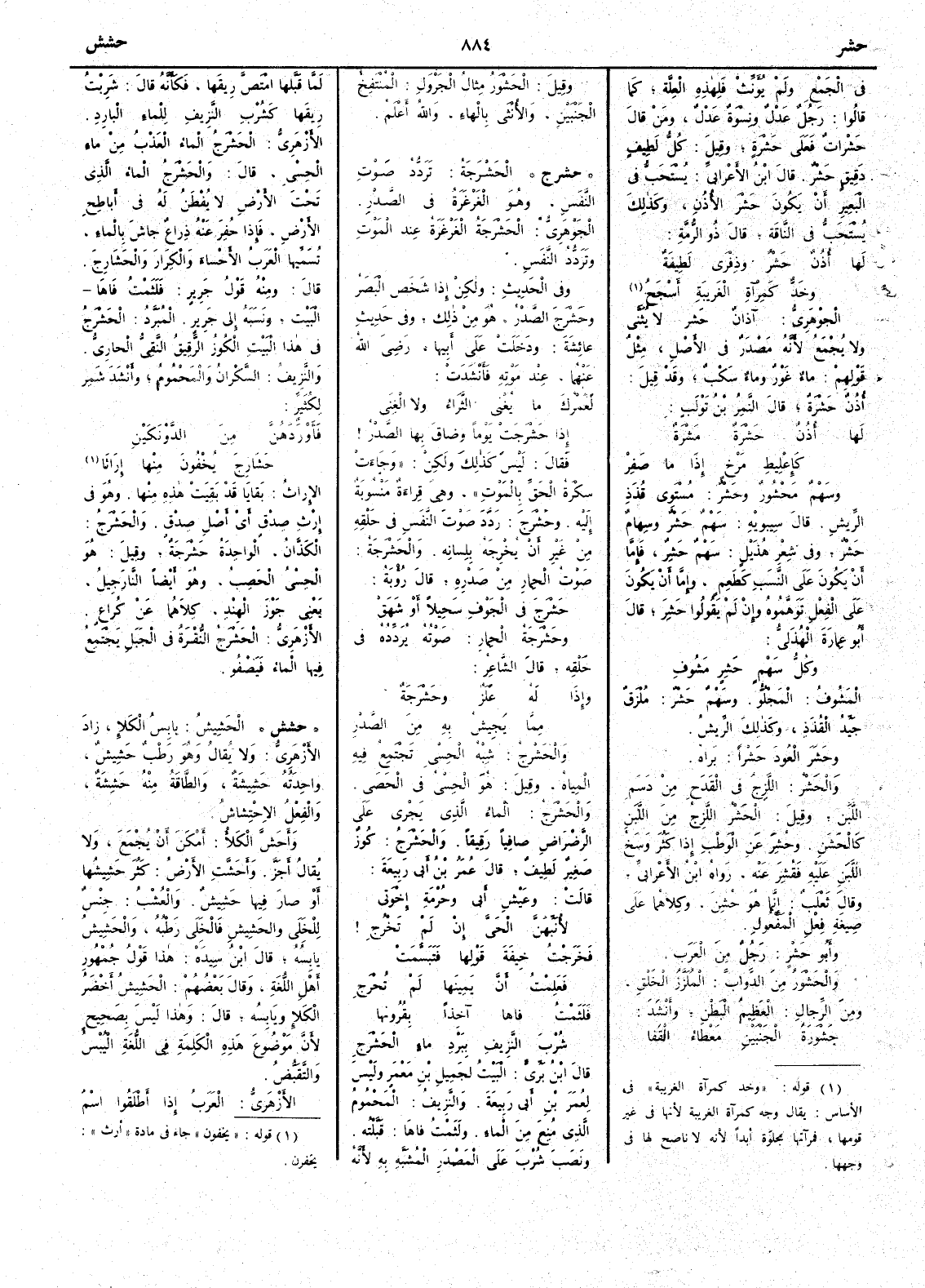 الجوهري آذان حَشْرٌ لا يثنى ولا يجمع لأَنه مصدر في الأَصل مثل قولهم ماء غَوْرٌ وماء سَكْبٌ وقد قيل أُذن حَشْرَةٌ قال النمر بن تولب لها أُذُنٌ حَشْرَةٌ مَشْرَةٌ كإِعْلِيط مَرْخٍ إِذا ما صَفِرْ وسهم مَحْشُورُ وحَشْرٌ مستوي قُذَذِ الرِّيشِ قال سيبويه سهم حَشْرٌ وسهام حَشْرٌ وفي شعر هذيل سهم حَشِرٌ فإِما أَن يكون على النسب كطَعِمٍ وإِما أَن يكون على الفعل توهموه وإِن لم يقولوا حَشِرَ قال أَبو عمارة الهذلي وكلُّ سهمٍ حَشِرٍ مَشُوفِ المشوف المَجْلُوُّ وسهم حَشْرٌ مُلْزَقٌ جيد القُذَذِ وكذلك الريش وحَشَرَ العودَ حَشْراً براه والحَشْرُ اللَّزجُ في القَدَحِ من دَسَمِ اللبنِ وقيل الحَشْرُ اللَّزِجُ من اللبن كالحَشَنِ وحُشِرَ عن الوَطْبِ إذا كثر وسخ اللبن عليه فَقُشِرَ عنه رواه ابن الأَعرابي وقال ثعلب إِنما هو حُشِنَ وكلاهما على صيغة فعل المفعول وأَبو حَشْرٍ رجل من العرب والحَشْوَرُ من الدواب المُلَزَّرِ الخَلْقُ ومن الرجال العظيم البطن وأَنشد حَشْوَرَةُ الجَنْبَيْنِ مَعْطاءُ القفَا وقيل الحَشْوَرُ مثال الجَرْوَلِ المنتفخ الجنبين والأُنثى بالهاء والله أَعلم
