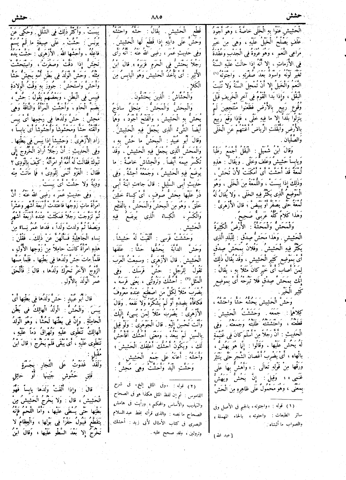 ( * قوله « وفي المثل إلخ » في شرح القاموس ثم إِن لفظ المثل هكذا هو في الصحاح والتهذيب والأساس والمحكم ورأيت في هامش الصحاح ما نصه والذي قرأته بخط عبد السلام البصري في كتاب الأمثال لأبي زيد أَحشك وتروثين وقد صحح عليه ) أَحُشُّكَ وتَرُوثُني يَعْني فرسَه يُضْرَبُ مثَلاً لكلّ من اصطُنِع عنده معروفُ فكافَأَه بضِدِّه أَوْ لَمْ يَشْكُرْه ولا نَفَعه وقال الأَزهري يُضْرب مثَلاً لمن يُسِيء إِليك وأَنت تُحْسن إِليه قال الجوهري ولَوْ قيل بالسين لم يَبْعُدْ ومعنى أَحُشّك أَفَأَحُشّ لك ويكون أَحُشُّك أَعْلِفُك الحشيش وأَحَشَّه أَعانَه على جَمْع الحشيش وحَشَّت اليَدُ وأَحَشَّت وهي مُحِشّ يَبِسَت وأَكثر ذلك في الشَّلَلِ وحُكِي عن يونس حُشّت على صِيغة ما لم يُسمَّ فاعلُه وأَحَشَّها اللَّه الأَزهري حَشَّت يدُه تحِش إِذا دقَّت وصغُرت واستحَشَّت مثله وحَشَّ الولَدُ في بطْن أُمِّه يَحِشُّ حَشّاً وأَحَشَّ واستحَشَّ جُووِزَ به وقْت الوِلادة فيَبِسَ في البَطْن وبعضهم يقول حُشَّ بضمِّ الحاء وأَحَشَّت المرأَة والناقة وهي مُحِشّ خَشَّ ولدُها في رحِمِها أَي يَبِسَ وأَلْقَتْه حَشًّا ومَحْشُوشاً وأُحْشُوشاً أَي يابساً زاد الأَزهري وحَشِيشاً إِذا يبس في بطنها وفي الحديث أَن رجُلاً أَراد الخروج إِلى تبوك فقالت له أُمُّه أَو امرأَته كيف بالوَدِيِّ ؟ فقال الغَزْوُ أَنْمى لِلْوَدِيّ فما مَاتَتْ منه وَدِيّةٌ ولا حَشَّت أَي يَبِسَت وفي حديث عمر رضي اللَّه عنه أَن امرأَة مات زوجُها فاعتدّت أَربعةَ أَشهر وعشْراً ثم تزوّجت رجلاً فمكثت عنده أَربعة أَشهر ونصفاً ثم ولدت ولداً فدعا عمرُ نساءً من نساء الجاهلية فسأَلهن عن ذلك فقلن هذه امرأَة كانت حاملاً من زوجها الأَوّل فلما مات حَشَّ ولدُها في بطنها فلما مسها الزوج الآخر تحرَّك ولدُها قال فَأَلْحَقَ عمر الولدَ بالأَول قال أَبو عبيد حَشَّ ولدُها في بطنها أَي يَبِس والحُشّ الولد الهالك في بطن الحاملة وإَن في بطنها لَحُستّاً وهو الولد الهالك تنطوي عليه وتُهْراق دَماً عليه تنطوي عليه أَي يبقى فلم يخرج قال ابن مقبل ولقد غَدَوْتُ على التِّجارِ بِجَسْرة قَلِقٍ حشُوش جَنِينها أَو حائِل قال وإِذا أَلقت ولدها يابساً فهو الحشيش قال ولا يخرج الحشيش من بطنها حتى يُسْطى عليها وأَما اللحم فإِنه يتقطع فيَبُول حَفْزاً في بولها والعِظام لا تخرج إِلا بعد السَّطْوِ عليها وقال ابن