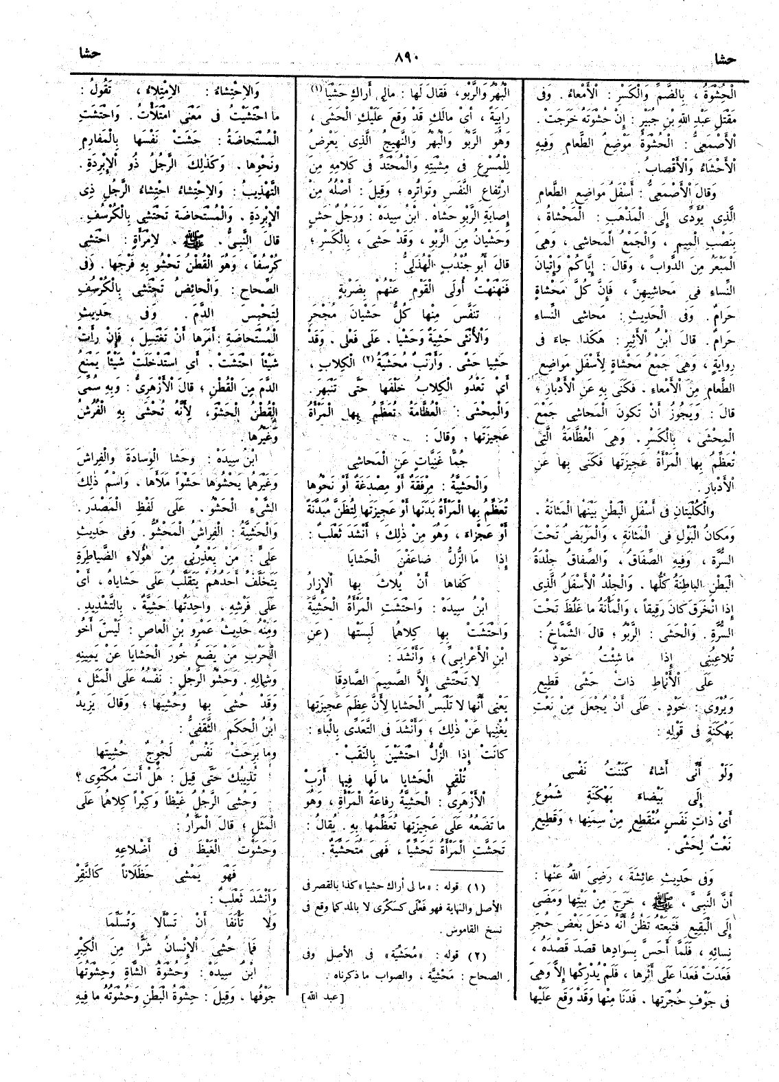 الحُشْوَةُ بالضم والكسر الأَمعاء وفي مَقْتل عبد الله بن جُبَيْر إِنْ حُشْوَتَه خَرَجَت الأَصمعي الحُشْوة موضع الطعام وفيه الأَحْشَاءُ والأَقْصابُ وقال الأَصمعي أَسفلُ مواضع الطعام الذي يُؤدِّي إِلى المَذْهَب المَحْشاةُ بنصب الميم والجمع المَحاشِي وهي المَبْعَرُ من الدواب وقال إِياكم وإِتْيانَ النساءِ في مَحاشِيهنَّ فإِنَّ كُلَّ مَحْشاةٍ حَرامٌ وفي الحديث محاشي النساء حرامٌ قال ابن الأَثير هكذا جاء في رواية وهي جمع مَحْشاة لأَسفل مواضع الطعام من الأَمْعاء فكَنَى به عن الأَدْبار قال ويجوز أَن تكون المَحاشِي جمع المِحْشَى بالكسر وهي العُظَّامَة التي تُعَظِّم بها المرأَة عَجيزتها فكَنَى بها عن الأَدْبار والكُلْيتانِ في أَسفل البطن بينهما المَثانة ومكانُ البول في المَثانة والمَرْبَضُ تحت السُّرَّة وفيه الصِّفَاقُ والصِّفاقُ جلدة البطن الباطنةُ كلها والجلدُ الأَسفل الذي إِذا انخرق كان رقيقاً والمَأْنَةُ ما غَلُظَ تحت السُّرَّة