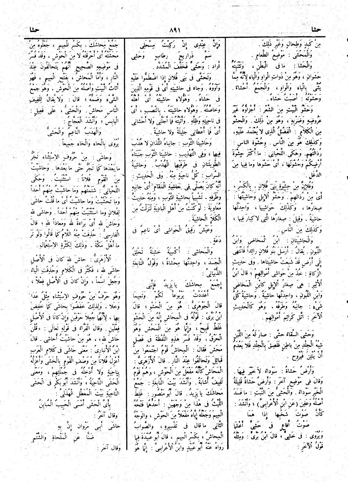 من كبد وطحال وغير ذلك والمَحْشَى موضع الطعام والحَشا ما في البطن وتثنيته حَشَوانِ وهو من ذوات الواو والياء لأَنه مما يثنى بالياء والواو والجمع أَحْشاءٌ وحَشَوْتُه أَصَبْتُ حَشاه وحَشْوُ البيت من الشِّعْر أَجزاؤُه غير عروضه وضربه وهو من ذلك والحَشْوُ من الكلام الفَضْلُ الذي لا يعتمد عليه وكذلك هو من الناس وحُشْوةُ الناس رُذالَتُهم وحكى اللحياني ما أَكثر حِشْوَةَ أَرْضِكم وحُشْوَتها أَي حَشْوَها وما فيها من الدَّغَل وفلان من حِشْوَة بني فلان بالكسر أَي من رُذالهم وحَشْوُ الإِبل وحاشِيَتُها صِغارها وكذلك حواشيها واحدتها حاشِيةٌ وقيل صِغارها التي لا كِبار فيها وكذلك من الناس والحاشِيتانِ ابنُ المَخاض وابن اللَّبُون يقال أَرْسَلَ بنو فلان رائداً فانْتَهى إِلى أَرض قد شَبِعَتْ حاشِيَتاها وفي حديث الزكاة خُذْ من حَوَاشي أَموالهم قال ابن الأَثير هي صِغارُ الإِبل كابن المَخاض وابن اللَّبُون واحدتها حاشِيَةٌ وحاشِيَةُ كل شيءٍ جانبه وطَرَفُه وهو كالحديث الآخر اتَّقِ كرائمَ أَمْوالهم وحَشِيَ السِّقاءُ حَشىً صار له من اللَّبَن شِبْهُ الجِلْدِ من باطن فلَصِقَ بالجلد فلا يَعْدَمُ أَن يُنْتِنَ فيُرْوِحَ وأَرضٌ حَشاةٌ سَوْداء لا خير فيها وقال في موضع آخر وأَرض حَشاةٌ قليلة الخير سوداءُ والحَشِيُّ من النَّبْتِ ما فسَد أَصله وعَفِنَ عن ابن الأَعرابي وأَنشد كأَنَّ صَوْتَ شَخْبِها إِذا هَما صَوتُ أَفاعٍ في حَشِيٍّ أَعْشَما ويروى في خَشِيٍّ قال ابن بري ومثله قول الآخر وإِنَّ عِندي إِن رَكِبْتُ مِسْحَلي سَمَّ ذَراريحَ رِطابٍ وحَشِي أَراد وحَشِيٍّ فخفف المشدد وتحَشَّى في بني فلان إِذا اضْطَمُّوا عليه وآوَوْهُ وجاء في حاشِيَتهِ أَي في قومه الذين في حَشاه وهؤلاء حاشِيَتُه أَي أَهله وخاصَّتُه وهؤلاء حاشِيَته بالنصب أَي في ناحيته وظِلِّه وأَتَيْتُه فما أَجَلَّني ولا أَحْشاني أَي فما أَعطاني جَليلة ولا حاشِيةً وحاشِيَتا الثَّوْبِ جانباه اللذان لا هُدْبَ فيهما وفي التهذيب حاشِيَتا الثوب جَنَبَتاه الطويلتان في طرفيهما الهُدْبُ وحاشِيَةُ السَّراب كل ناحية منه وفي الحديث أَنه كان يُصَلِّي في حاشِيَةِ المَقامِ أَي جانبه وطَرَفه تشبيهاً بحاشِيَة الثوب ومنه حديث مُعاوية لو كنتُ من أَهل البادية لنزلتُ من الكَلإ الحاشيةَ وعَيْشٌ رقيقُ الحَواشي أَي ناعِمٌ في دَعَةٍ والمَحاشي أَكْسية خَشِنة تَحْلِقُ الجَسدَ واحدتها مِحْشاةٌ وقول النابغة الذُّبياني إِجْمَعْ مِحاشَكَ يا يَزِيدُ فإِنني أَعْدَدْتُ يَرْبُوعاً لكم وتَمِيما قال الجوهري هو من الحَشْوِ قال ابن بري قوله في المِحاشِ إِنه من الحَشْوِ غلط قبيح وإِنما هو من المَحْش وهو الحَرْقُ وقد فسر هذه اللفظة في فصل محش فقال المِحاشُ قوم اجتمعوا من قبائل وتحالَفُوا عند النار قال الأَزهري المَحَاشُ كأَنه مَفْعَلٌ من الحَوْشِ وهم قوم لَفِيف أُشابَةٌ وأَنشد بيت النابغة جَمِّعْ مَحاشَك يا يزيد قال أَبو منصور غَلِطَ الليث في هذا من وجهين أَحدهما فتحه الميم وجعله إِياه مَفْعَلاً من الحَوْش والوجه الثاني ما قال في تفسيره والصواب المِحاشُ بكسر الميم قال أَبو عبيدة فيما رواه عنه أَبو عبيد وابن الأَعرابي إِنما هو جَمِّعْ مِحاشَكَ بكسر الميم جعلوه من مَحَشَتْه أَي أَحرقته لا من الحَوْش وقد فُسِّر في موضعه الصحيح أَنهم يتحالفون عند النار وأَما المَحاشُ بفتح الميم فهو أَثاثُ البيت وأَصله من الحَوْش وهو جَمْع الشيء وضَمُّه قال ولا يقال للفِيفِ الناس مَحاشٌ والحَشِيُّ على فَعِيل اليابِسُ وأَنشد العجاج والهَدَب الناعم والحَشِيّ يروى بالحاء والخاء جميعاً وحاشى من حروف الاستثناء تَجُرُّ ما بعدها كما تَجُرُّ حتى ما بعدها وحاشَيْتُ من القوم فلاناً استَثنيْت وحكى اللحياني شَتمْتُهم وما حاشَيْتُ منهم أَحداً وما تحَشَّيْتُ وما حاشَيْتُ أَي ما قلت حاشَى لفلان وما استثنيت منهم أَحداً وحاشَى للهِ وحَاشَ للهِ أَي بَرَاءةً لله و