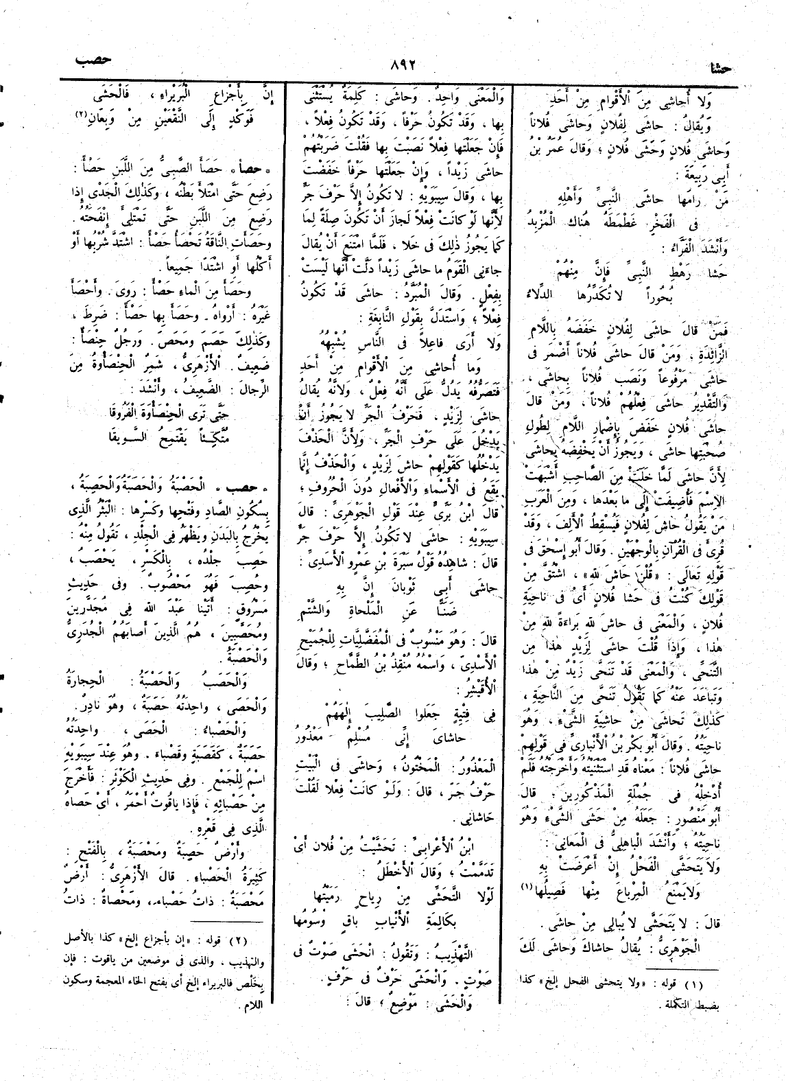 قال لا يَتحَشَّى لا يُبالي من حاشى الجوهري يقال حاشاكَ وحاشى لكَ والمعنى واحد وحاشى كلمة يستثنى بها وقد تكون حرفاً وقد تكون فعلاً فإِن جعلتها فعلاً نصبت بها فقلت ضربتهم حاشى زيداً وإِن جعلتها حرفاً خفضت بها وقال سيبويه لا تكون إِلا حرف جر لأَنها لو كانت فعلاً لجاز أَن تكون صلة لما كما يجوز ذلك في خلا فلما امتنع أَن يقال جاءني القوم ما حاشى زيداً دلت أَنها ليست بفعل وقال المُبرد حاشى قد تكون فعلاً واستدل بقول النابغة ولا أَرى فاعِلاً في الناس يُشْبِهُه وما أُحاشي من الأَقْوام من أَحَدِ فتصرُّفه يدل على أَنه فعل ولأَنه يقال حاشى لزيدٍ فحرف الجر لا يجوز أَن يدخل على حرف الجر ولأَن الحذف يدخلها كقولهم حاشَ لزيدٍ والحذف إِنما يقع في الأَسماء والأفعال دون الحروف قال ابن بري عند قول الجوهري قال سيبويه حاشى لا تكون إِلا حرف جر قال شاهده قول سَبْرة بن عمرو الأَسَدي حاشَى أَبي ثَوْبانَ إِنَّ به ضَنّاً عن المَلْحاة والشَّتْمِ قال وهو منسوب في المُفَضَّلِيّاتِ للجُمَيْح الأَسَدي واسمه مُنْقِذُ بن الطَّمّاح وقال الأُقَيْشِر في فِتْيةٍ جعَلوا الصليبَ إِلَهَهُمْ حاشايَ إِني مُسْلِمٌ مَعْذُورُ المعذور المَخْتُون وحاشَى في البيت حرف جر قال ولو كانت فعلاً لقلت حاشاني ابن الأَعرابي تَحَشَّيْتُ من فلان أَي تَذَمَّمْتُ وقال الأَخطل لولا التَّحَشِّي مِنْ رِياحٍ رَمَيْتُها بكَالِمةِ الأَنْيابِ باقٍ وُسُومُها التهذيب وتقول انْحَشَى صوتٌ في صوتٍ وانْحَشَى حَرْفٌ في حَرْف والحَشَى موضع قال إنَّ بأَجْزاعِ البُرَيْراءِ فالحَشَى فَوَكْدٍ إلى النَّقْعَيْنِ مِنْ وَبِعَانِ