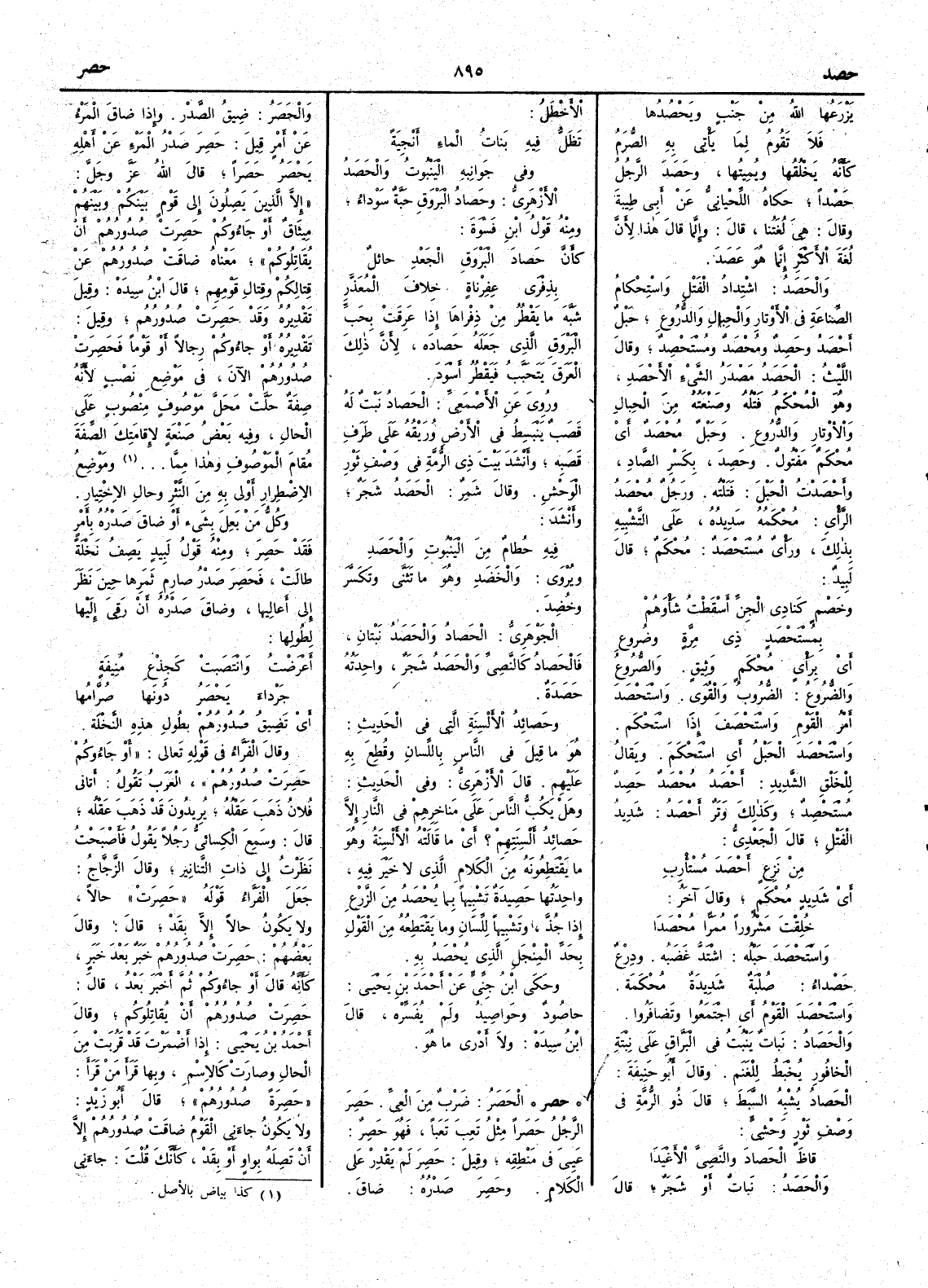 ( * قوله النثر هكذا في الأَصل ) وحال الاختيار وكل من بَعِلَ بشيءٍ أَو ضاق صدره بأَمر فقد حَصِرَ ومنه قول لبيد يصف نخلة طالت فحَصِرَ صدرُ صارِمِ ثمرها حين نظر إِلى أَعاليها وضاق صدره أَن رَقِيَ إِليها لطولها أَعْرَضْتُ وانْتَصَبَتْ كَجِذْع مُنِيفةٍ جَرْداءَ يَحْصَرُ دونَها صُرَّامُها أَي تضيق صدورهم بطول هذه النخلة وقال الفراء في قوله تعالى أَو جاؤوكم حَصِرَتْ صدورهم العرب تقول أَتاني فلان ذَهَبَ عَقْلُهُ يريدون قد ذهب عقله قال وسمع الكسائي رجلاً يقول فأَصبحتُ نظرتُ إِلى ذات التنانير وقال الزجاج جعل الفراء قوله حَصِرَتْ حالاً ولا يكون حالاً إِلاَّ بقد قال وقال بعضهم حَصِرَتْ صدورهم خبر بعد خبر كأَنه قال أَو جاؤوكم ثم أَخبر بعدُ قال حَصِرَتْ صدورهم أَن يقاتلوكم وقال أَحمد بن يحيى إِذا أَضمرت قد قرّبت من الحال وصارت كالاسم وبها قرأَ من قرأَ حَصِرَةً صُدورُهُمْ قال أَبو زيد ولا يكون جاءني القوم ضاقت صدورهم إِلاَّ أَن تصله بواو أَو بقد كأَنك قلت جاءني