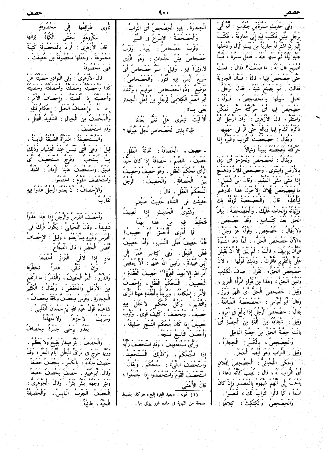 ( حصف ) الحَصافةُ ثَخانةُ العَقْل حَصُفَ بالضم حَصافةً إذا كان جَيِّدَ الرأْيِ مُحْكَم العقل وهو حَصِفٌ وحَصِيفٌ بَيِّنُ الحَصافةِ والحَصِيفُ الرجل المُحْكَمُ العقل قال حَدِيثُك في الشِّتاءِ حدِيثُ صَيْفٍ وشَتْوِيُّ الحَدِيثِ إذا تَصِيفُ فَتَخْلِطُ فيه مِن هذا بهذا فَما أَدْرِي أَأَحْمَقُ أَمْ حَصِيفُ ؟ فأَمّا حَصِفٌ فعلى النسَبِ وأَما حَصِيفٌ فعلى الفِعْل وفي كتاب عُمر إلى أَبي عُبيدة رضي اللّه عنهما أَن لا يُمْضِيَ أَمْرَ اللّهِ إلا بَعِيدَ الغِرَّةِ حَصِيفَ العُقدة الحَصِيفُ المُحكمُ العقل وإحْصافُ الأَمْرِ إحْكامُه ويريد بالعُقْدة ههنا الرأْيَ والتدْبير وكل مُحْكَم لا خَلَلَ فيه حَصِيفٌ ومُحْصَفٌ كثِيفٌ قويٌّ وثوب حَصِيفٌ إذا كان محكم النسج صَفِيقَه وأَحْصَفَ الناسِج نسْجَه ورأْيٌ مُسْتَحْصِفٌ وقد اسْتَحْصَفَ رأْيهُ إذا اسْتَحْكَم وكذلك المُسْتَحْصِدُ واسْتَحْصَفَ الشيءُ اسْتَحكَمَ ويقال اسْتَحْصَفَ القومُ واسْتَحْصَدُوا إذا اجتمعوا قال الأَعشى تأْوِي طَوائِفُها إلى مَحْصُوفةٍ مَكْروهةٍ يَخشَى الكُماةُ نِزالَها قال الأَزهري أَراد بالمَحْصُوفة كَتِيبَةً مجْمُوعة وجعلها مَحْصُوفةً من حُصِفتْ فهي مَحْصُوفةٌ قال الأَزهري وفي النوادر حَصَبْتُه عن كذا وأَحْصَبْتُه وحَصَفْتُه وأَحْصَفْتُه وحَصَيته وأَحْصَيتُه إذا أَقْصَيْتَه وإحْصافُ الأَمْرِ إحْكامُه وإحْصاف الحبلِ إحكامُ فَتْلِه والمُحْصَفُ من الحِبالِ الشَّدِيدُ الفَتْلِ وقد اسْتَحْصَفَ والمُسْتَحْصِفةُ المرأَة الضَّيِّقةُ اليابسةُ قيل وهي التي تَيْبَسُ عند الغِشْيانِ وذلك مما يُسْتَحَبُّ وفَرْجٌ مُسْتَحْصِفٌ أَي ضَيِّق واسْتَحَْصَفَ علينا الزمانُ اشتدّ واسْتَحْصَفَ القومُ اجتمعوا والإحْصافُ أَن يَعْدُوَ الرجلُ عَدْواً فيه تَقارُبٌ وأَحْصَفَ الفرسُ والرجلُ إذا عَدَا عَدْواً شديداً وقال اللحياني يكون ذلك في الفرس وغيره مما يعدو وقيل الإحْصافُ أَقْصَى الحُضْر قال العجاج ذارٍ إذا لاقَى العَزازَ أَحْصَفَا وإن تَلَقَّى غَدَراً تَخَطْرَفا والذَّرْوُ المَرُّ الخَفِيفُ والغَدَرُ ما ارْتَفَعَ من الأَرض وانْخَفَض ويقال الكثيرُ الحجارة وفرس مِحْصَفٌ وناقة مِحْصافٌ شاهِدُه قول عبد اللّه بن سمعان التَّغْلَبيّ وسَرَيْتُ لا جَزِعاً ولا مُتَهَلِّعاً يَعْدُو برَحْلي جَسْرةٌ مِحْصافُ والحَصَفُ بَثْرٌ صِغار يقِيحُ ولا يَعْظُم وربما خرج في مَراقِّ البَطْنِ أَيام الحرّ وقد حَصِفَ جِلده بالكسر يَحْصَفُ حَصَفاً وقال أَبو عبيد حَصِفَ يَحْصَفُ حَصَفاً وبَثِرَ وجهُه يَبْثَرُ بَثَراً وقال الجوهري الحَصَفُ الجَرَبُ اليابس والحصيفة الحيَّةُ طائيّة