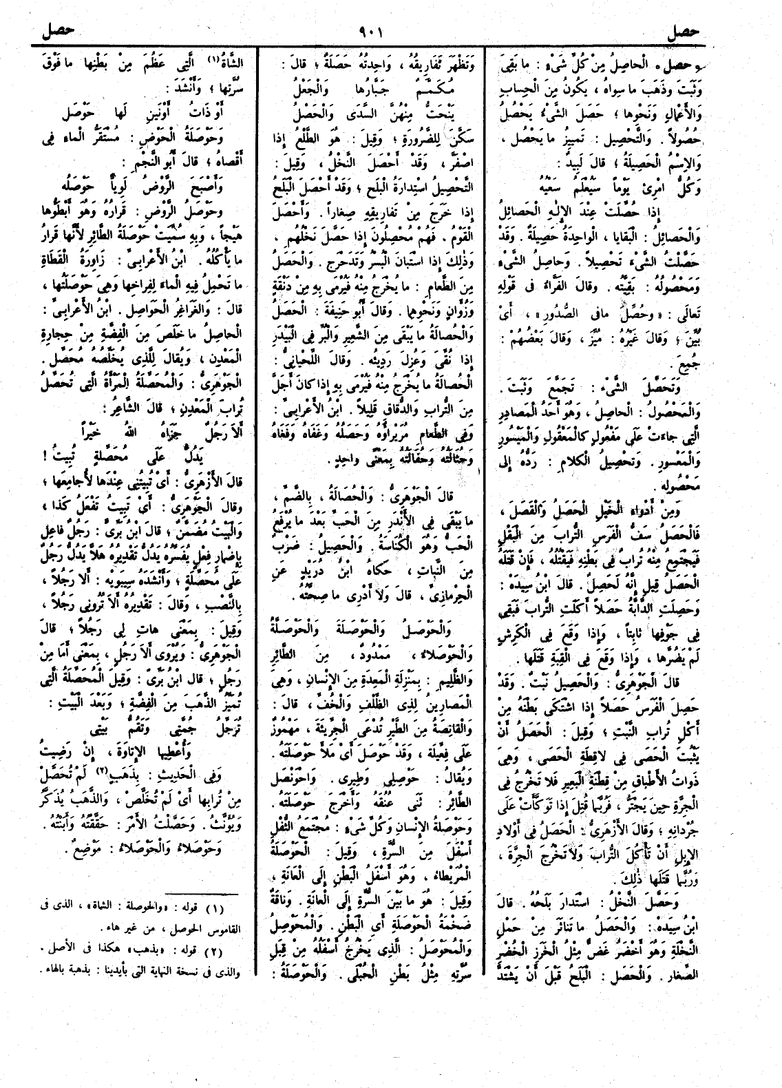 ( حصل ) الحاصِل من كل شيء ما بَقِي وثَبَتَ وذَهَب ما سواه يكون من الحِساب والأَعمال ونحوها حَصَل الشيءُ يَحْصُل حُصُولاً والتحصيل تمييز ما يَحْصُل والاسم الحَصِيلة قال لبيد وكُلُّ امرئ يوماً سَيُعْلَم سعيُه إِذا حُصِّلت عند الإِله الحَصائِل والحَصائل البَقايا الواحدة حَصِيلة وقد حَصَّلْتُ الشيء تحصيلاً وحاصِلُ الشيءِ ومَحْصُوله بَقِيَّتُه وقال الفراء في قوله تعالى وحُصِّل ما في الصدور أَي بُيِّن وقال غيره مُيِّز وقال بعضهم جُمِع وتَحَصَّل الشيءُ تَجَمَّع وثبت والمحصول الحاصل وهو أَحد المصادر التي جاءت على مفعول كالمَعْقُول والمَيْسُور والمَعْسور وتحصيل الكلام رَدُّه إِلى محصوله ومن أَدْواء الخَيْل الحَصَل والقَصَل فالحَصَل سفُّ الفرس الترابَ من البَقْل فيجتمع منه تراب في بطنه فيقتله فإِن قتله الحَصَل قيل إِنه لَحَصِلٌ قال ابن سيده وحَصِلَت الدابةُ حَصَلاً أَكلت التراب فبقي في جوفها ثابتاً وإِذا وقع في الكَرِش لم يضرها وإِذا وقع في القِبَة قتَلَها قال الجوهري والحَصِيل نَبْتٌ وقد حَصِل الفَرَسُ حَصَلاً إِذا اشتكى بطنه من أَكل تراب النَّبْت وقيل الحَصَل أَن يثبت الحَصَى في لاقِطَة الحصى وهي ذوات الأَطباق من قِطْنة البعير فلا تخرج في الجِرَّة حين يَجْتَرُّ فربما قُتِل إِذا تَوَكَّأْت على جُرْدانه وقال الأَزهري الحَصَل في أَولاد الإِبل أَن تأْكل التراب ولا تخرج الجِرَّة وربما قتلها ذلك وحَصَّل النخلُ استدار بَلَحُه قال ابن سيده والحَصَل ما تناثر من حَمْل النخلة وهو أَخضر غَضٌّ مثل الخَرَز الخُصْر الصِّغار والحَصَل البَلَح قبل أَن يشتد وتظهر تَفَاريقه واحدته حَصَلة قال مُكَمَّمٌ جَبّارُها والجَعْلُ يَنْحَتُّ منهن السَّدَى والحَصْلُ سكن للضرورة وقيل هو الطَّلْع إِذا اصفرَّ وقد أَحْصَل النخلُ وقيل التحصيل استدارة البلح وقد أَحْصَل البَلَحُ إِذا خَرَجَ من تفاريقه صغاراً وأَحْصَل القومُ فهم مُحْصِلون إِذا حَصَّل نَخْلُهم وذلك إِذا استبان البُسْر وتَدَحْرَج والحَصَل من الطعام ما يُخْرَج منه فيُرْمى به من دَنْقة وزؤَان ونحوهما وقال أَبو حنيفة الحَصَل والحُصالة ما يبقى من الشعير والبرّ في البَيْدَر إِذا نُقِّي وعُزِل رديئه وقال اللحياني الحُصالة ما يُخْرَج منه فيُرْمى به إِذا كان أَجَلَّ من التراب والدُّقاق قليلاً ابن الأَعرابي وفي الطعام مُرَيْراؤه وحَصَلُه وغَفَاه وفَغَاه وحُثَالته وحُفَالَته بمعنى واحد قال الجوهري والحُصَالة بالضم ما يبقى في الأَنْدَر من الحَبّ بعدما يُرْفَع الحَبُّ وهو الكُنَاسة والحَصِيل ضَرْب من النبات حكاه ابن دريد عن الحِرْمازي قال ولا أَدري ما صحته والحَوْصَل والحَوْصَلة والحَوْصَلَّة والحَوْصَلاء ممدود من الطائر والظَّلِيم بمنزلة المَعِدة من الإِنسان وهي المَصارين لذي الظِّلْف والخُفِّ قال والقانِصَة من الطير تُدْعَى الجِرِّيئة مهموز على فِعِّيلة وقد حَوْصَل أَي مَلأَ حَوْصَلته ويقال حَوْصِلي وطِيري واحْوَنْصَل الطائر ثَنَى عنقه وأَخرج حَوْصلته وحَوْصَلة الإِنسان وكلِّ شيء مُجْتَمَع الثُّفْل أَسفلَ من السُّرَّة وقيل الحَوْصَلة المُرَيْطاء وهو أَسفل البطن إِلى العانة وقيل هو ما بين السرة إِلى العانة وناقة ضَخْمة الحَوْصَلة أَي البطن والمُحَوْصِل والمُحَوْصَل الذي يَخْرج أَسفله من قِبَل سُرَّته مثل بطن الحُبْلى والحَوْصَلة الشاة التي عَظُم من بطنها ما فوق سُرَّتها وأَنشد أَو ذَات أَوْنَينِ لها حَوْصَل وحَوْصَلة الحوض مُسْتَقَرُّ الماء في أَقصاه قال أَبو النجم وأَصبح الروضُ لَوِيّاً حَوْصَلُه وحَوْصَلُ الروضِ قَرارُه وهو أَبطؤُها هَيْجاً وبه سميت حَوْصَلة الطائر لأَنها قرار ما يأْكله ابن الأَعرابي زَاوِرَةُ القَطَاة ما تَحْمِل فيه الماءَ لفِراخها وهي حَوْصَلتها قال والغَراغِر الحَواَصِل ابن الأَعرابي الحاصِل ما خَلَص من الفِضَّة من حجارة المَعْدِن ويقال للذي يُخَلِّصه مُحَصِّل ا