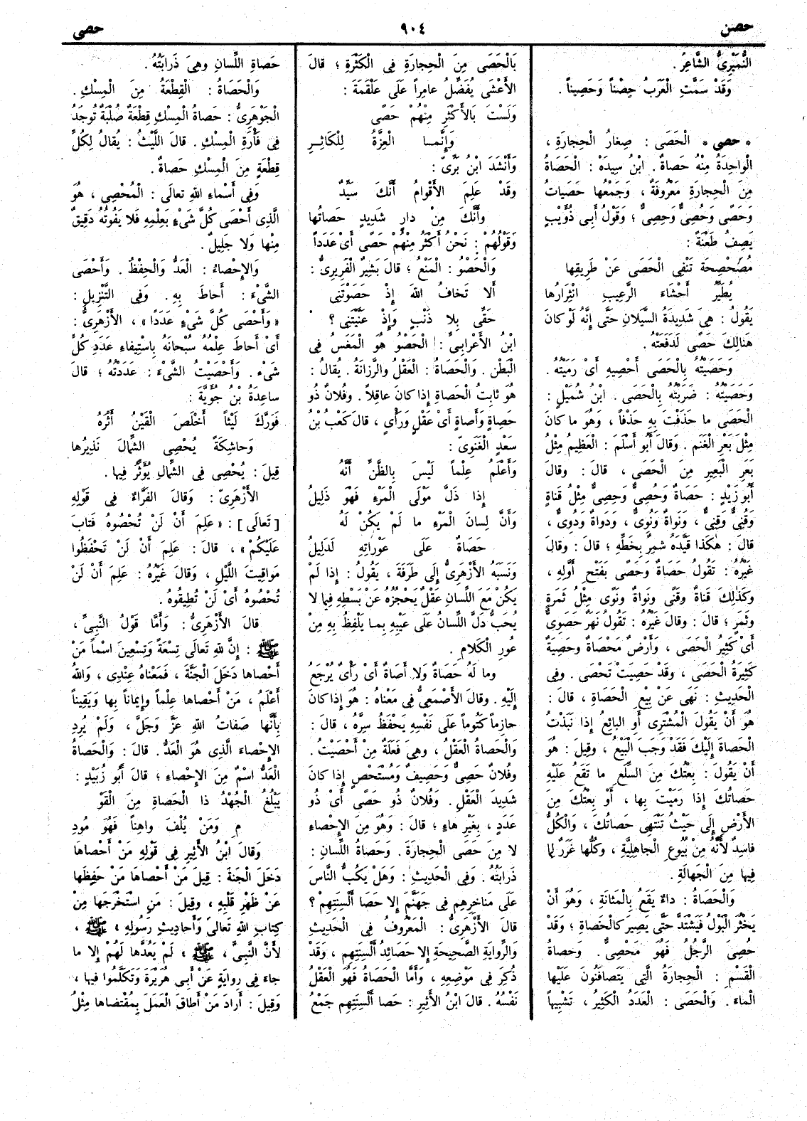 ( حصي ) الحَصَى صِغارُ الحجارة الواحدةُ منه حَصاة ابن سيده الحَصَاة من الحجارة معروفة وجمعها حَصَياتٌ وحَصىً وحُصِيٌّ وحِصِيٌّ وقول أَبي ذؤَيب يصف طَعْنَةً مُصَحْصِحَة تَنْفِي الحَصَى عن طَرِيقِها يُطَيِّر أَحْشاء الرَّعيبِ انْثِرَارُها يقول هي شديدة السَّيَلان حتى إنه لو كان هنالك حَصىً لدفعته وحَصَيْتُه بالحَصَى أَحْصِيه أَي رميته وحَصَيْتُه ضربته بالحَصَى ابن شميل الحَصَى ما حَذَفْتَ به حَذْفاً وهو ما كان مثلَ بعر الغنم وقال أَبو أَسلم العظيمُ مثلُ بَعَرِ البعير من الحَصَى قال وقال أَبو زيد حَصَاةٌ وحُصِيّ وحِصِيّ مثل قَناة وقُنِيّ وقِنِيّ ونَواة ونُوِيّ ودَواة ودُوِيّ قال هكذا قيده شمر بخطه قال وقال غيره تقول حَصَاة وحَصىً بفتح أَوله وكذلك قَناةٌ وقَنىً ونَواةٌ ونَوىً مثل ثَمَرة وثَمَر قال وقال غيره تقول نَهَرٌ حَصَوِيٌّ أَي كثير الحَصَى وأَرض مَحْصَاة وحَصِيَةٌ كثيرة الحَصَى وقد حَصِيَتْ تَحْصَى وفي الحديث نَهَى عن بَيْعِ الحَصَاة قال هو أَن يقول المشتري أَو البائع إذا نَبَذْتُ الحَصاةَ إليك فقد وَجَب البيعُ وقيل هو أَن يقول بِعْتُك من السِّلَع ما تَقَعُ عليه حَصاتُك إذا رميت بها أَو بِعْتُك من الأَرض إلى حيثُ تَنْتَهي حَصاتُك والكُلُّ فاسد لأَنه من بيوع الجاهلية وكلها غَرَرٌ لما فيها من الجَهالة والحَصَاةُ داءٌ يَقع بالمَثانة وهو أَن يَخْثُرَ البولُ فيشتدَّ حتى يصير كالحَصاة وقد حُصِيَ الرجلُ فهو مَحْصِيٌّ وحَصاةُ القَسْمِ الحِجارةُ التي يَتَصافَنُون عليها الماء والحَصَى العددُ الكثير تشبيهاً بالحَصَى من الحجارة في الكثرة قال الأَعشى يُفَضِّلُ عامراً على عَلْقمة ولَسْتَ بالأَكثرِ منهم حصىً وإنما العِزَّةُ للْكَاثِرِ وأَنشد ابن بري وقد عَلِمَ الأَقْوامُ أَنك سَيِّدٌ وأَنك منْ دارٍ شَديدٍ حَصاتُها وقولهم نحن أَكثر منهم حَصىً أَي عَدَداً والحَصْوُ المَنْع قال بَشِيرٌ الفَرِيرِيُّ أَلا تَخافُ اللهَ إذ حَصَوْتَنِي حَقِّي بلا ذَنْبٍ وإذْ عَنَّيْتَنِي ؟ ابن الأَعرابي الحَصْوُ هو المَغَسُ في البَطْن والحَصَاةُ العَقُْل والرَّزانَةُ يقال هو ثابت الحَصاةِ إذا كان عاقلاً وفلان ذو حَصاةٍ وأَصاةٍ أَي عقلٍ ورَأْيٍ قال كعب بن سَعْد الغَنَوي وأَعْلَم عِلْماً ليس بالظَّنِّ أَنَّه إذا ذَلَّ مَوْلَى المَرْءِ فهُوَ ذَلِيلُ وأَنَّ لِسانَ المَرْءِ ما لم يَكُنْ له حَصَاةٌ على عَوْراتِهِ لَدَلِىلُ ونسبه الأَزهري إلى طَرَفة يقول إذا لم يكن مع اللسان عقل يحجُزه عن بَسْطِه فيما لا يُحَبُّ دلَّ اللسان على عيبه بما يَلْفِظ به من عُورِ الكلام وما له حَصَاة ولا أَصَاة أَي رأْي يُرْجَع إليه وقال الأَصمعي في معناه هو إذا كان حازماً كَتُوماً على نفسه يحفَظ سرَّه قال والحَصَاة العَقْل وهي فَعَلة من أَحْصَيْت وفلان حَصِيٌّ وحَصِيفٌ ومُسْتَحْصٍ إذا كان شديد العقل وفلان ذو حَصىً أَي ذو عدَدٍ بغير هاءٍ قال وهو من الإحْصاء لا من حَصَى الحجارة وحَصاةُ اللِّسانِ ذَرابَتُه وفي الحديث وهل يَكُبُّ الناسَ على مَناخِرِهِم في جَهَنَّم إلاَّ حَصَا أَلْسِنَتِهِمْ ؟ قال الأَزهري المعروف في الحديث والرواية الصحيحة إلاَّ حَصَائِدُ أَلْسِنَتِهِم وقد ذكر في موضعه وأَما الحَصَاة فهو العقل نفسهُ قال ابن الأَثير حَصَا أَلْسِنَتِهِم جمعُ حَصاةِ اللِّسانِ وهي ذَرابَتُه والحَصَاةُ القِطْعة من المِسْك الجوهري حَصاةُ المِسْك قطعة صُلْبة توجد في فأْرة المِسْك قال الليث يقال لكل قطعة من المِسْك حَصاة وفي أَسماء الله تعالى المُحْصِي هو الذي أَحْصَى كلَّ شيءٍ بِعِلْمِه فلا يَفُوته دَقيق منها ولا جَليل والإحْصاءُ العَدُّ والحِفْظ وأَحْصَى الشيءَ أَحاطَ به وفي التنزيل وأَحْصَى كلَّ شيءٍ عدداً الأَزهري أي أَحاط علمه سبحانه باستيفاء عدد كلِّ شيء وأَحْصَيْت الشيءَ عَدَدته قال ساعدة بن جؤية فَوَرَّك لَيْثاً أَخْلَصَ القَيْنُ أَثْرَه حاشِكةً يُحْصِي الشِّمالَ نَذيرُ