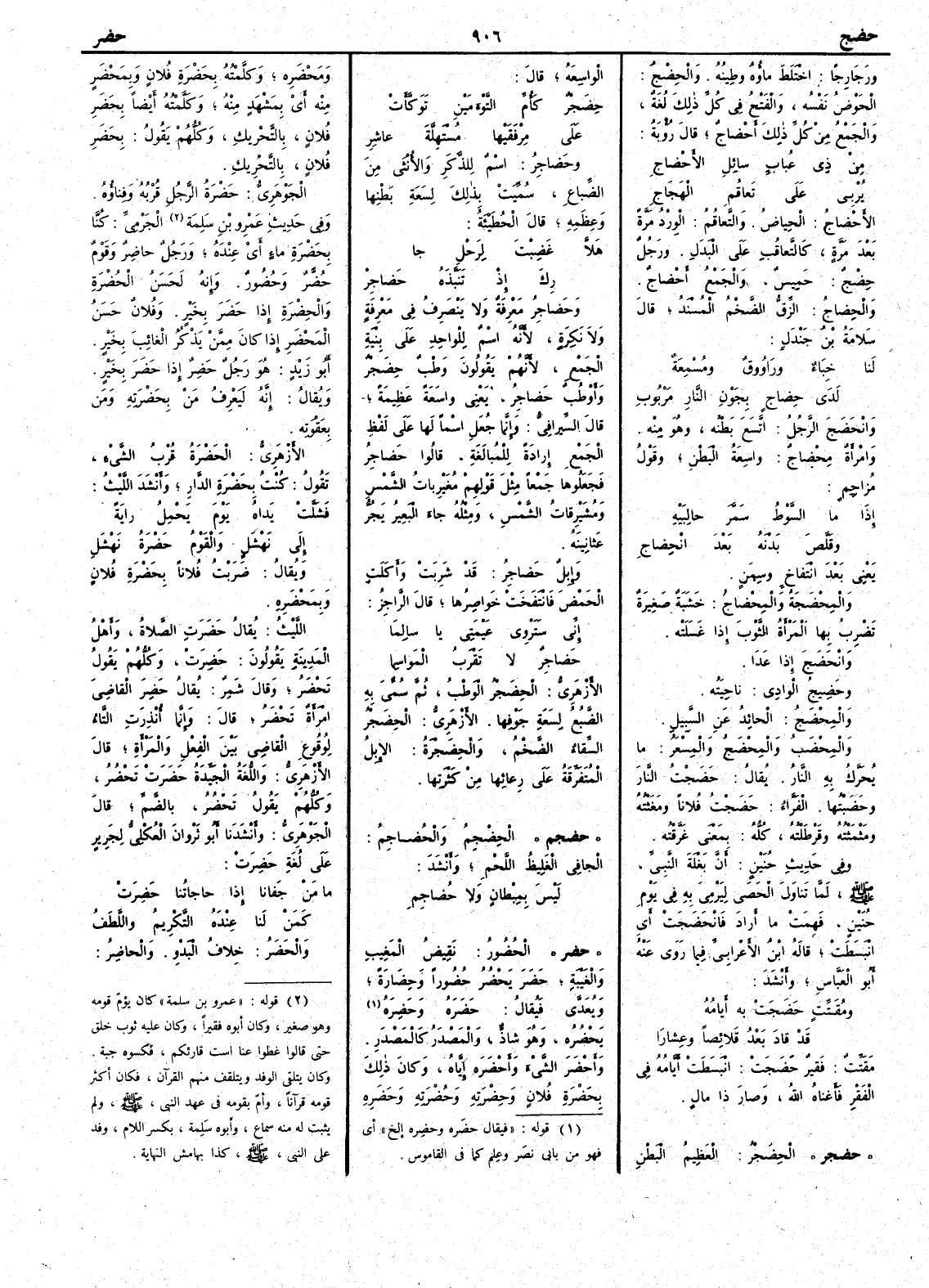 ( * قوله « عمرو بن سلمة » كان يؤمّ قومه وهو صغير وكان أبوه فقيراً وكان عليه ثوب خلق حتى قالوا غطوا عنا أست قارئكم فكسوه جبة وكان يتلقى الوفد ويتلقف منهم القرآن فكان أكثر قومه قرآناً وأَمَّ بقومه في عهد النبي صلى الله عليه وسلم ولم يثبت له منه سماع وأبوهسلمة بكسر اللام وفد على النبي صلى الله عليه وسلم كذا بهامش النهاية ) الجَرْمِيِّ كنا بِحَضْرَةِ ماءٍ أَي عنده ورجل خاصِرٌ وقوم حُضَّرٌ وحُضُورٌ وإِنه لحَسنُ الحُضْرَةِ والحِضْرَةِ إذا حَضَرَ بخير وفلان حَسَنُ المَحْضَرِ إِذا كان ممن يذكر الغئبَ بخير وأَبو زيد هو رجل حَضِرٌ إِذا حَضَرَ بخير ويقال إِنه لَيَعْرِفُ مَنْ بِحَضْرَتِهِ ومَنْ بِعَقْوَتِه الأَزهري الحَضْرَةُ قُرْبُ الشيء تقول كنتُ بِحَضْرَةِ الدار وأَنشد الليث فَشَلَّتْ يداه يومَ يَحْمِلُ رايَةً إِلى نَهْشَلٍ والقومُ حَضْرَة نَهْشَلِ ويقال ضربت فلاناً بِحَضُرَةِ فلان وبمَحْضَرِه الليث يقال حَضَرَتِ الصلاة وأَهل المدينة يقولون حَضِرَتْ وكلهم يقول تَحْضَرُ وقال شمر يقال حَضِرَ القاضِيَ امرأَةٌ تَحْضَرُ قال وإِنما أُنْدِرَتِ التاء لوقوع القاضي بين الفعل والمرأَة قال الأَزهري واللغة الجيدة حَضَرَتْ تَحْضُرُ وكلهم يقول تَحْضُرُ بالضم قال الجوهري وأَنشدنا أَبو ثَرْوانَ العُكْلِيُّ لجرير على لغة حَضِرَتْ ما مَنْ جَفانا إِذا حاجاتُنا حَضِرَتْ كَمَنْ لنا عندَه التَّكْريمُ واللَّطَفُ والحَضَرُ خلافُ البَدْوِ والحاضِرُ