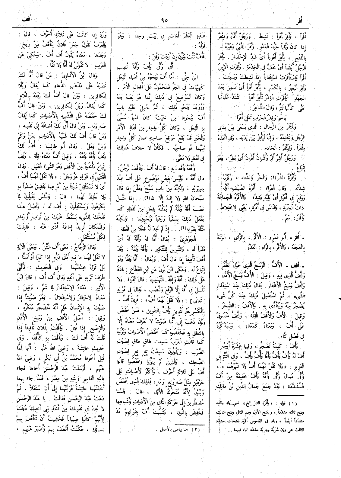 ( أفف ) الأُفُّ الوَسَخُ الذي حَوْلَ الظُّفُرِ والتُّفُّ الذي فيه وقيل الأُفُّ وسَخ الأُذن والتُّفُّ وسَخ الأَظفار يقال ذلك عند اسْتِقْذارِ الشيء ثم استعمل ذلك عند كل شيء يُضْجَرُ منه ويُتَأَذَّى به والأَفَفُ الضَّجَرُ وقيل الأُفُّ والأَفَف القِلة والتُّفُّ منسوق على أُفّ ومعناه كمعناه وسنذكره في فصل التاء وأُفّ كلمة تَضَجُّرٍ وفيها عشرة أَوجه أُفَّ له وأُفِّ وأُفُّ وأُفّاً وأُفٍّ وأُفٌّ وفي التنزيل العزيز ولا تَقُلْ لهما أُفٍّ ولا تَنْهَرْهُما وأُفِّي مُمالٌ وأُفَّى وأُفَّةٌ وأُفْ خفيفةً من أُفّ المشددة وقد جَمَعَ جمالُ الدِّين بن مالك هذه العشر لغات في بيت واحد وهو قوله فأُفَّ ثَلِّثْ ونَوِّنْ إن أَرَدْتَ وقُل أُفَّى وأُفِّي وأُفْ وأُفَّةً تُصِبِ ابن جني أَما أُفّ ونحوه من أَسماء الفِعْلِ كَهَيْهاتَ في الجَرّ فَمَحْمُولٌ على أَفعال الأَمر وكان الموضع في ذلك إنما هو لِصَهْ ومَهْ ورُوَيْد ونحو ذلك ثم حمل عليه باب أُف ونحوها من حيث كان اسماً سمي به الفعل وكان كل واحد من لفظ الأَمر والخبر قد يَقَعُ مَوْقِع صاحبِه صار كل واحد منهما هو صاحبه فكأَنْ لا خِلافَ هنالك في لفظ ولا معنًى وأَفَّفَه وأَفَّفَ به قال له أُف وتأَفَّفَ الرجلُ قال أُفَّةً وليس بفعل موضوع على أَفَّ عند سيبويه ولكنه من باب سَبَّحَ وهَلَّلَ إذا قال سبحان اللّه ولا إله إلا اللّه