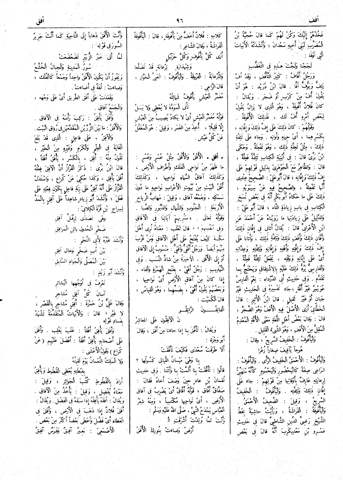 ( أفق ) الأُفْق والأُفُق مثل عُسْر وعسُر ما ظهر من نواحي الفَلَك وأَطراف الأَرض وكذلك آفاق السماء نواحيها وكذلك أُفْق البيت من بيوت الأَعراب نواحيه ما دون سَمْكه وجمعه آفاق وقيل مَهابُّ الرياح الأَربعة الجَنُوب والشَّمال والدَّبور والصَّبا وقوله تعالى سنُريهم آياتِنا في الآفاق وفي أَنفُسهم قال ثعلب معناه نُرِي أَهل مكة كيف يُفتح على أَهل الآفاق ومَن قرُب منهم أَيضاً ورجل أُفُقِيّ وأَفَقِيّ منسوب إلى الآفاق أَو إلى الأُفُق الأَخيرة من شاذّ النسب وفي التهذيب رجل أَفَقِيّ بفتح الهمزة والفاء إذا كان من آفاق الأَرض أَي نواحيها وبعضهم يقول أُفُقي بضمهما وهو القياس قال الكميت الفاتِقُون الراتِقُو ن الآفِقُون على المعاشِرْ ويقال تأَفَّق بنا إذا جاءنا من أُفُق وقال أَبو وَجْزة أَلا طَرَقَتْ سُعْدَى فكيْف تأَفَّقَتْ بنا وهي مَيْسانُ اللَّيالي كَسُولُها ؟ قالوا تأَفَّقت بنا أَلمَّت بنا وأَتَتْنا وفي حديث لقمان بن عاد حين وصف أَخاه فقال صَفّاقٌ أَفّاق قوله أَفَّاق أَي يضرب في آفاق الأَرض أَي نواحيها مُكْتَسِباً ومنه شعر العباس يمدح النبي صلى الله عليه وسلم وأَنتَ لمَّا وُلِدْتَ أَشْرَقَتِ ال أَرضُ وضاءتْ بنُورِكَ الأُفُقُ وأَنَّث الأُفق ذهاباً إلى الناحية كما أَنث جرير السور في قوله لما أَتى خَبَرُ الزُّبَيْرِ تَضَعْضَعَتْ سُور المَدينةِ والجبالُ الخُشَّعُ ويجوز أَن يكون الأُفُقُ واحداً وجمعاً كالفُلْك وضاءت لغة في أَضاءت وقعدت على أَفَق الطريق أَي على وجهه والجمع آفاق وأَفَق يأْفِق ركب رأْسَه في الآفاق والأُفُق ما بين الزِّرَّيْنِ المقدَّمين في رُواق البيت والآفِق على فاعل الذي قد بلغ الغاية في العلم والكرم وغيره من الخير تقول منه أَفِق بالكسر يأْفَقُ أَفَقاً قال ابن بري ذكر القَزّاز أَنّ الآفِق فعله أَفَق يأْفِق وكذا حكي عن كراع واستدل القزاز على أَنه آفِق على زنة فاعِل بكون فعله على فَعَلَ وأَنشد أَبو زياد شاهداً على آفق بالمد لسراج بن قُرَّةَ الكلابي وهي تَصَدَّى لِرِفَلٍّ آفِقِ ضَخْمِ الحُدولِ بائنِ المَرافِقِ وأَنشد غيره لأَبي النجم بين أَبٍ ضَخْمٍ وخالٍ آفِقِ بين المُصَلّي والجَوادِ السابِقِ وأَنشد أَبو زيد تَعْرِفُ في أَوْجُهِها البَشائرِ آسانَ كلِّ آفِقٍ مُشاجِرِ وقال عليّ بن حمزة أَفِق مُشاجر بالقصر لا غير قال والأَبيات المتقدّمة تشهد بفساد قوله وأَفَقَ يأْفِق أَفْقاً غلَب يغلِب وأَفَق على أَصحابه يأْفِق أَفْقاً أَفضلَ عليهم عن كراع وقول الأَعشى ولا المَلِكُ النُّعْمانُ يومَ لَقِيتُه بغِبْطَتِه يُعْطِي القُطوطَ ويأْفِقُ أَراد بالقُطوط كتب الجوائز وقيل معناه يُفْضِل وقيل يأْخذ من الآفاق ويقال أَفَقَه يأْفِقُه إذا سبَقَه في الفضل ويقال أَفَقَ فلان إذا ذهب في الأَرض وأَفَق في العَطاء أَي فَضَّل وأَعطى بعضاً أَكثر من بعض الأَصمعي بعير آفِق وفرس آفِق
