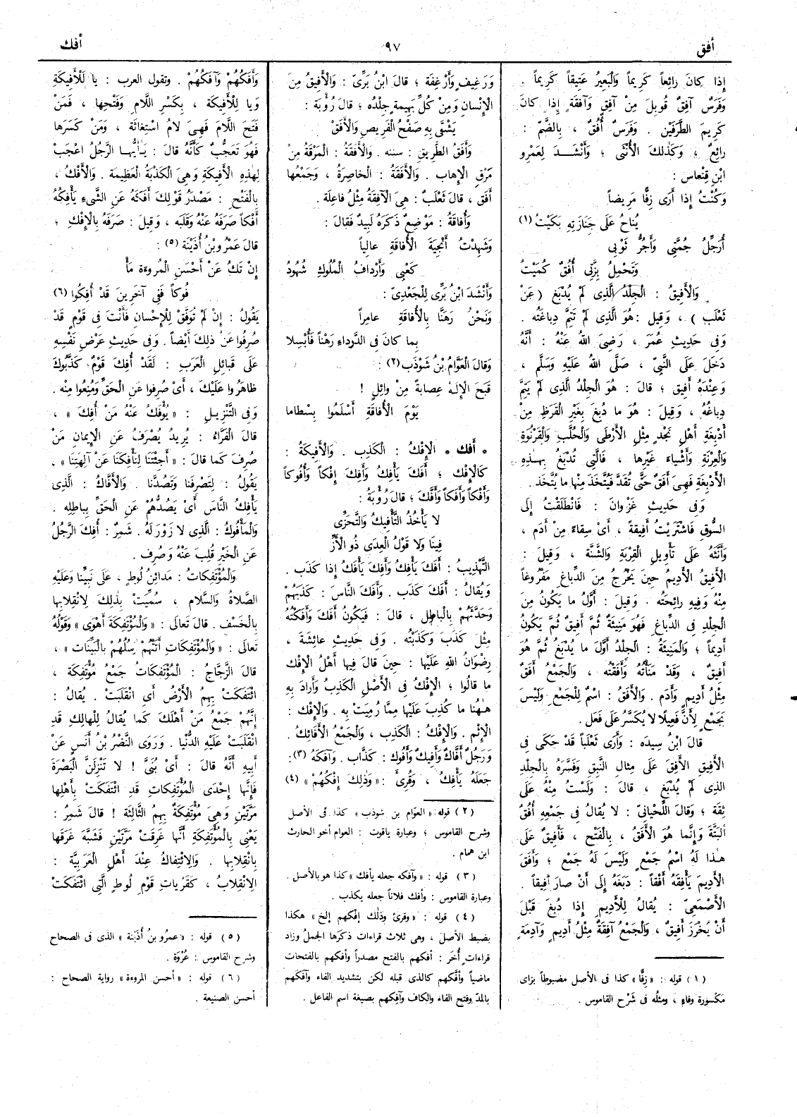 ( * قوله « وقرئ وذلك إفكهم إلخ » هكذا بضبط الأصل وهي ثلاث قراءات ذكرها الجمل وزاد قراءات أخر أفكهم بالفتح مصدراً وأفكهم بالفتحات ماضياً وأفكهم كالذي قبله لكن بتشديد الفاء وآفكهم بالمد وفتح الفاء والكاف وآفكهم بصيغة اسم الفاعل ) وأَفَكُهُمْ وآفَكُهُمْ وتقول العرب يا لَلأَفِيكةِ ويا لِلأَفِيكة بكسر اللام وفتحها فمن فتح اللام فهي لام استغاثة ومن كسرها فهو تعجب كأَنه قال يا أَيها الرجل اعجب لهذه الأَفيكة وهي الكَذْبة العظيمة والأَفْكُ بالفتح مصدر قولك أَفَكَهُعن الشيء يَأْفِكُه أَفْكاً صرفه عنه وقلبه وقيل صرفه بالإِفك قال عمرو بن أُذينة