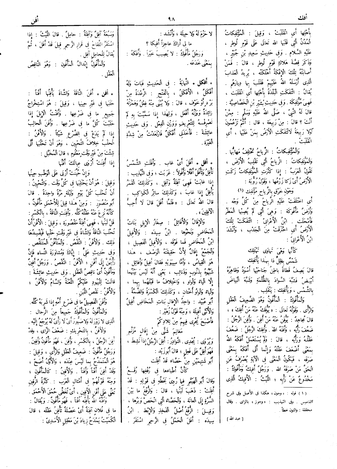 ( أفن ) أَفَنَ الناقةَ والشاةَ يأْفِنُها أَفْناً حلَبها في غير حينها وقيل هو استخراجُ جميع ما في ضرعها وأَفَنْتُ الإبلَ إذا حلَبْتَ كلَّ ما في ضرعها وأَفَنَ الحالبُ إذا لم يدَعْ في الضَّرْع شيئاً والأَفْنُ الحَلْب خلاف التَّحْيين وهو أَن تَحْلُبَها أَنَّى شئتَ من غير وقت معلوم قال المُخبَّل إذا أُفِنَتْ أَرْوَى عِيالَك أَفْنُها وإن حُيّنَت أَرْبى على الوَطْبِ حِينُها وقيل هو أَن يحتَلِبها في كل وقت والتَّحْيِينُ أَن تُحْلَب كل يوم وليلة مرة واحدة قال أَبو منصور ومِن هذا قيل للأحمق مأْفونٌ كأَنه نُزِع عنه عقلُه كلُّه وأَفِنَت الناقةُ بالكسر قلَّ لبنُها فهي أَفِنةٌ مقصورة وقيل الأَفْنُ أَن تُحْلَبَ الناقةُ والشاةُ في غير وقت حَلْبِها فيفسدها ذلك والأَفْنُ النقصُ والمُتأَفِّنُ المُتنقِّص وفي حديث عليّ إيّاكَ ومُشاوَرَةَ النساء فإن رأْيَهنّ إلى أَفْنٍ الأَفْنُ النقصُ ورجل أَفينٌ ومأْفونٌ أَي ناقصُ العقلِ وفي حديث عائشة قالت لليهود عليكم اللعنةُ والسامُ والأََفْنُ والأفْنُ نقصُ اللبَنِ وأَفَنَ الفصيلُ ما في ضرع أُمِّه إذا شرِبَه كلَّه والمأْفونُ والمأْفوكُ جميعاً من الرجال الذي لا زَوْرَ له ولا صَيُّورَ أَي لا رأْيَ له يُرْجَعُ إليه والأَفَنُ بالتحريك ضعفُ الرأْي وقد أَفِنَ الرجلُ بالكسر وأُفِنَ فهو مأْفونٌ وأَفينٌ ورجل مأْفونٌ ضعيفُ العقلِ والرأْيِ وقيل هو المُتمدِّحُ بما ليس عنده والأَول أَصح وقد أفِنَ أَفْناً وأَفَناً والأفينُ كالمأْفونِ ومنه قولهم في أَمثال العرب كثرةُ الرِّقين تُعَفِّي على أََفْنِ الأََفِين أَي تُغطِّي حُمْقَ الأَحْمَق وأَفَنَه الله يأْفِنُه أَفْناً فهو مأْفونٌ ويقال ما في فلان آفِنةٌ أَي خصلة تأْفِنُ عقلَه قال الكميت يمدح زياد بن مَعْقِل الأَسديّ