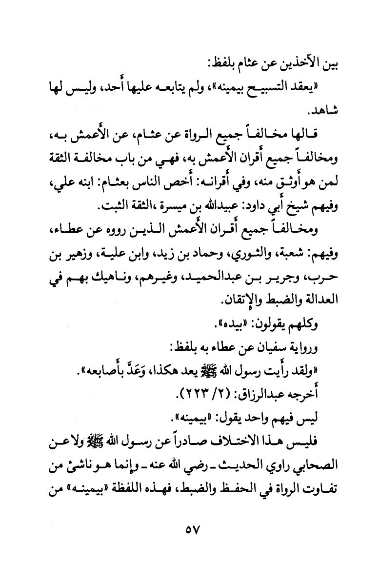 بين الآخرين عن عثام بلفظ: «يعقد التسبيح بيمينه» , ولم يتابعه عليها أَحد, وليس لها شاهد.
