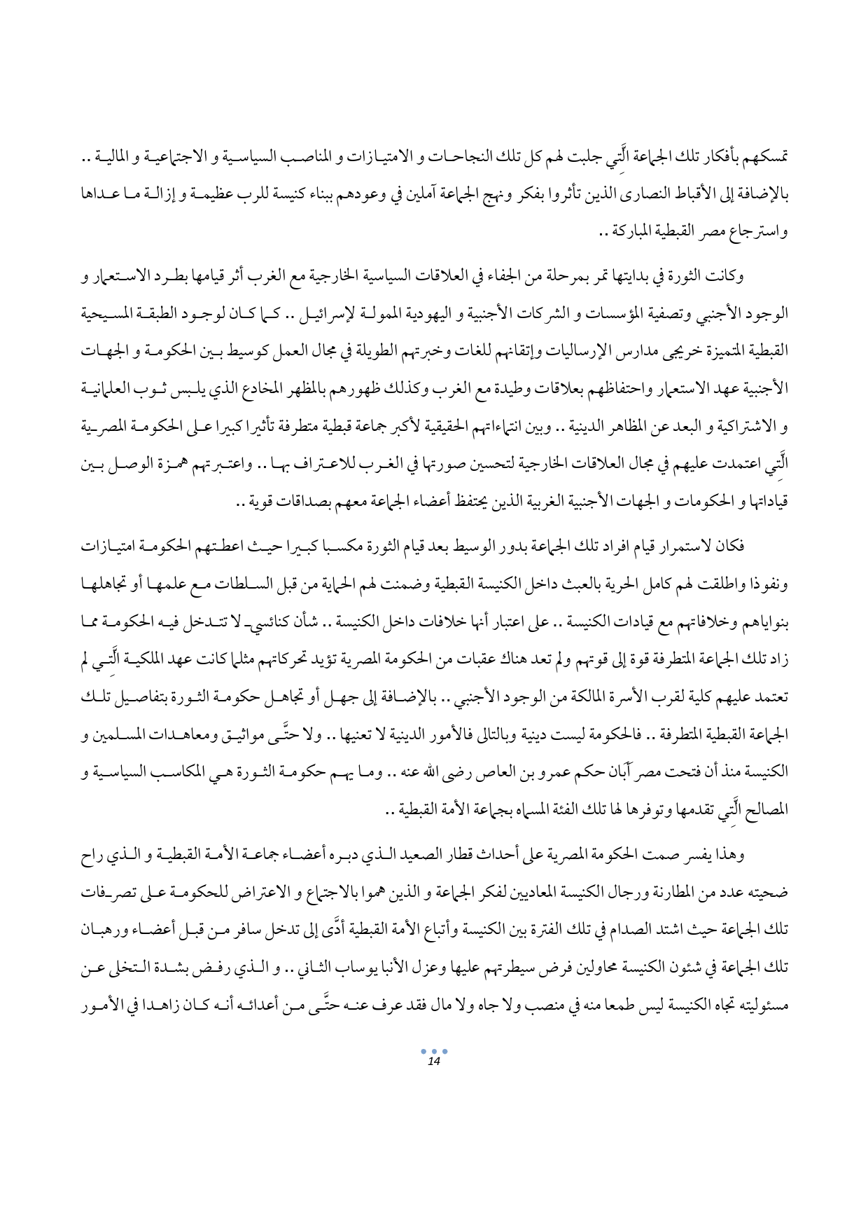 فكان لاستمرار قيام افراد تلك الجماعة بدور الوسيط بعد قيام الثورة مكسبا كبيرا حيث اعطتهم الحكومة امتيازات ونفوذا واطلقت لهم كامل الحرية بالعبث داخل الكنيسة القبطية وضمنت لهم الحماية من قبل السلطات مع علمها أو تجاهلها بنواياهم وخلافاتهم مع قيادات الكنيسة .. على اعتبار أنها خلافات داخل الكنيسة .. شأن كنائسي لا تتدخل فيه الحكومة مما زاد تلك الجماعة المتطرفة قوة إلى قوتهم ولم تعد هناك عقبات من الحكومة المصرية تؤيد تحركاتهم مثلما كانت عهد الملكية الَّتِي لم تعتمد عليهم كلية لقرب الأسرة المالكة من الوجود الأجنبي .. بالإضافة إلى جهل أو تجاهل حكومة الثورة بتفاصيل تلك الجماعة القبطية المتطرفة .. فالحكومة ليست دينية وبالتالى فالأمور الدينية لا تعنيها .. ولا حتَّى مواثيق ومعاهدات المسلمين والكنيسة منذ أن فتحت مصر أَبَان حكم عمرو بن العاص رضى الله عنه .. وما يهم حكومة الثورة هي المكاسب السياسية والمصالح الَّتِي تقدمها وتوفرها لها تلك الفئة المسماه بجماعة الأمة القبطية ..