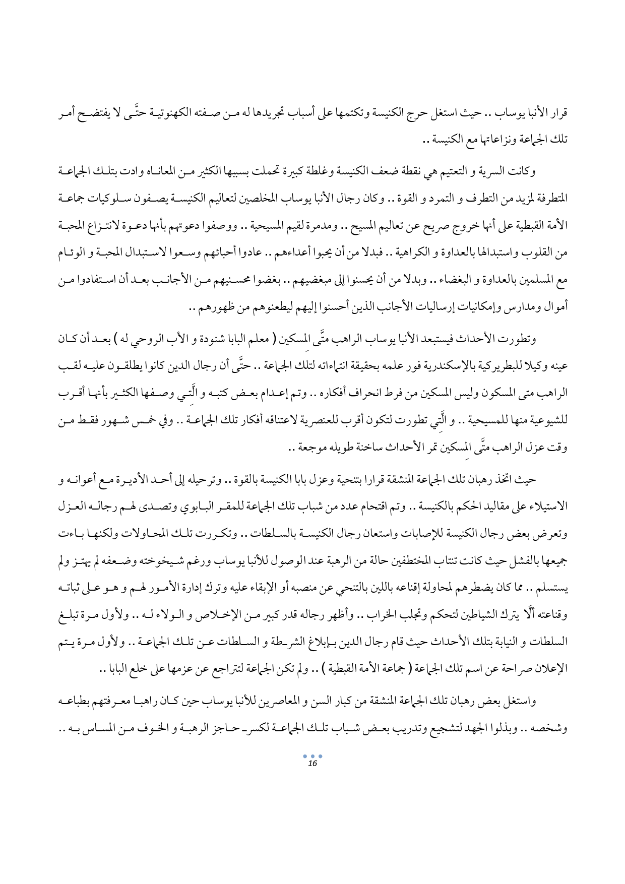 قرار الأنبا يوساب .. حيث استغل حرج الكنيسة وتكتمها على أسباب تجريدها له من صفته الكهنوتية حتَّى لا يفتضح أمر تلك الجماعة ونزاعاتها مع الكنيسة ..